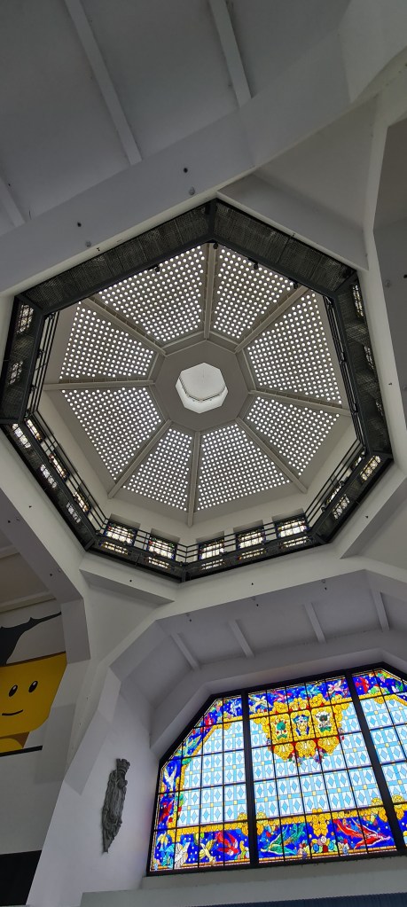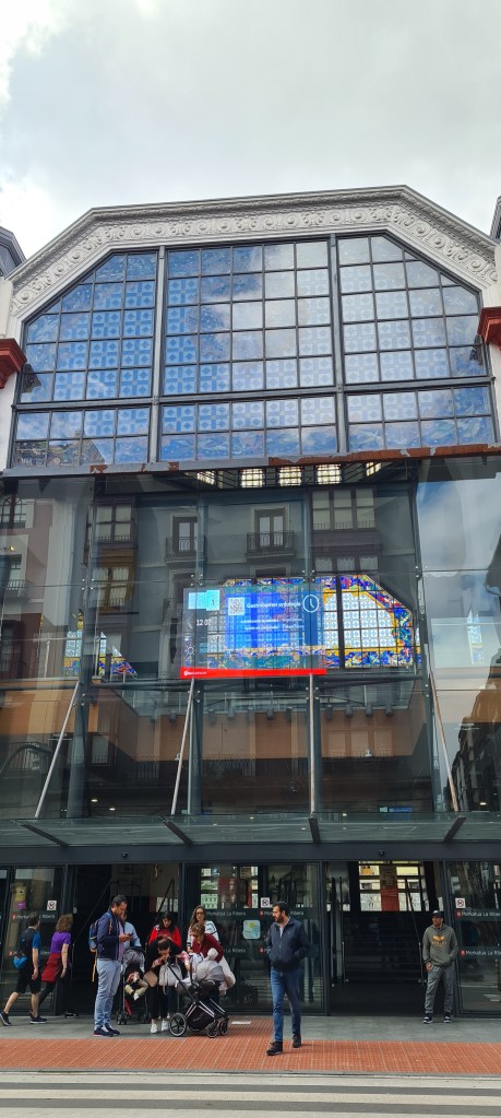 Entramos en el Mercado de la Ribera, el mercado cubierto más grande de Europa. La guía nos cuenta su historia diciendo que ocupa el mismo lugar desde el siglo XIV, donde se celebraba el mercado semanal de Bilbao, convirtiéndose en el corazón comercial de la villa. En 1929, cuando el arquitecto Pedro Ispizua (el mismo que el del Kiosco del Arenal), levantó un edificio moderno para su época: funcional, monumental y pensado para la vida urbana de un Bilbao en plena expansión. Su estructura sin columnas interiores, la importancia de la luz natural y la amplitud de sus espacios marcaron un antes y un después en la arquitectura de los mercados europeos.