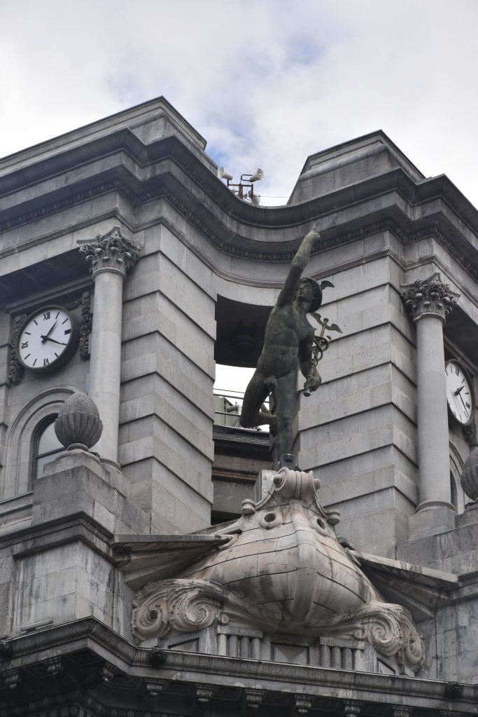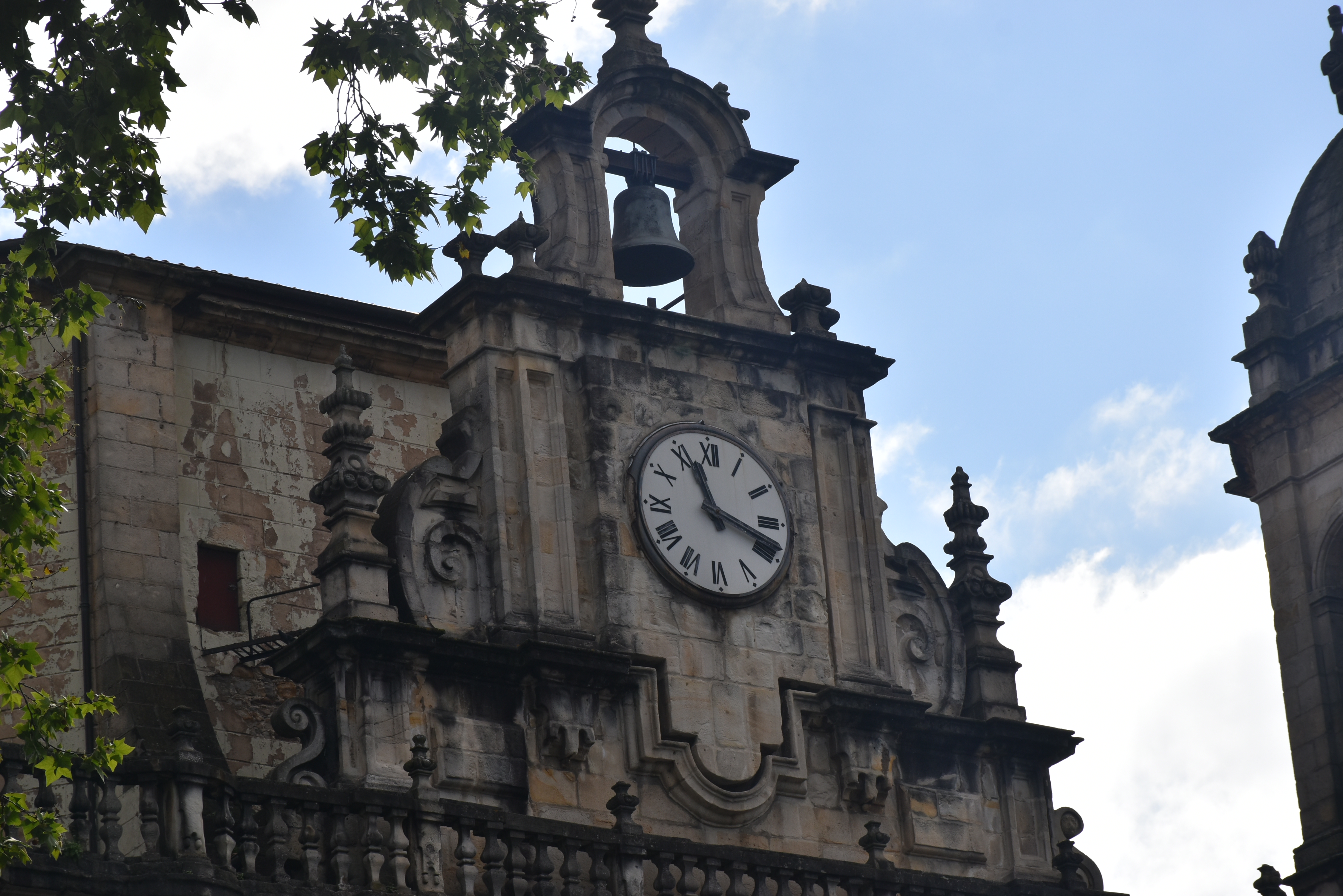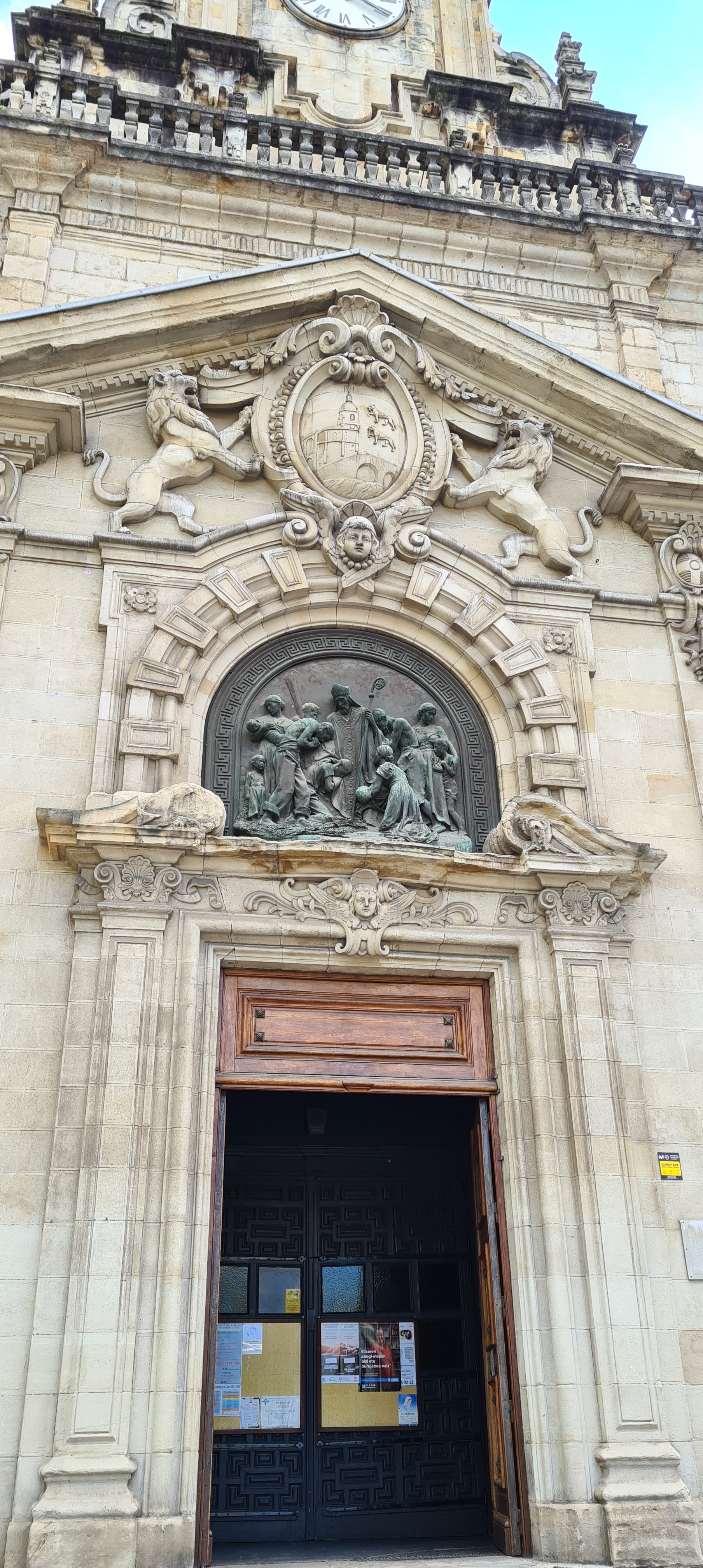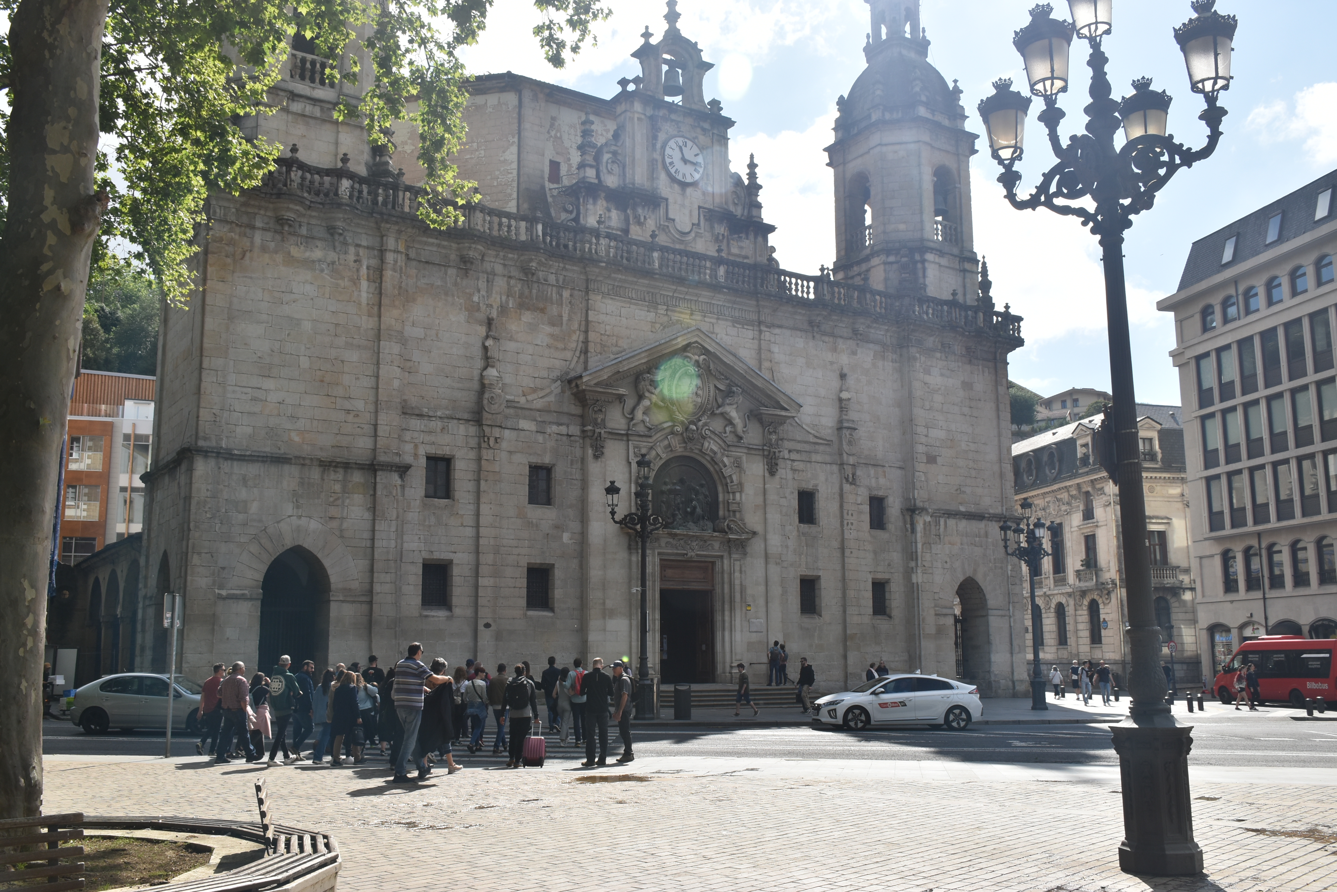 Nos cuenta un poco el guía sobre el exterior de la iglesia Nicolás de Bari, (nosotros la visitaremos por la tarde con más detalle, pero lo cuento aquí). Su fachada barroca fue levantada en el siglo XVIII, combinando líneas curvas y una cuidada simetría. Tiene dos torres gemelas que le dan un gran aire monumental. Es un templo de gran importancia para los marineros bilbaínos que llegaban a ella para pedir protección antes de salir al mar.
