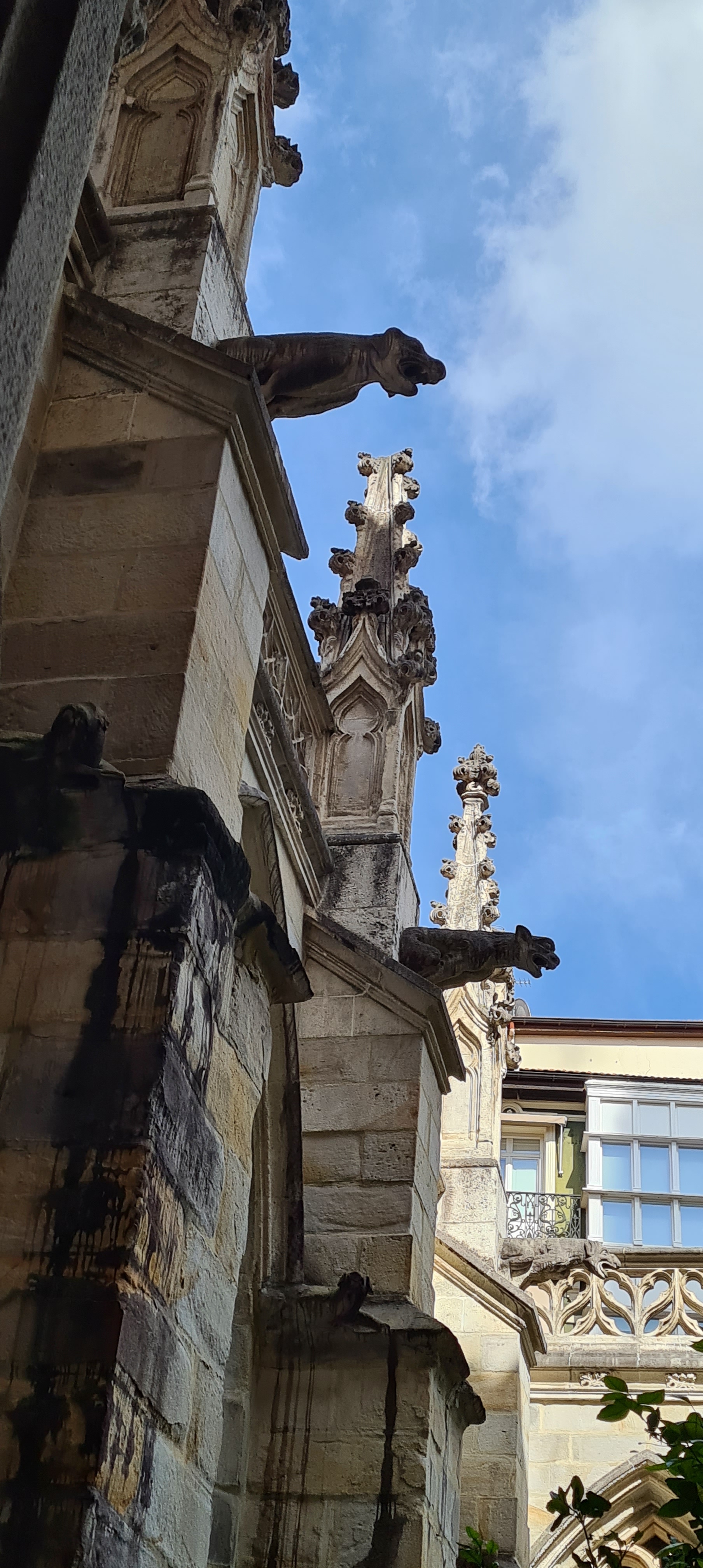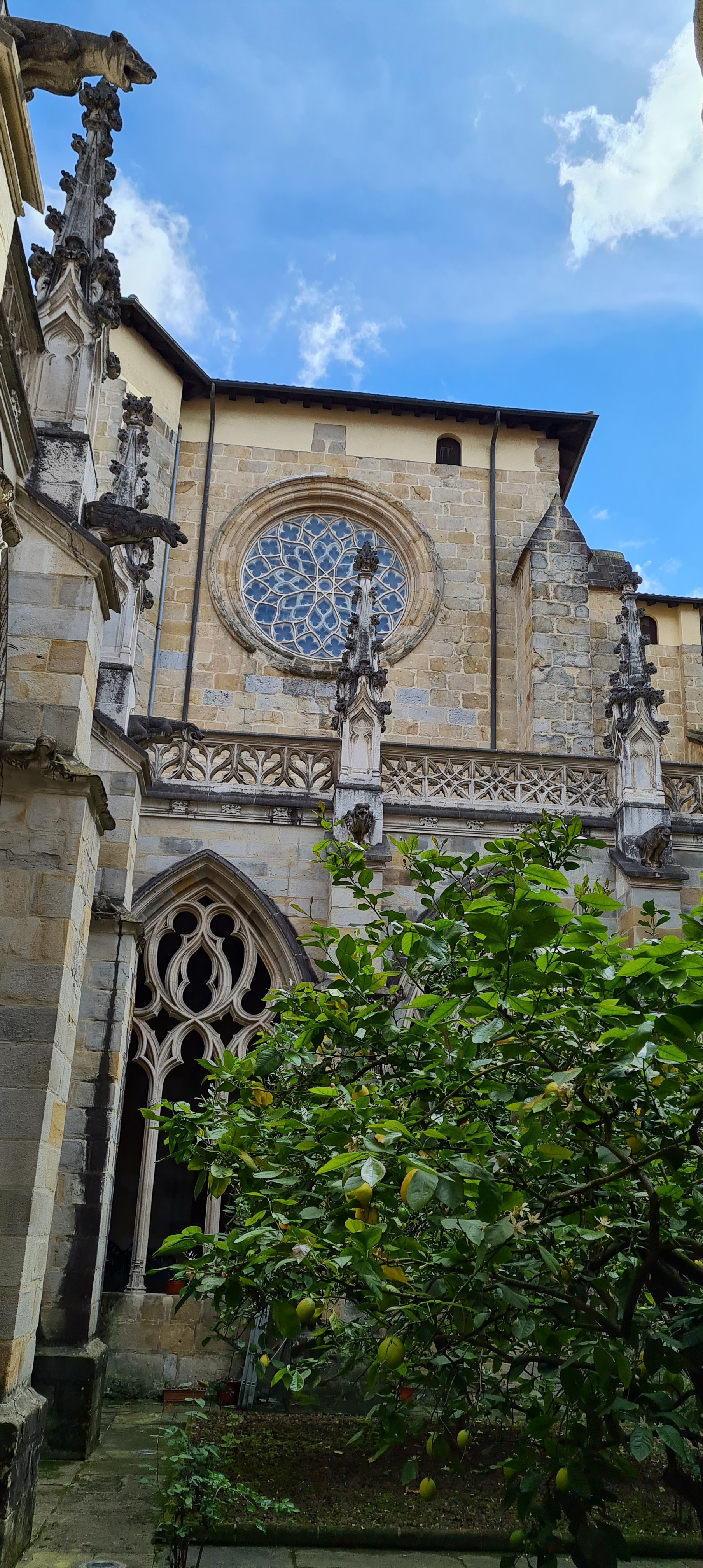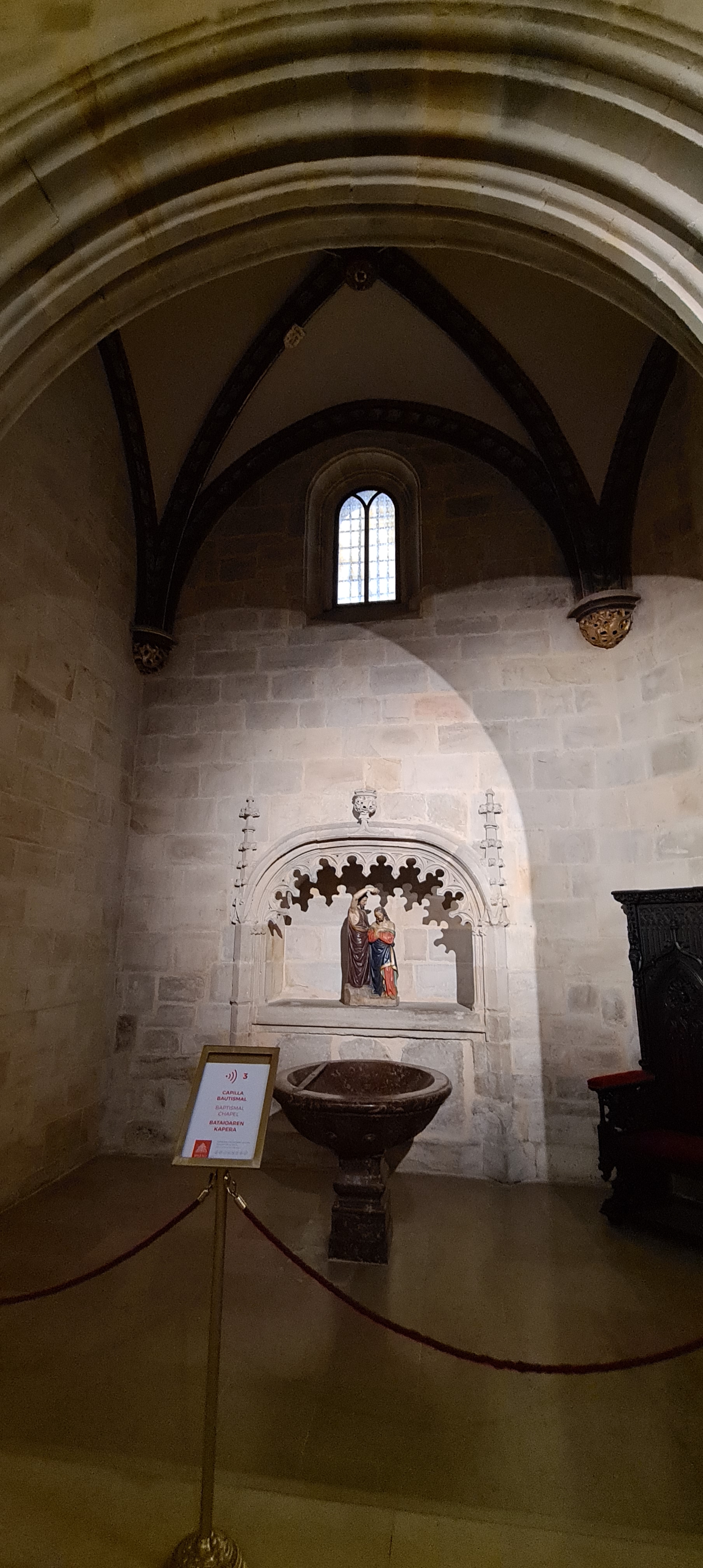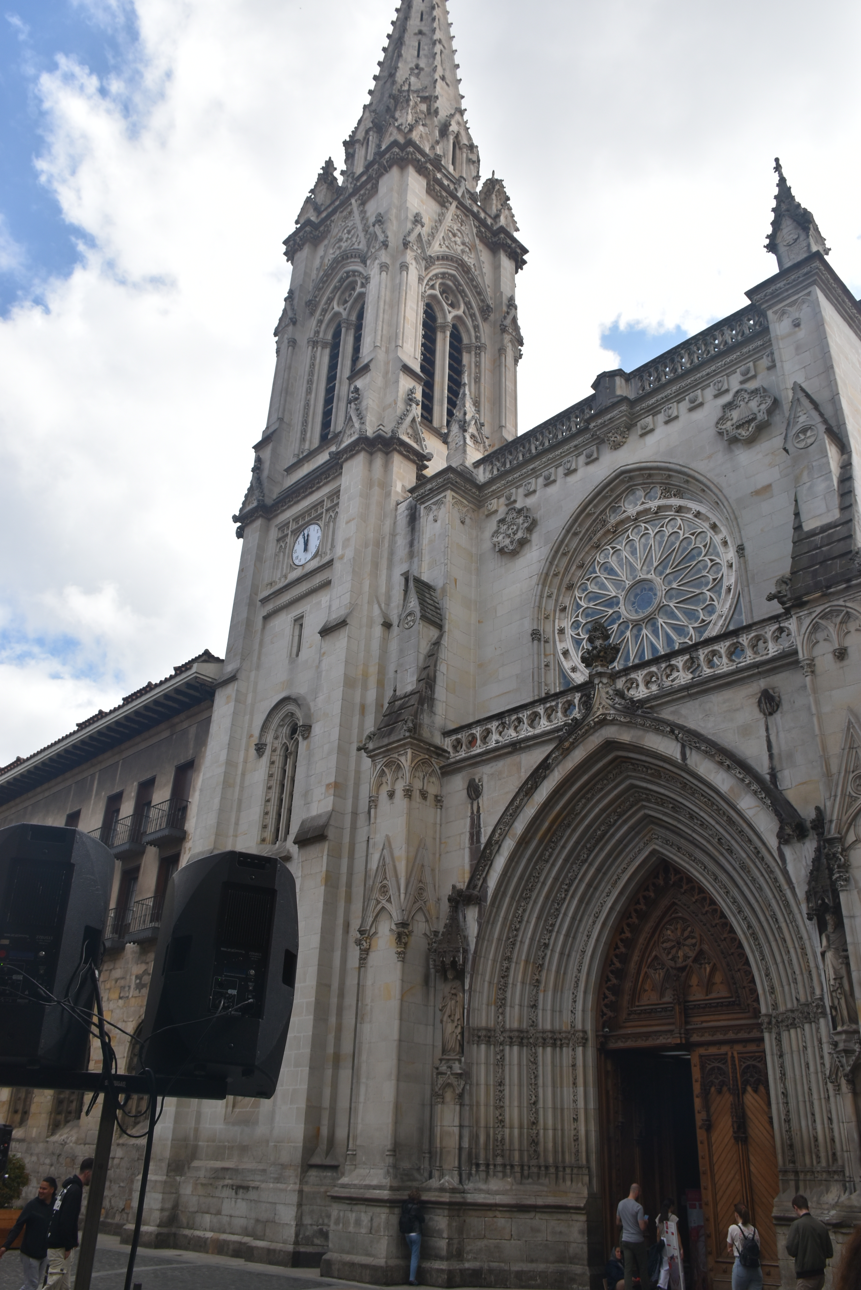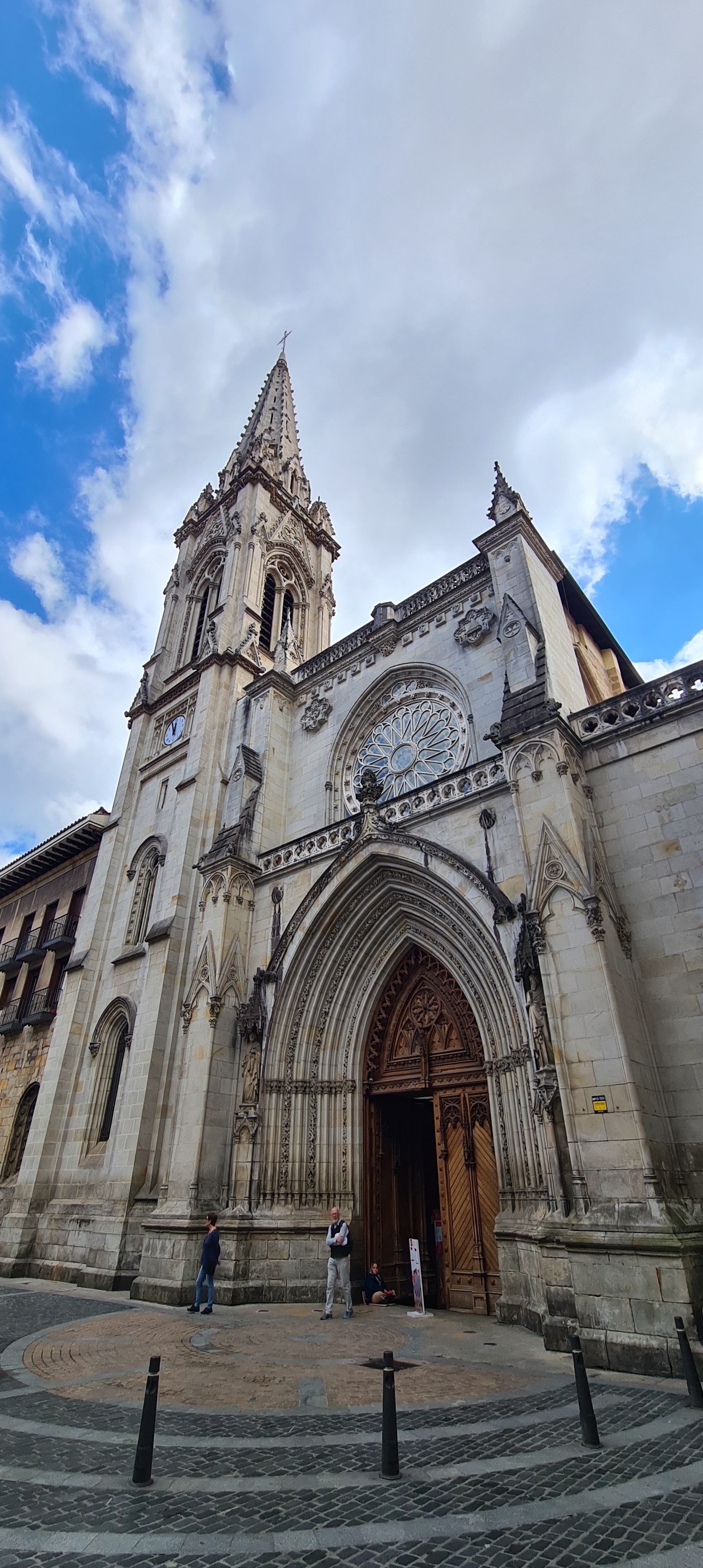 Así llegamos a la Catedral de Bilbao, dedicada a Santiago. Impone con su silueta gótica, elegante y afilada, en pleno Casco Viejo. Su torre, visible desde varias calles del entorno, es como un faro urbano que guía al visitante hacia la plaza. La fachada combina la verticalidad típica del gótico con detalles delicados en piedra, arcos apuntados y un rosetón que anticipa la belleza que guarda dentro.