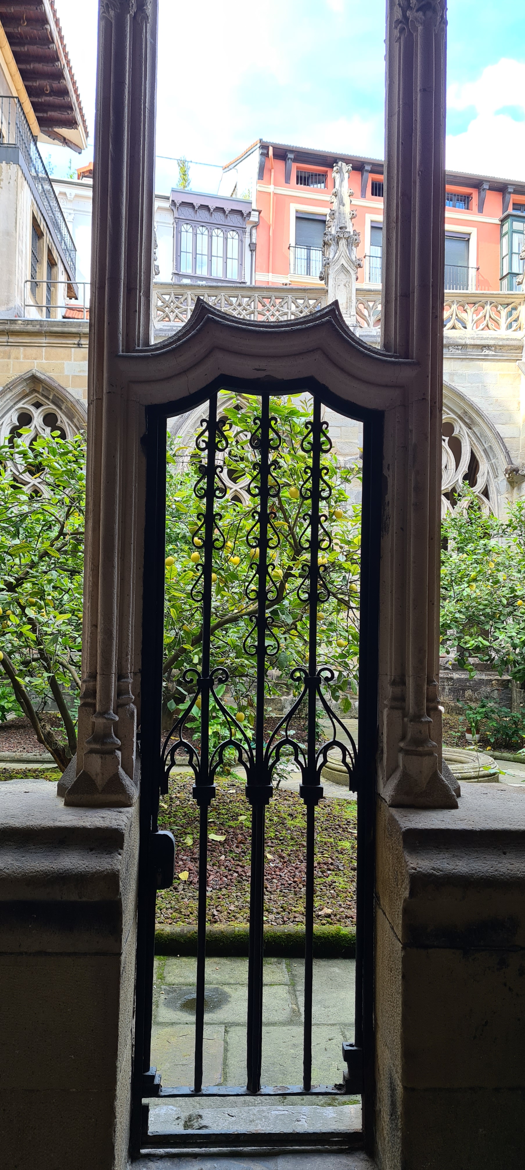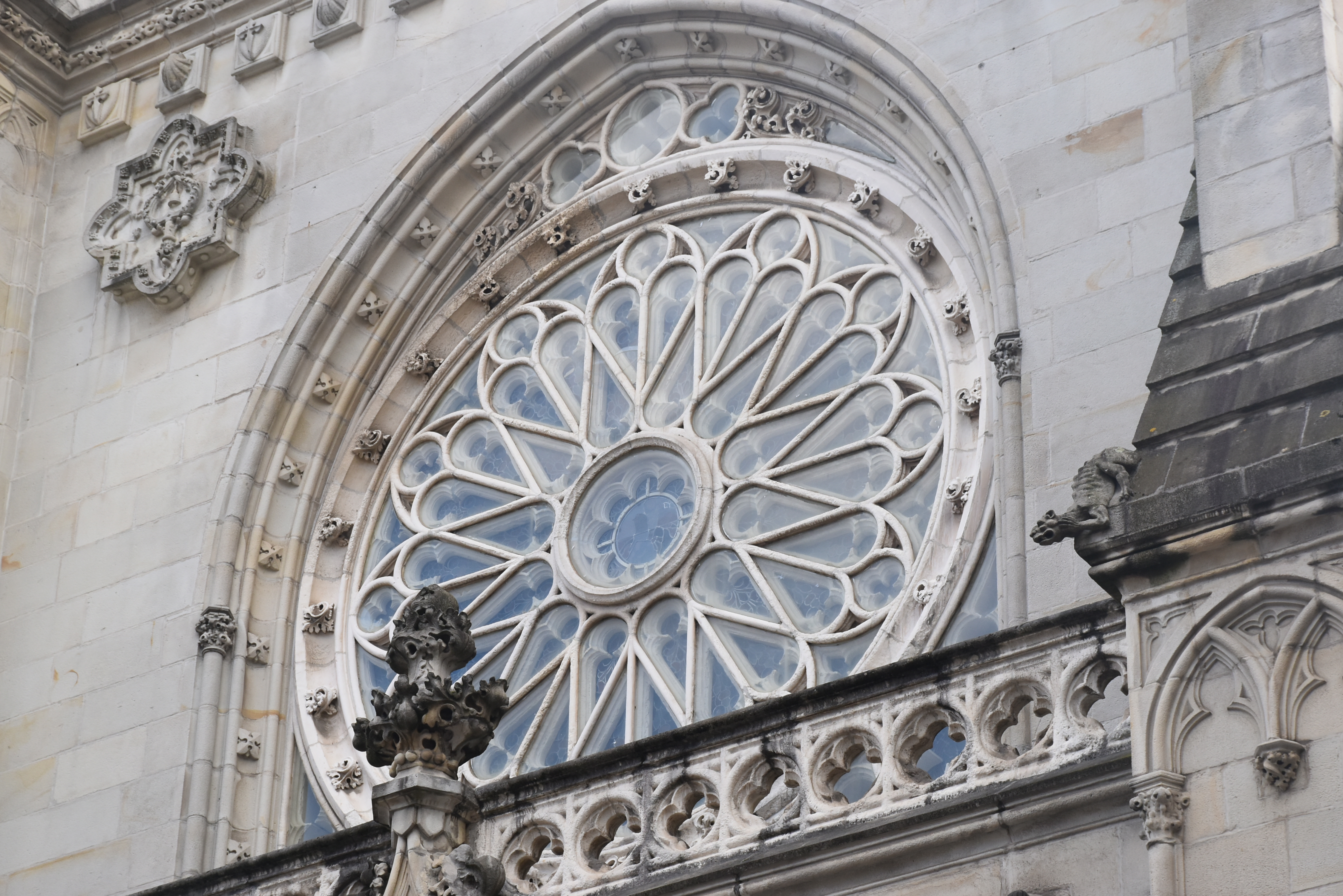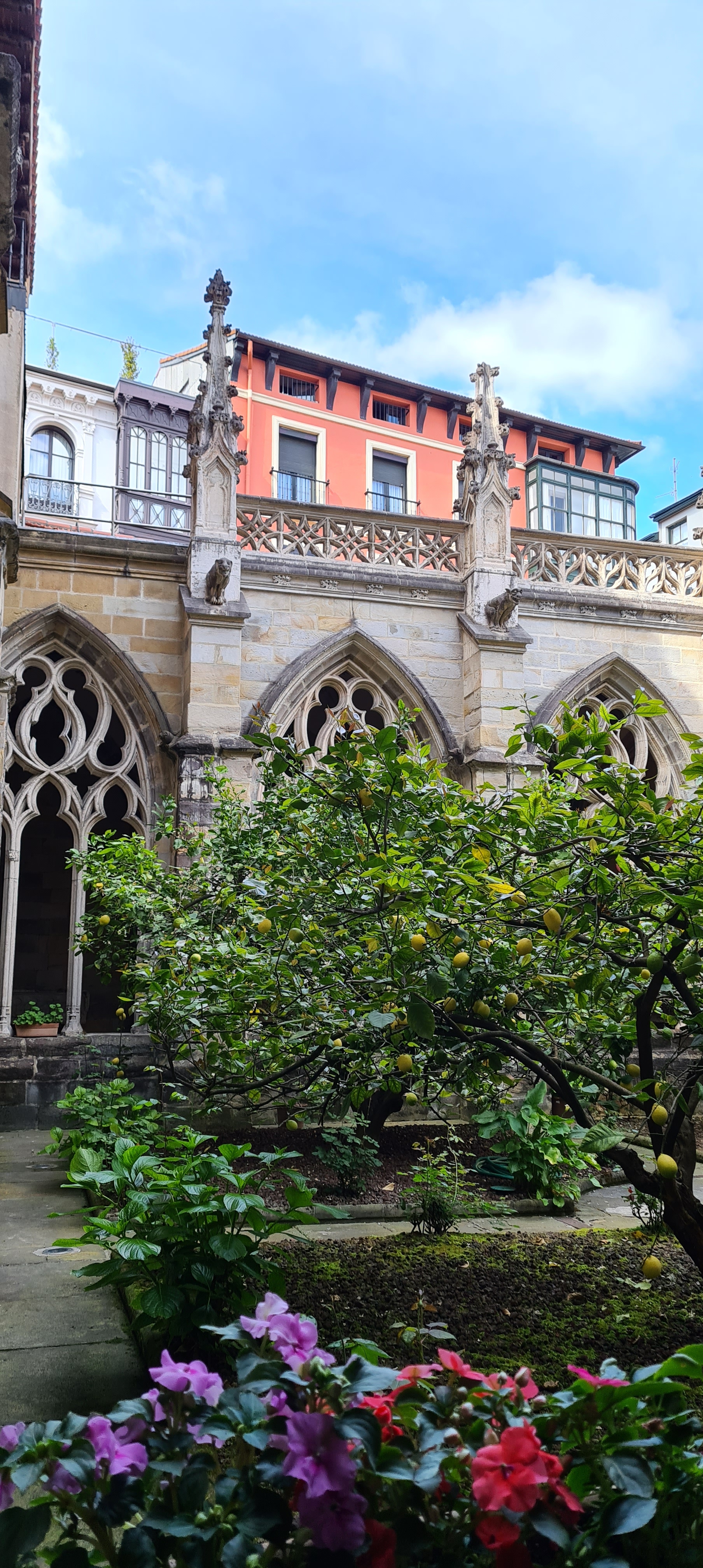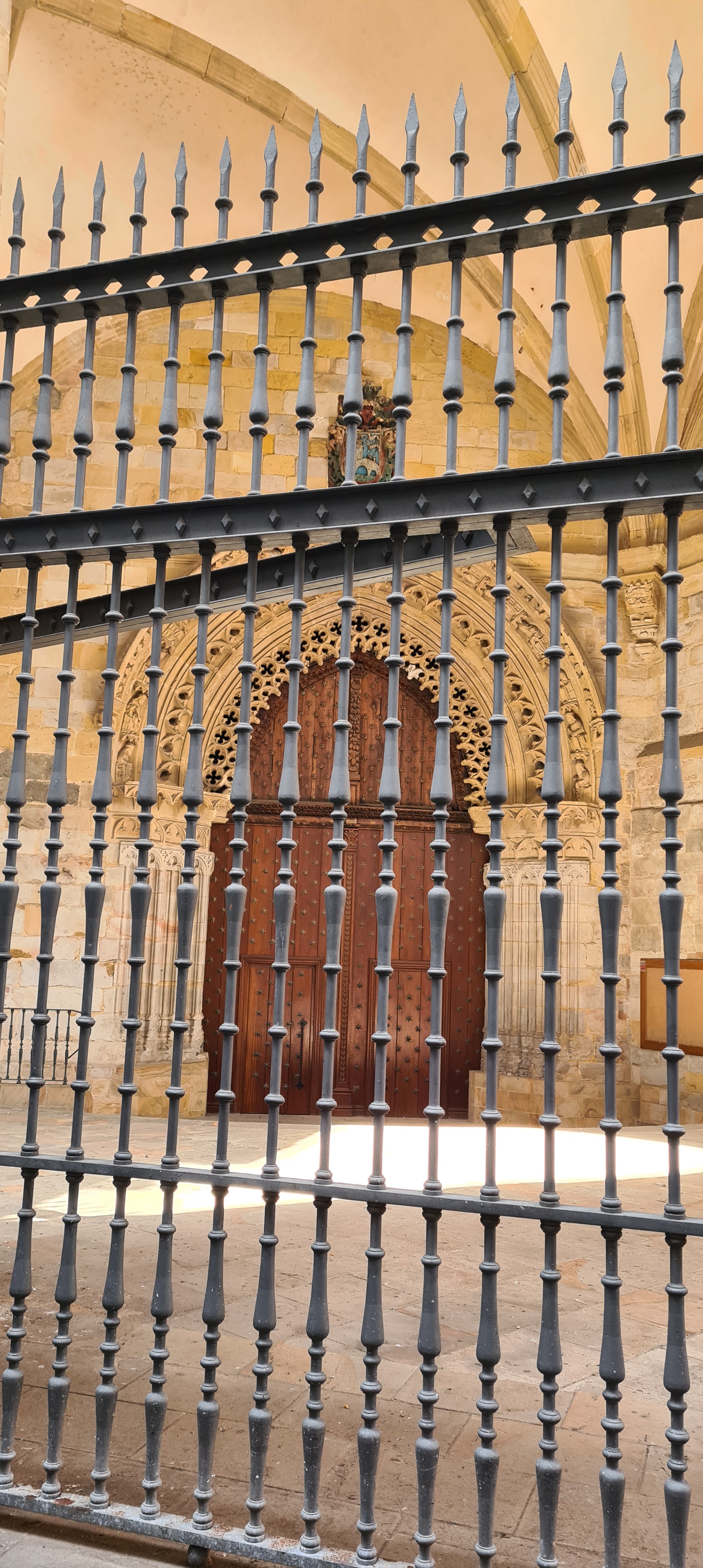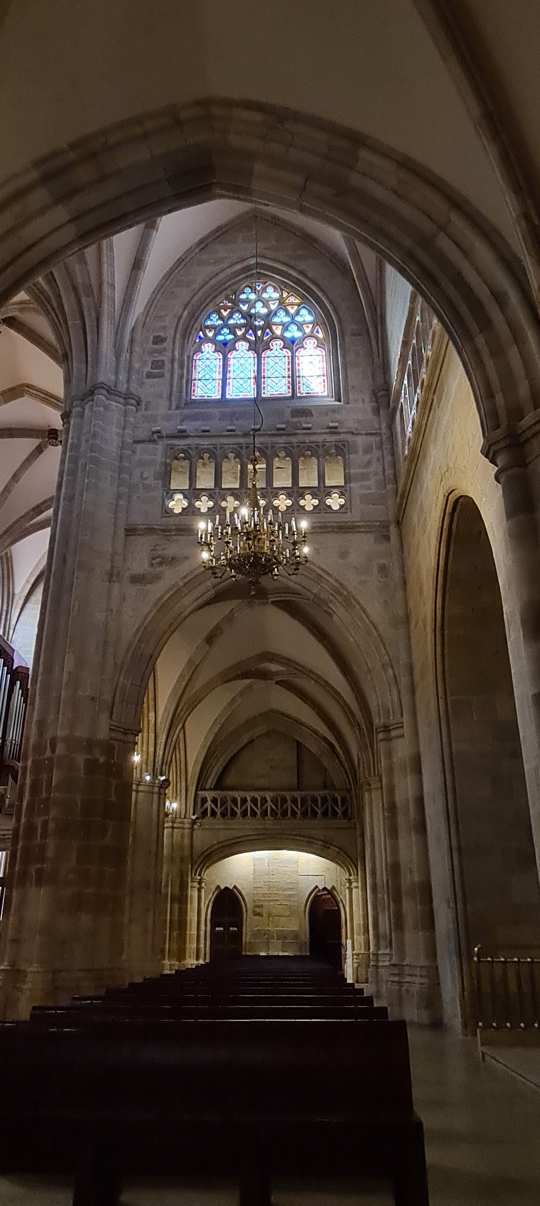 Así llegamos a la Catedral de Bilbao, dedicada a Santiago. Impone con su silueta gótica, elegante y afilada, en pleno Casco Viejo. Su torre, visible desde varias calles del entorno, es como un faro urbano que guía al visitante hacia la plaza. La fachada combina la verticalidad típica del gótico con detalles delicados en piedra, arcos apuntados y un rosetón que anticipa la belleza que guarda dentro.