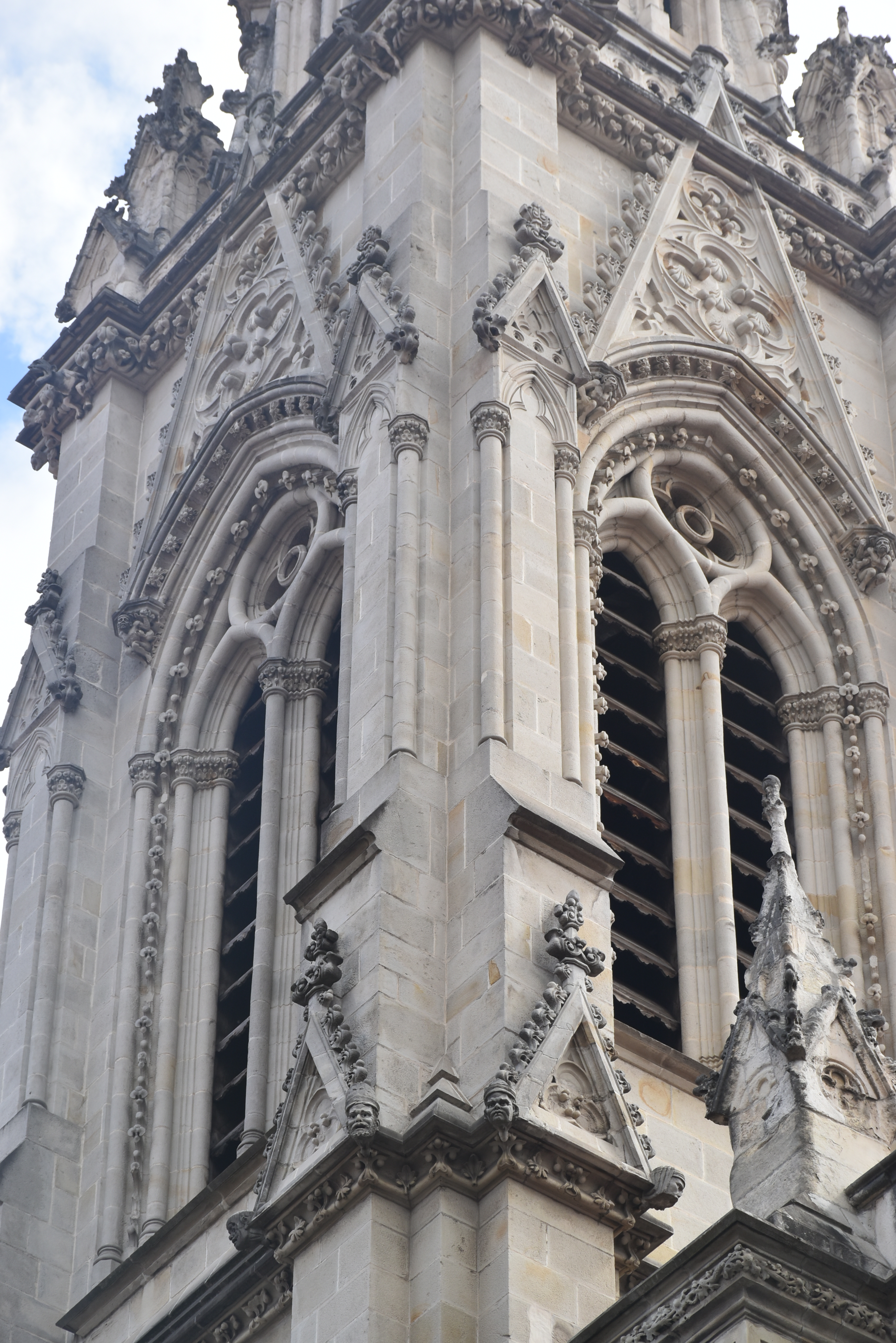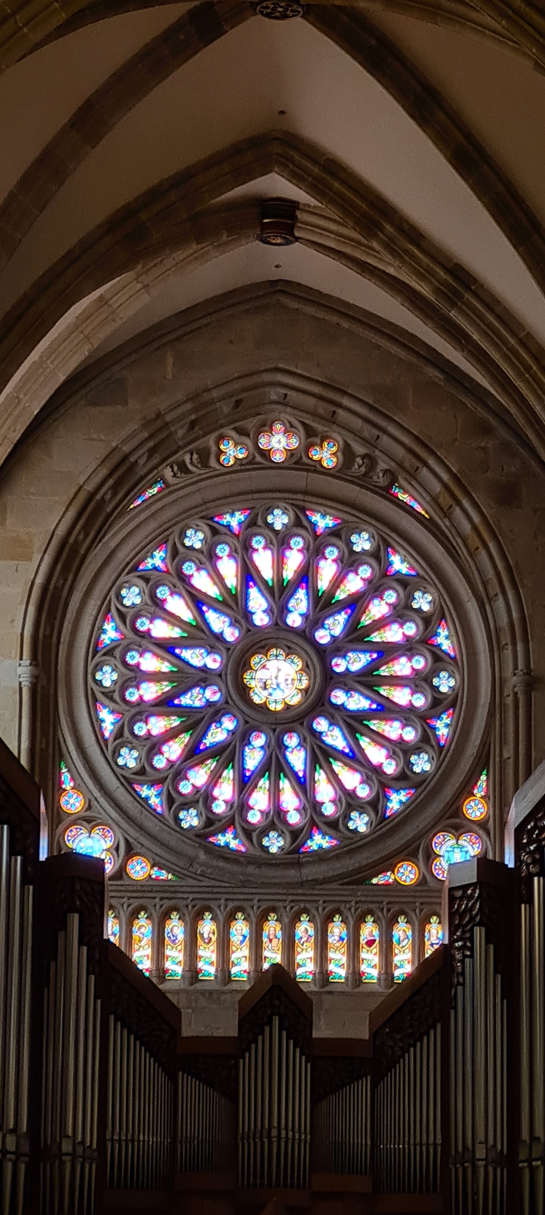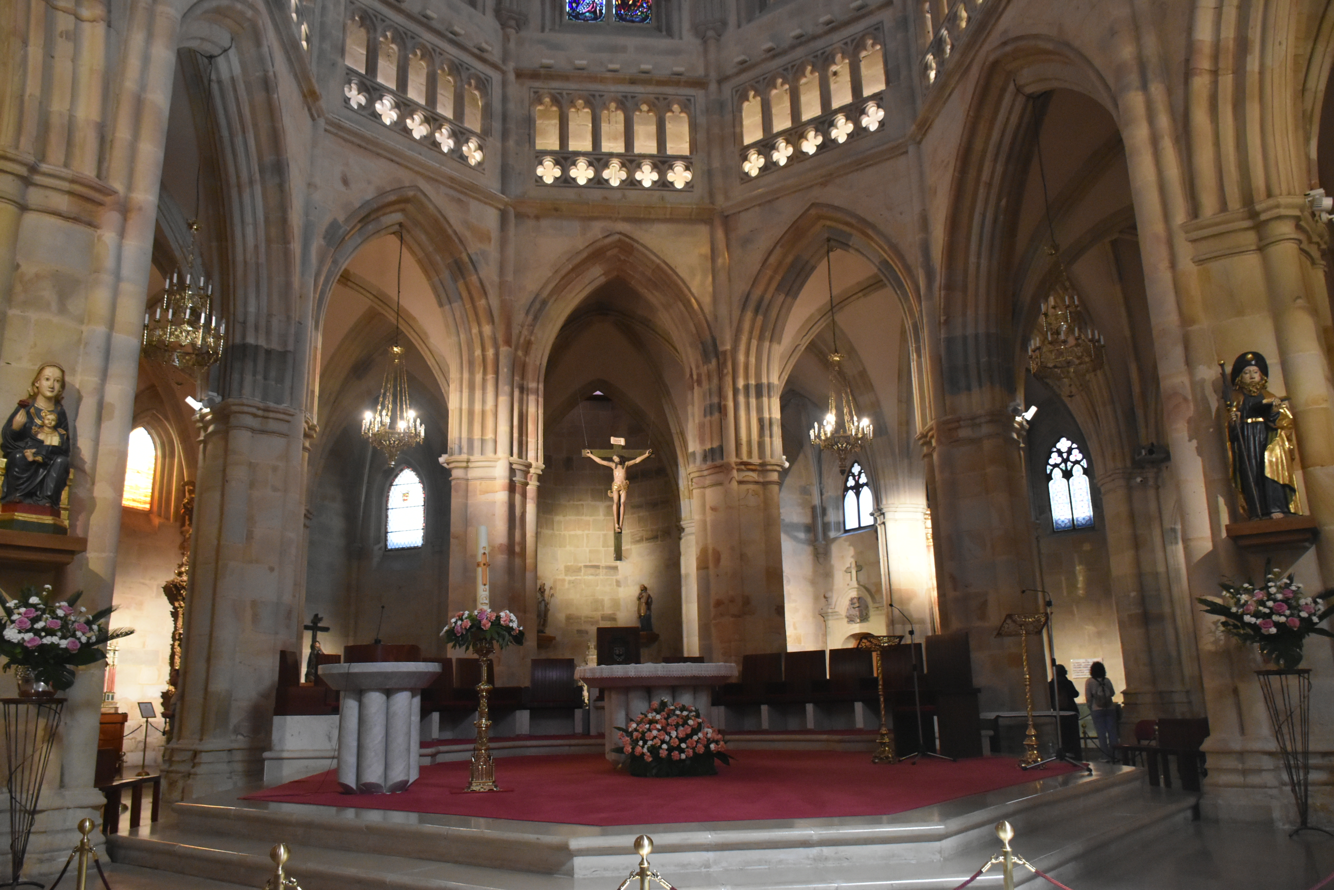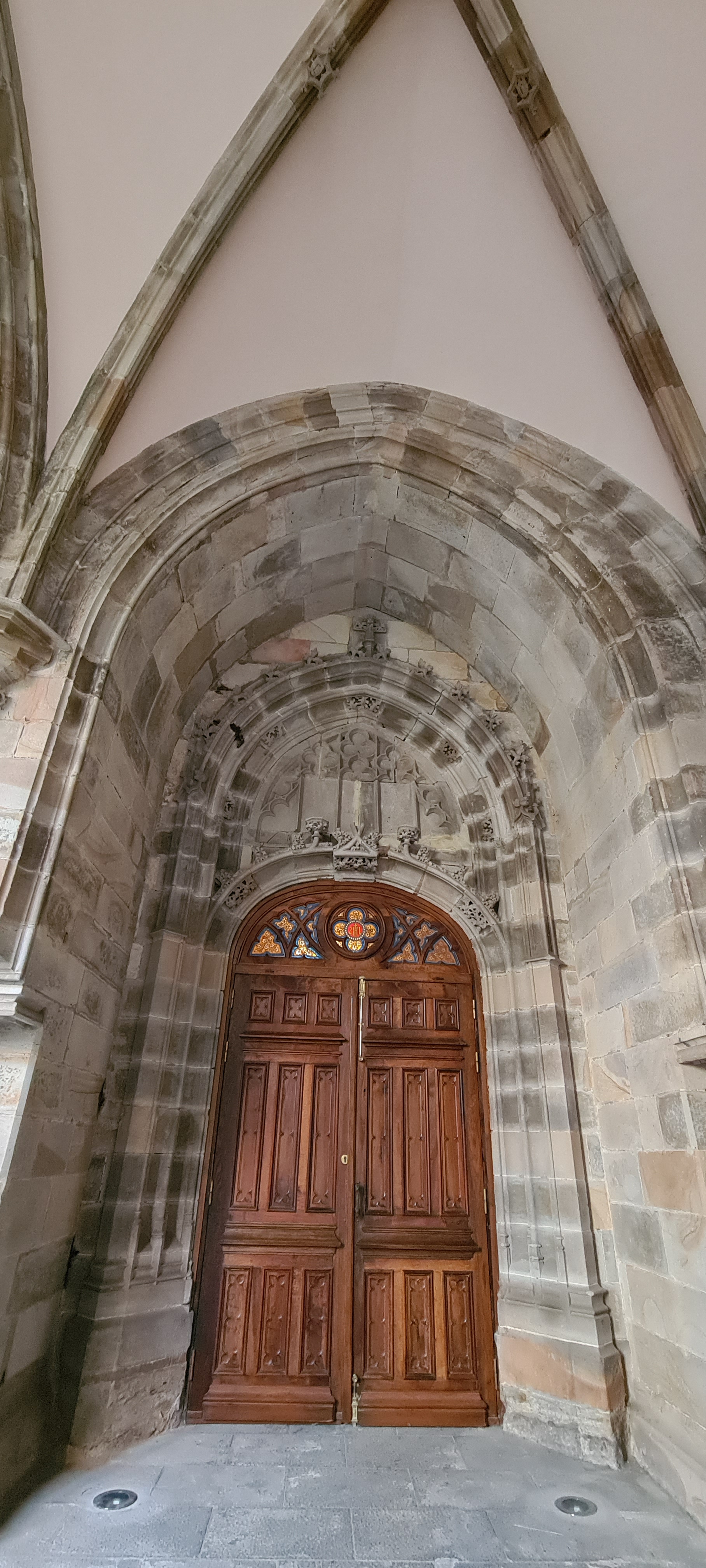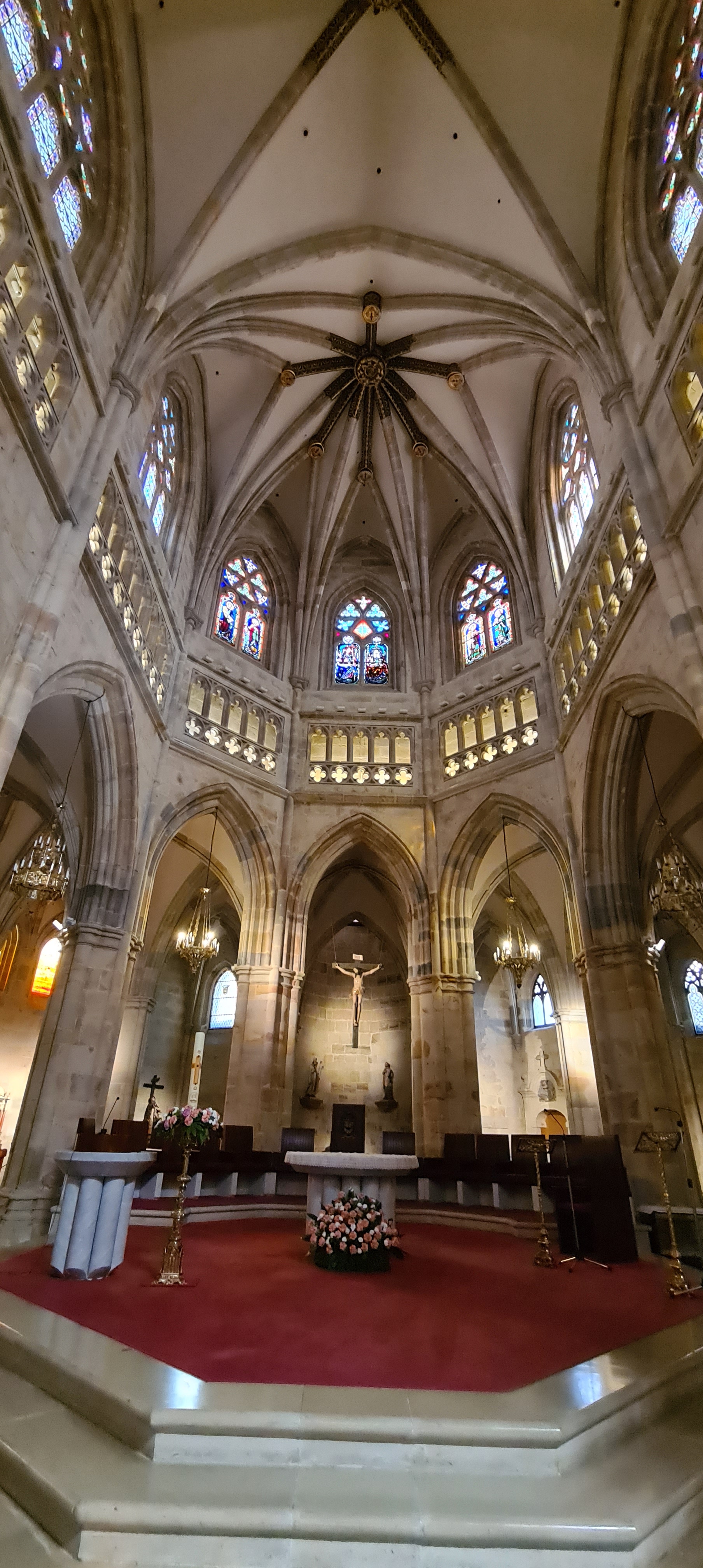 Así llegamos a la Catedral de Bilbao, dedicada a Santiago. Impone con su silueta gótica, elegante y afilada, en pleno Casco Viejo. Su torre, visible desde varias calles del entorno, es como un faro urbano que guía al visitante hacia la plaza. La fachada combina la verticalidad típica del gótico con detalles delicados en piedra, arcos apuntados y un rosetón que anticipa la belleza que guarda dentro.