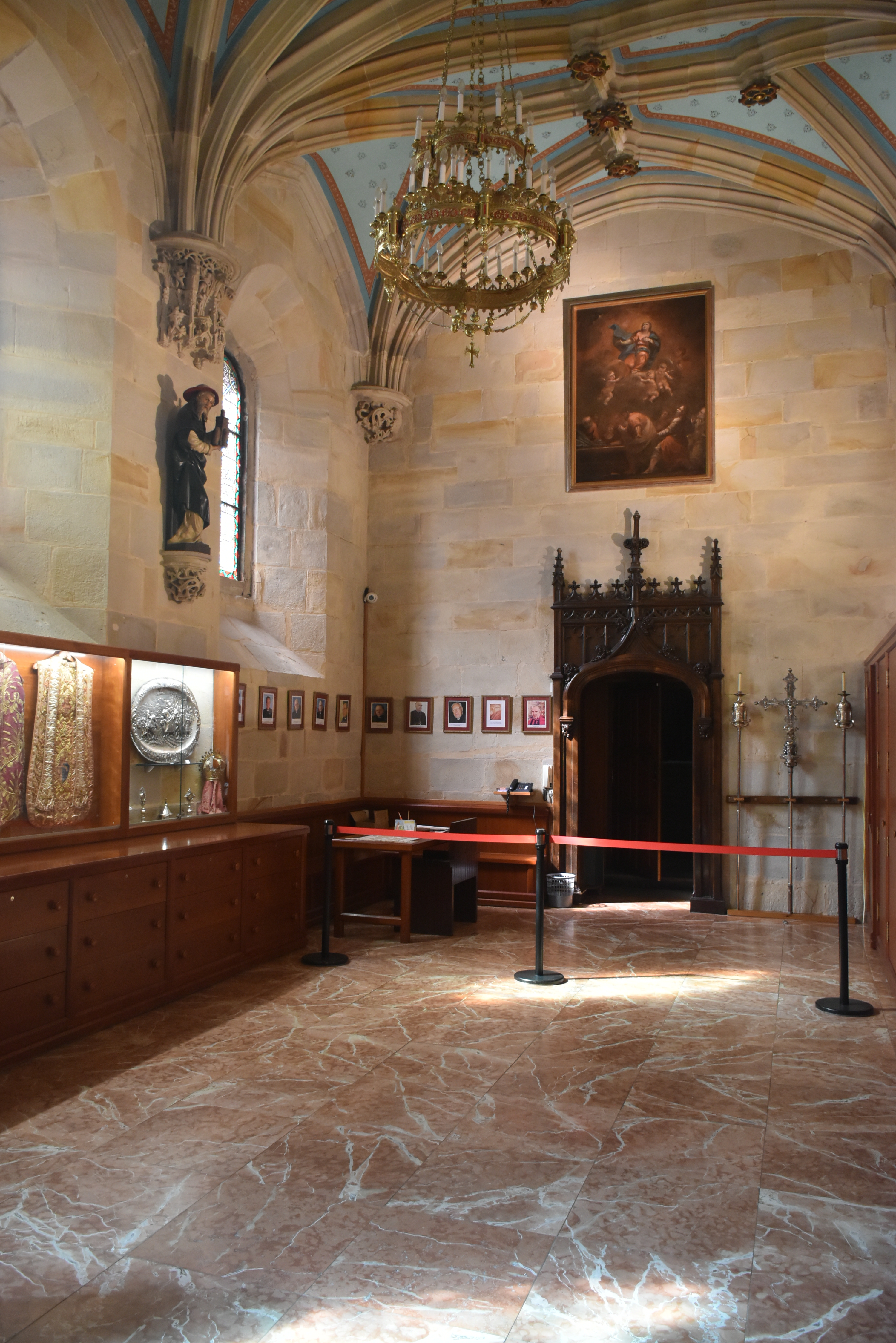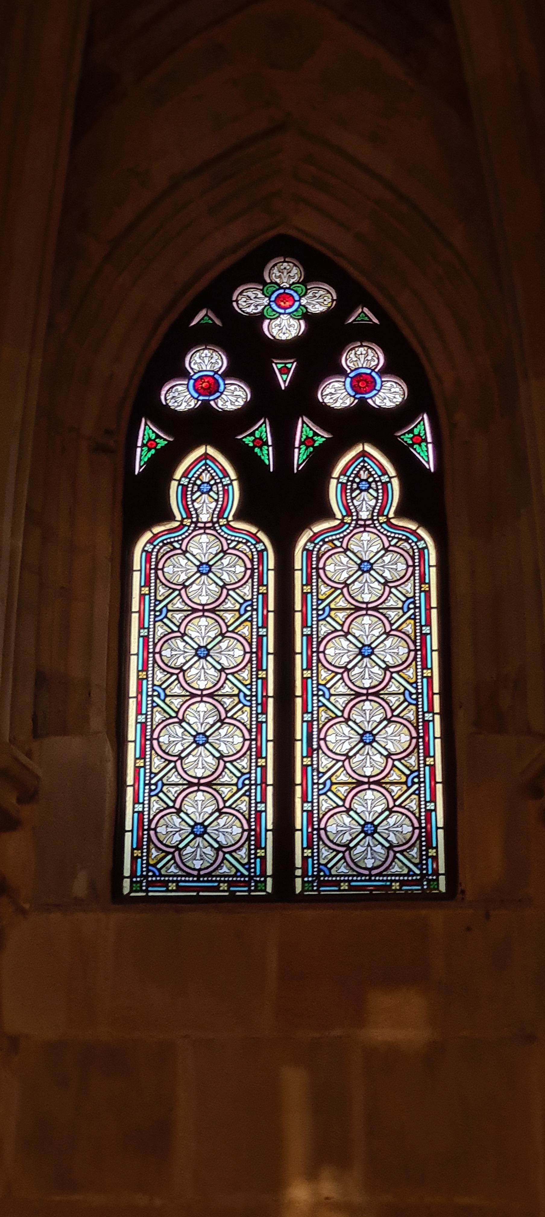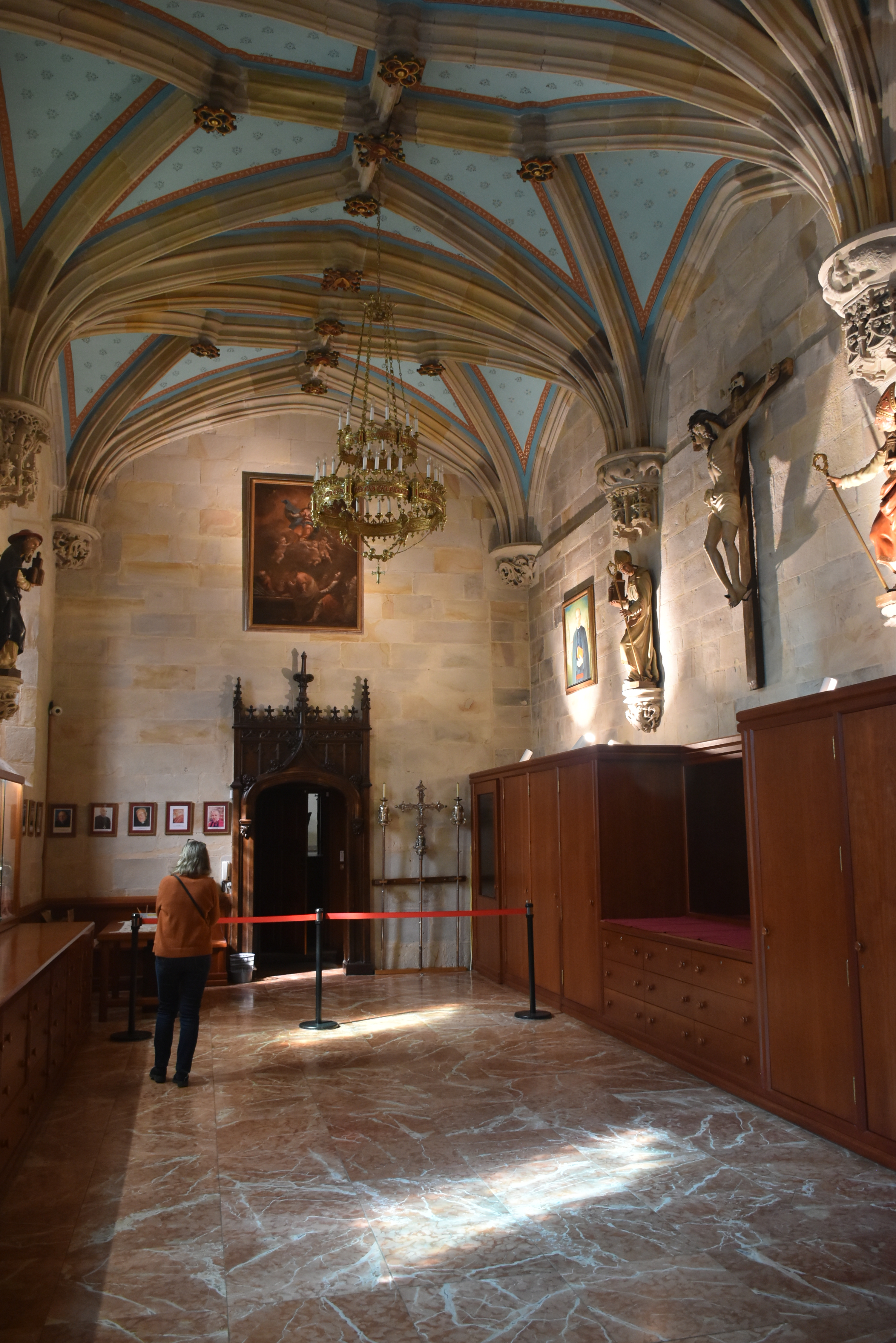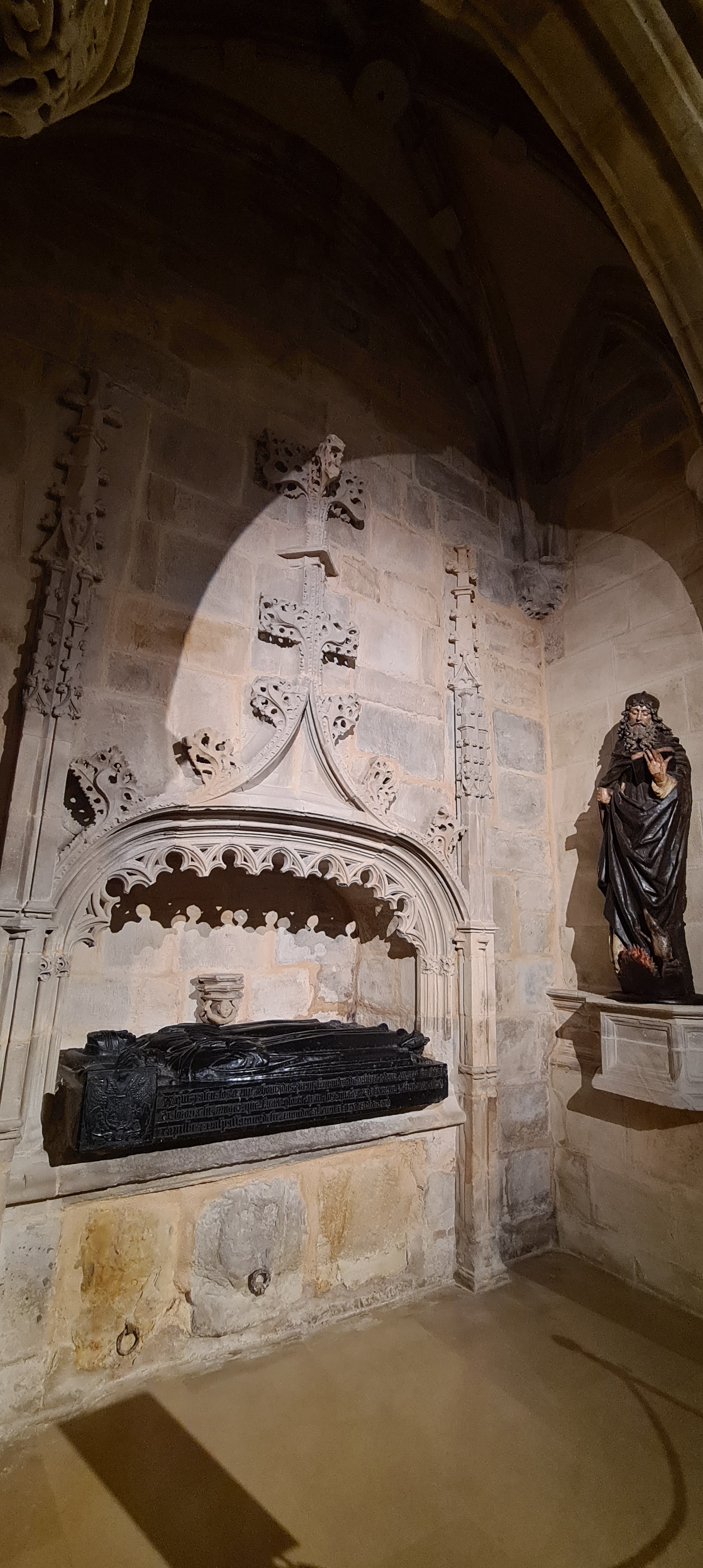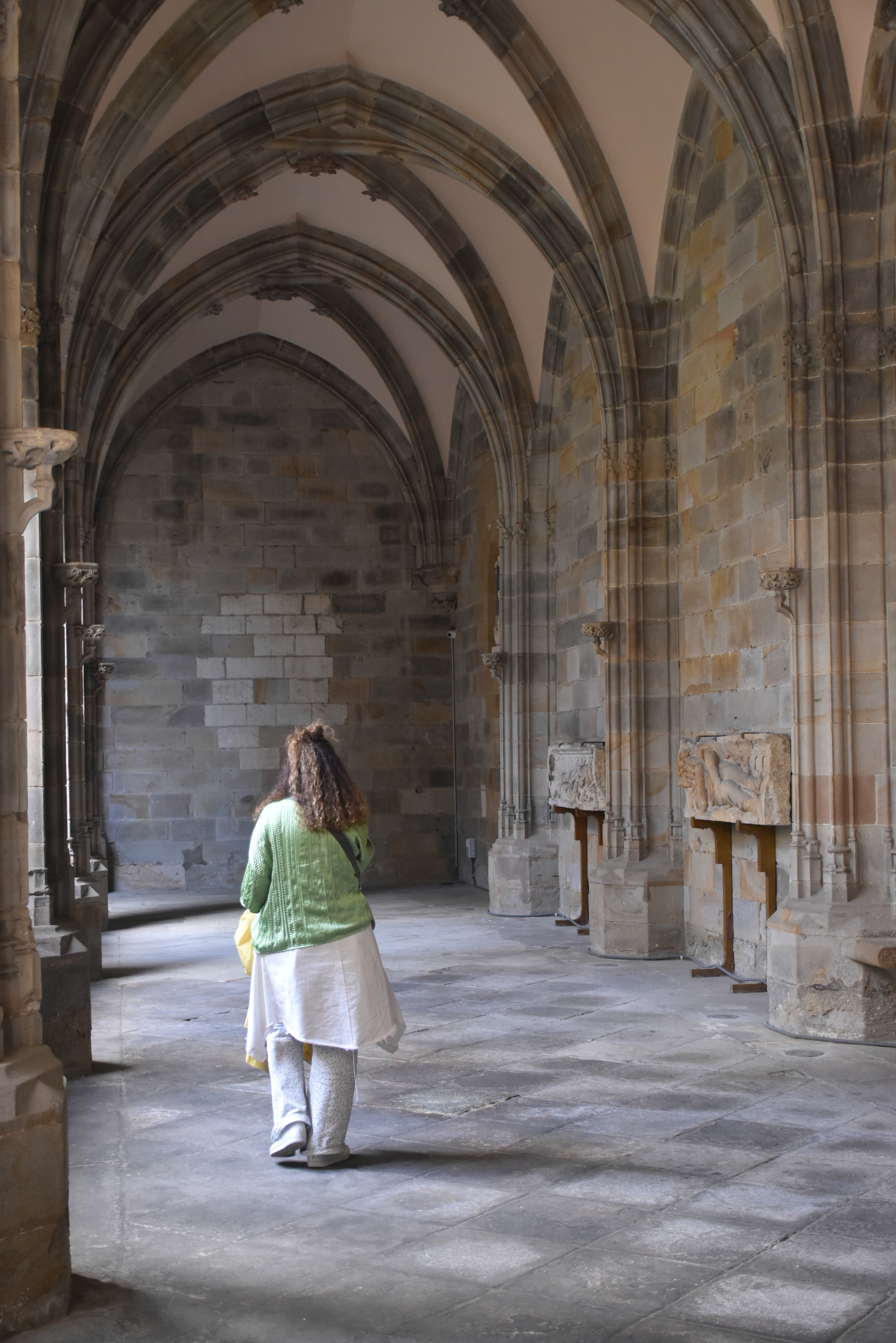 Así llegamos a la Catedral de Bilbao, dedicada a Santiago. Impone con su silueta gótica, elegante y afilada, en pleno Casco Viejo. Su torre, visible desde varias calles del entorno, es como un faro urbano que guía al visitante hacia la plaza. La fachada combina la verticalidad típica del gótico con detalles delicados en piedra, arcos apuntados y un rosetón que anticipa la belleza que guarda dentro.