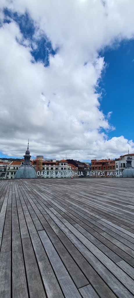 La Alhondiga guarda todavía otro secreto, su azotea. Subir a ella es como cambiar de escena, dejamos las columnas teatrales y pasamos a un espacio abierto y lineal, con Bilbao a nuestro alrededor.