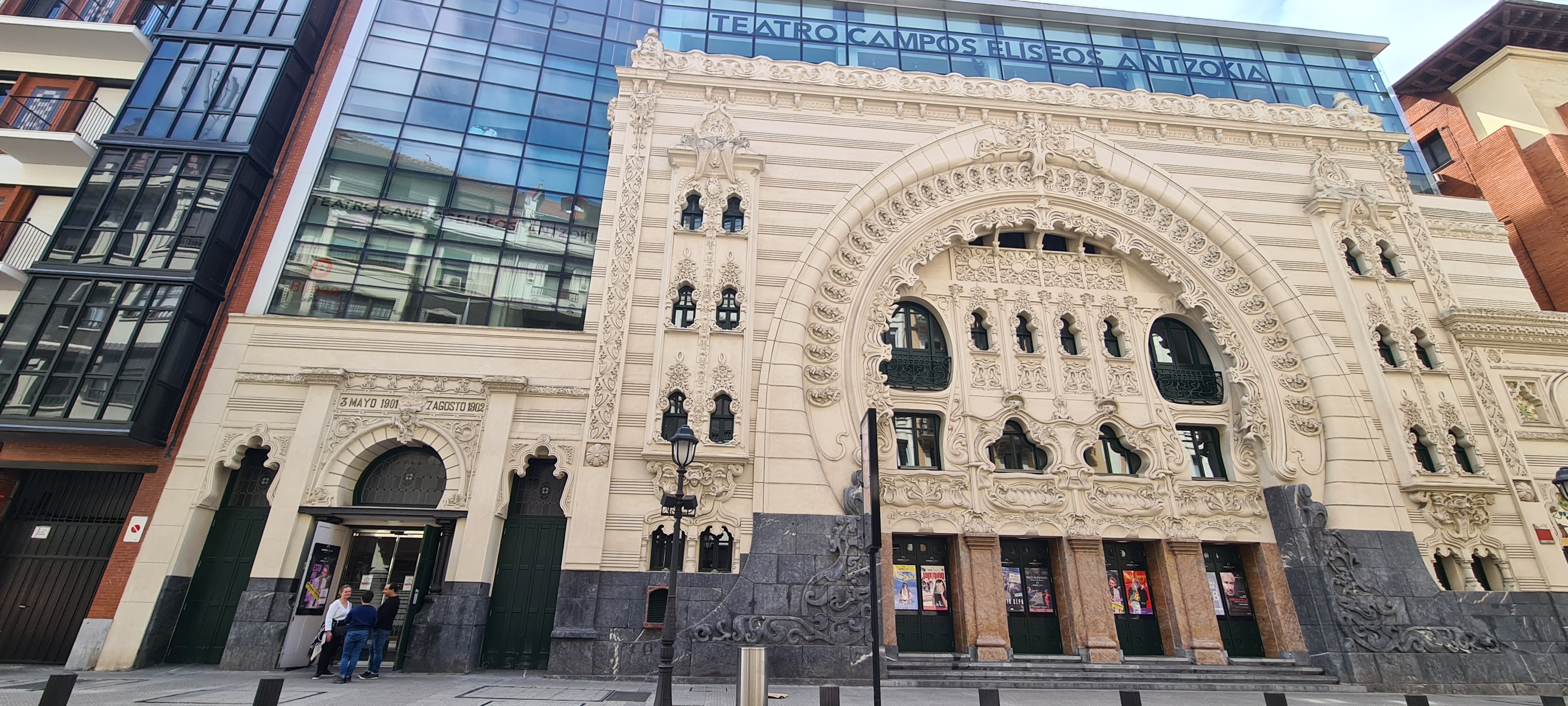 Desde la Alhondiga vamos andando hasta el Casco Viejo y todavía seguimos encontrando edificios preciosos que llaman nuestra atención como el Teatro Campos Elíseos Antzokia, edificado entre dos dos primeros años del siglo XX. Encontramos otros los atrapamos en una foto y nos tomamos un café y un rico zumo.
