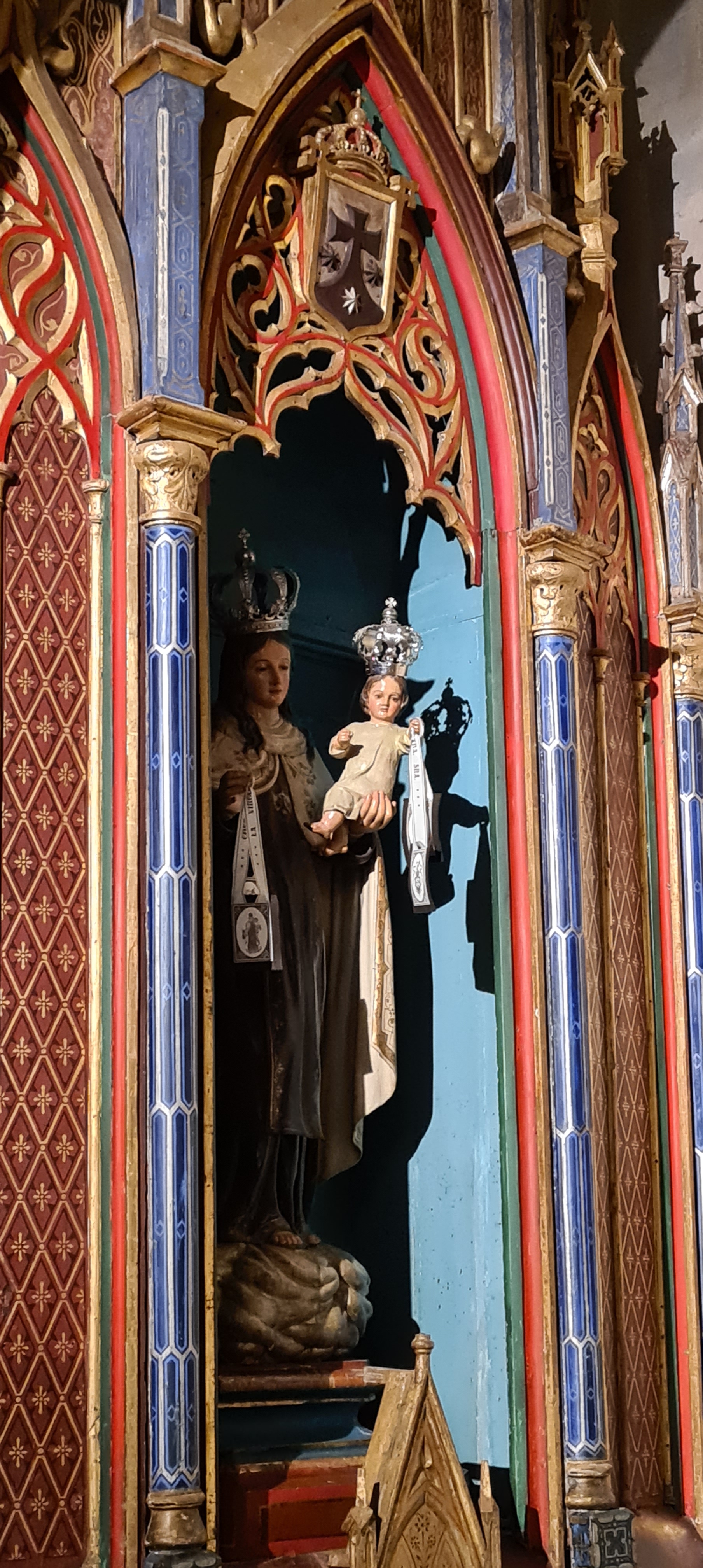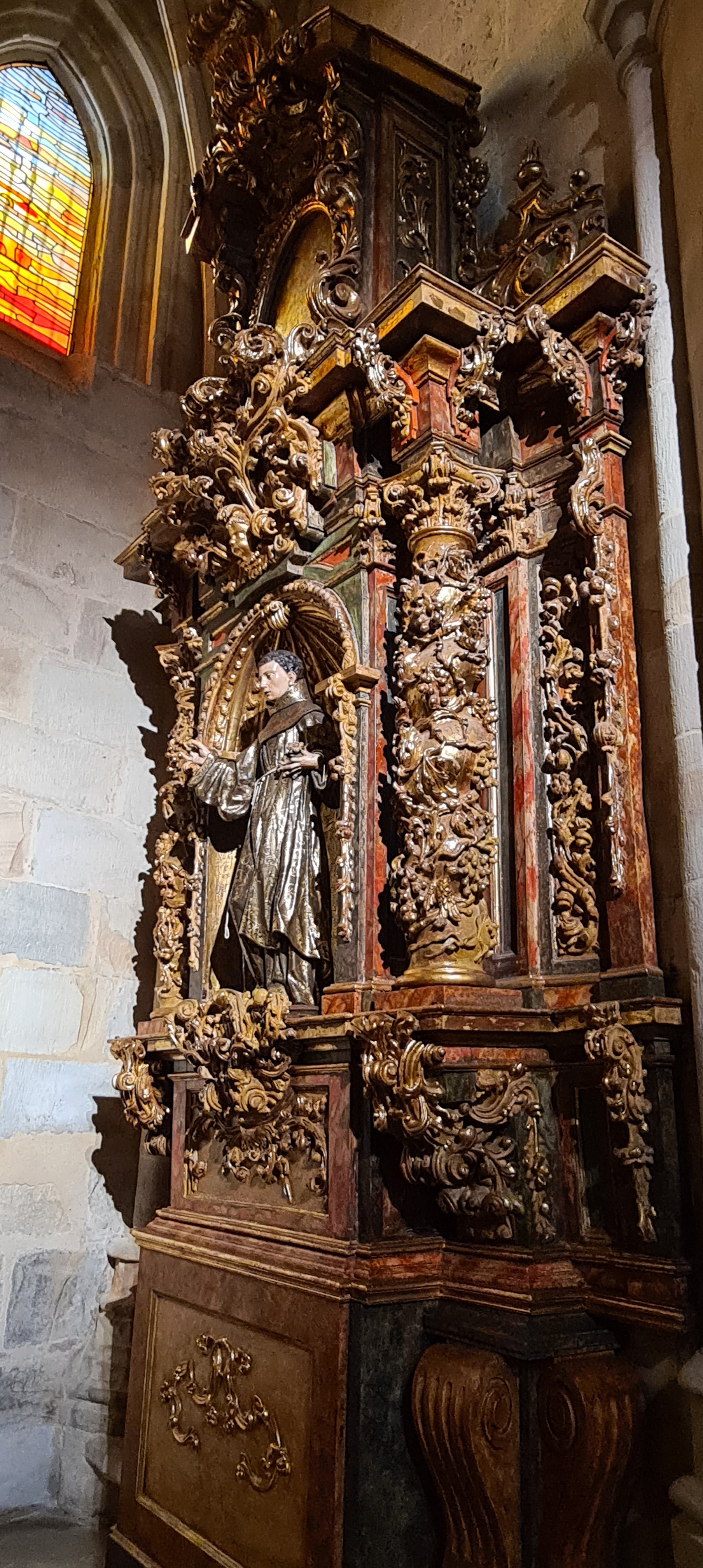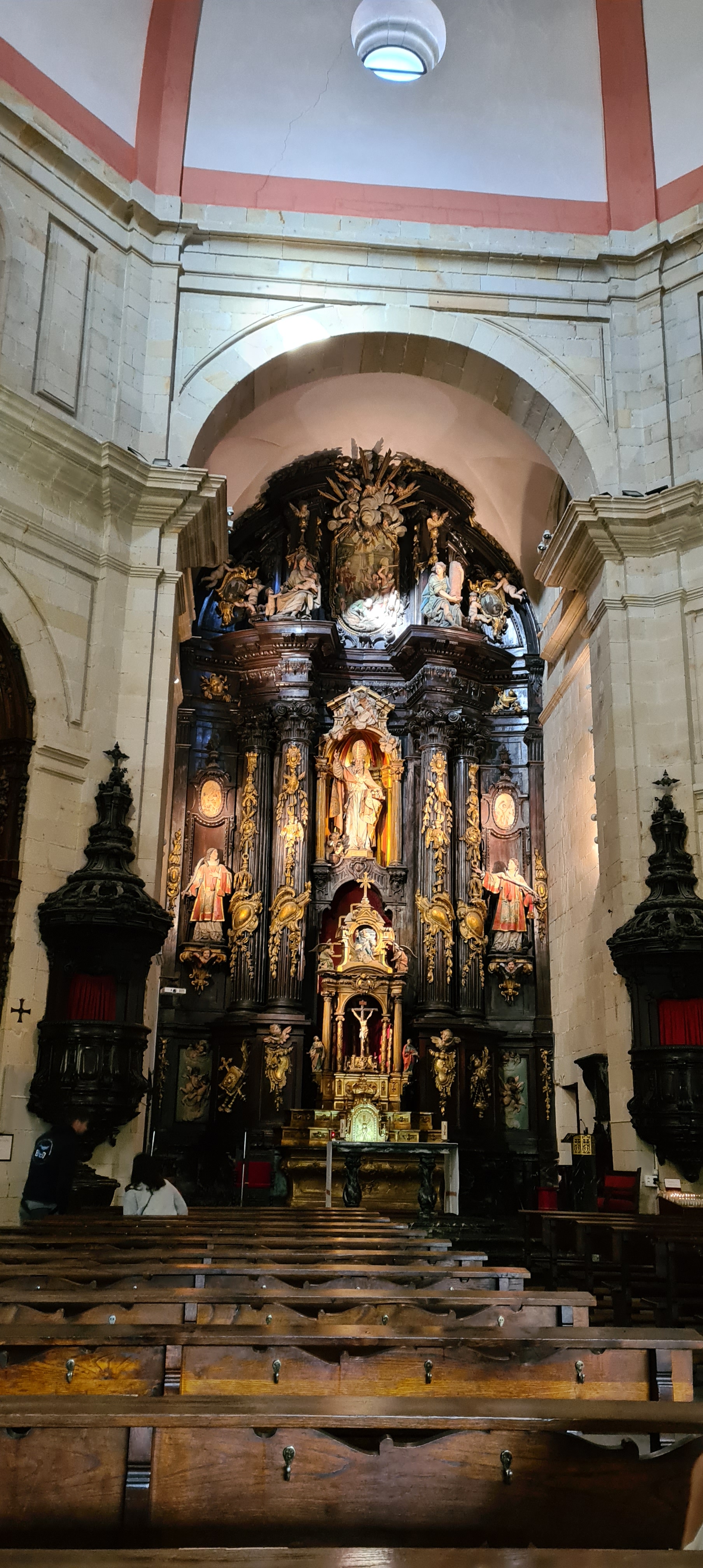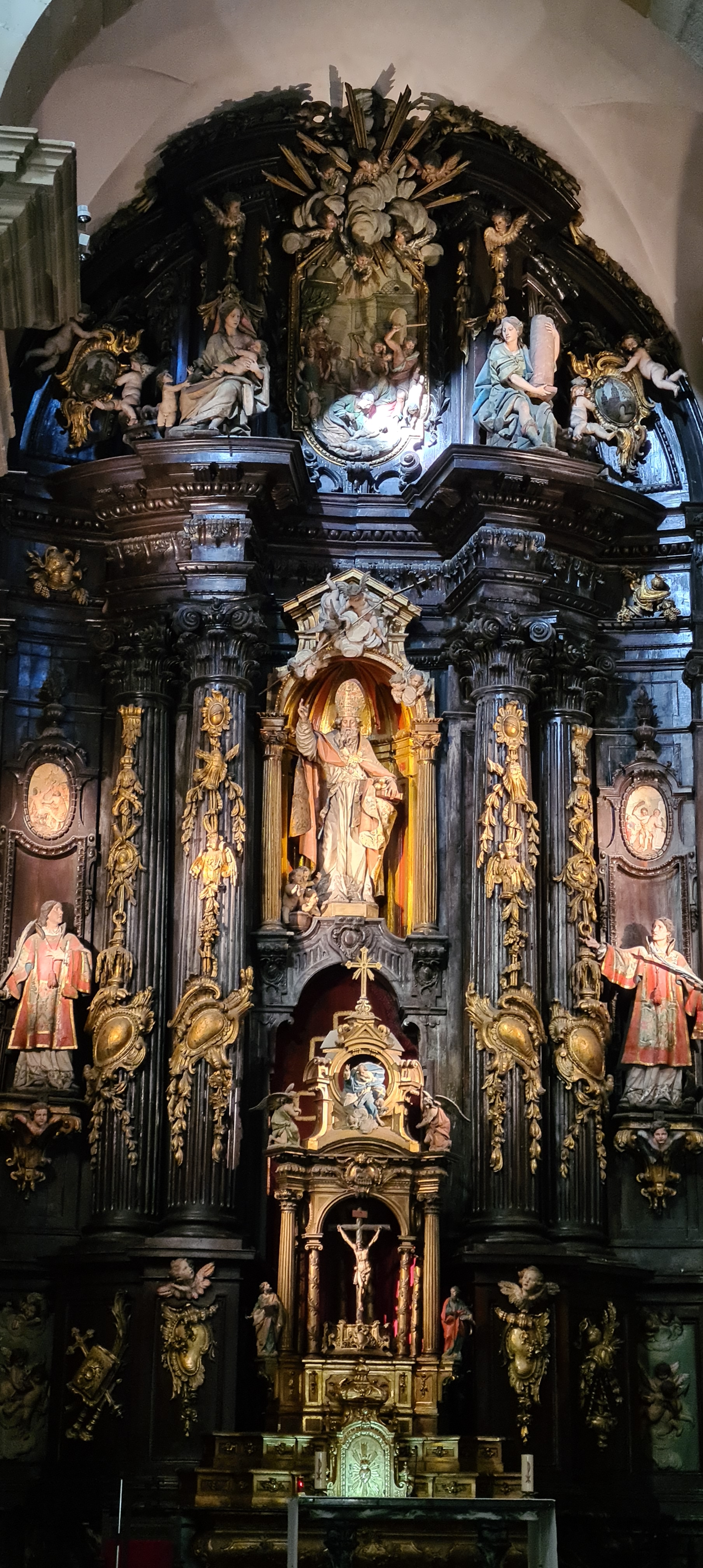 Su interior es conocido por la riqueza de sus retablos; yo fotografié el retablo del altar mayor dedicado a San Nicolás. Realizado en el siglo XVIII en estilo barroco, fue diseñado por Diego Martínez de Arce, esculpido por Juan Pascual de Mena y policromado por José López Perella. El conjunto, organizado en tres calles y tres niveles destaca por su colorido, la calidad de su escultura y la armonía entre arquitectura y talla.