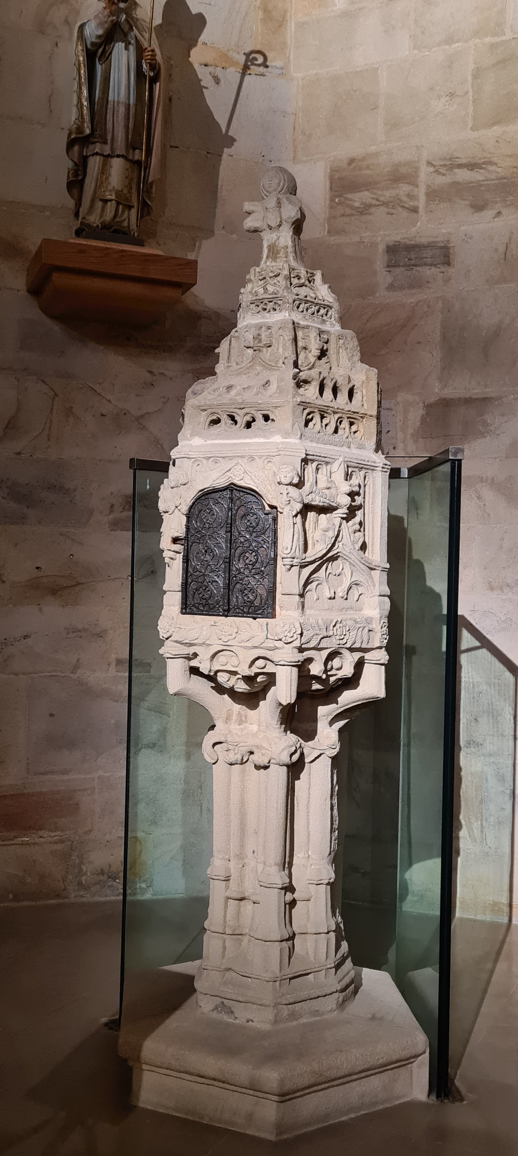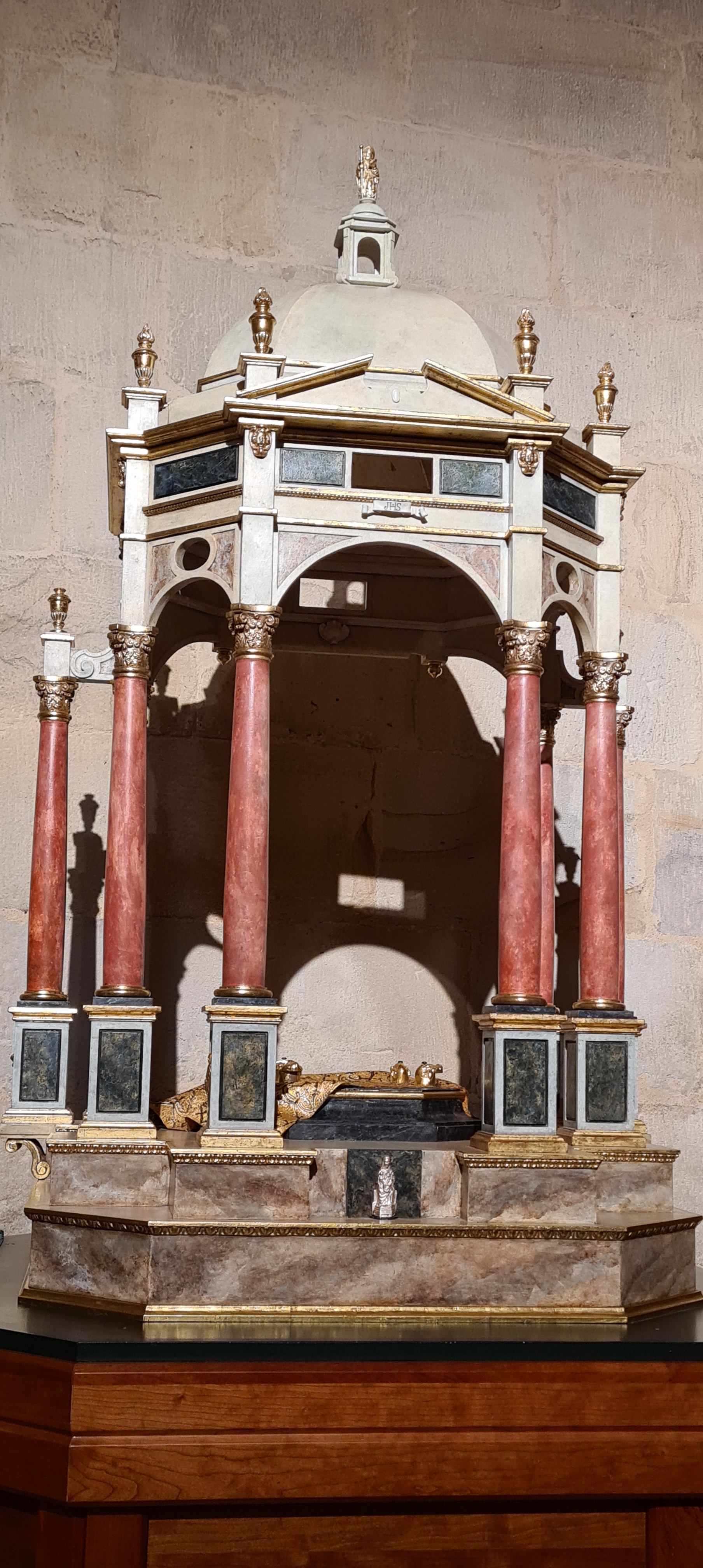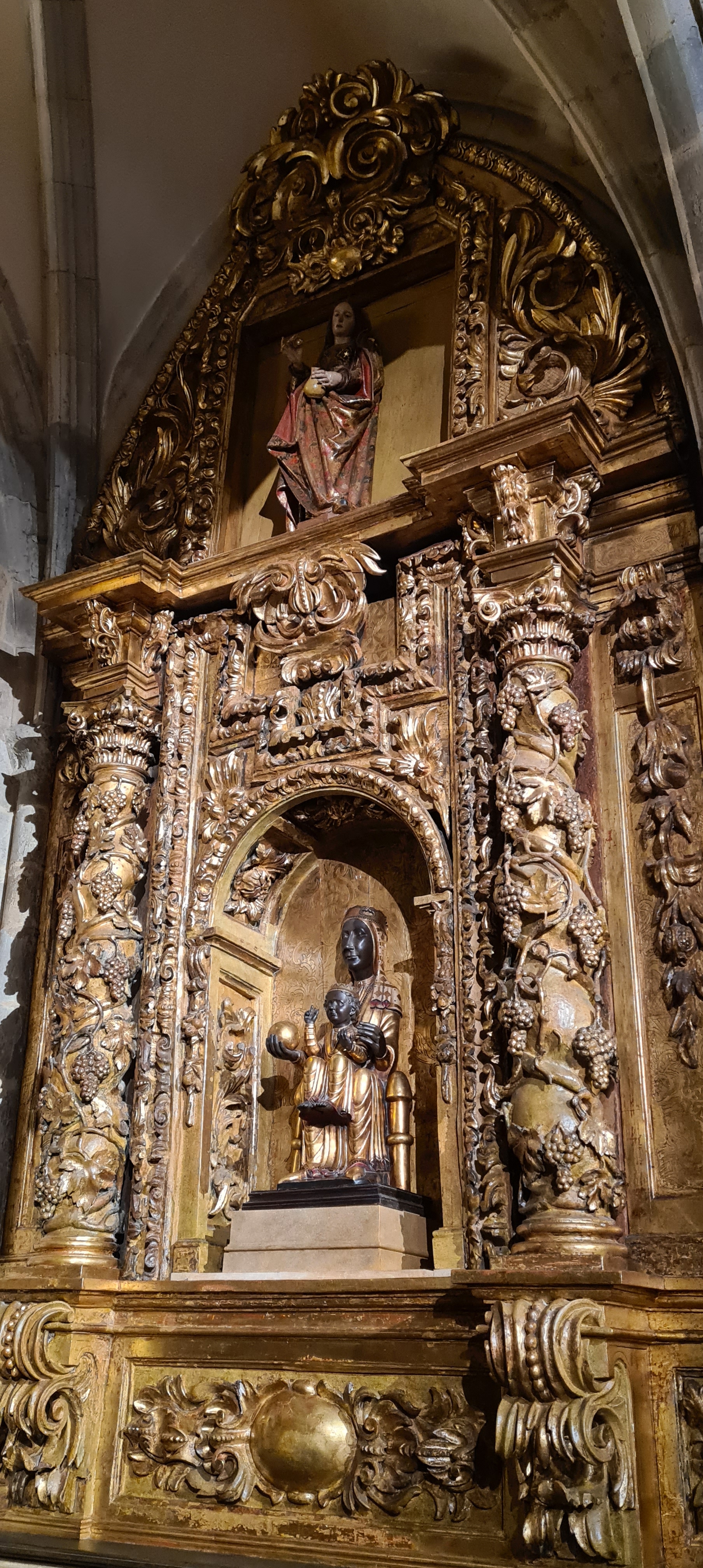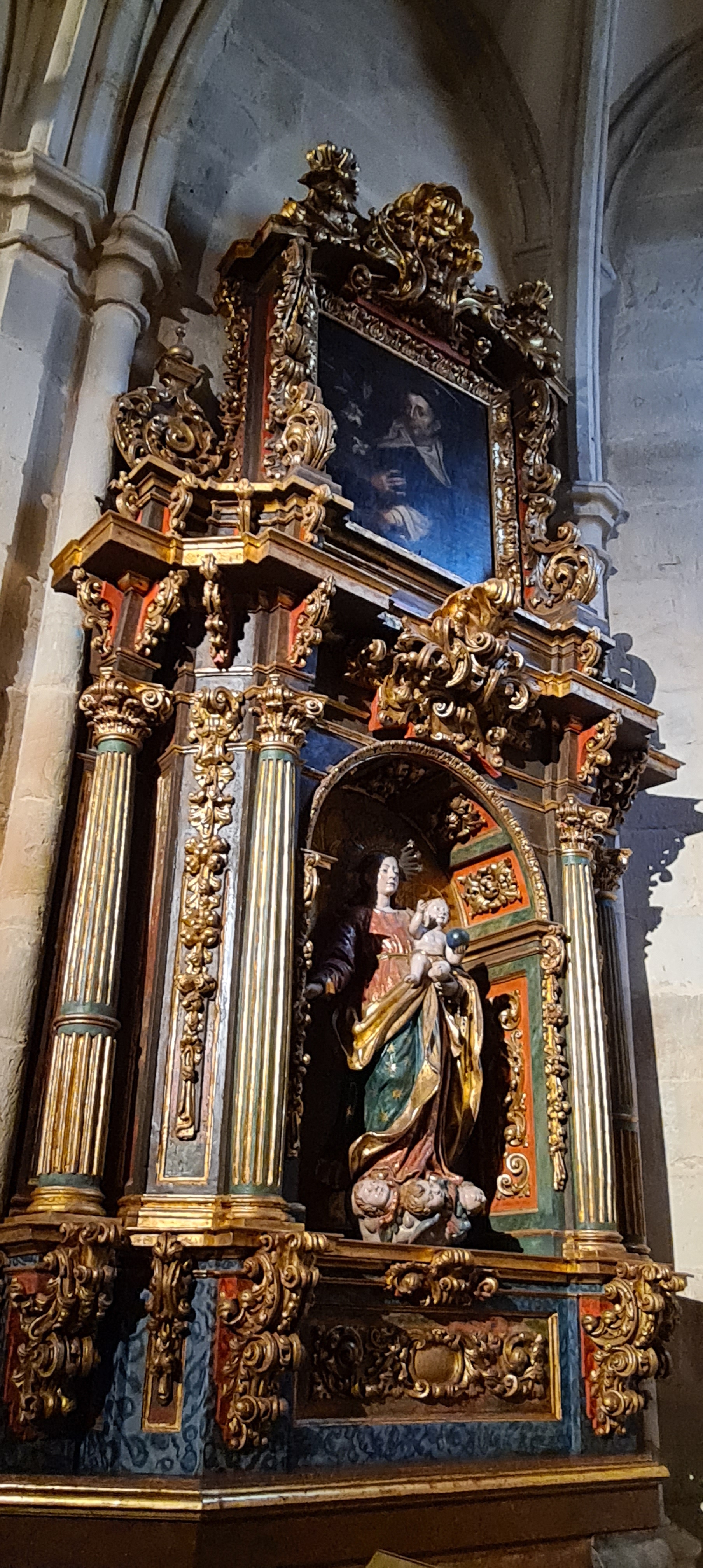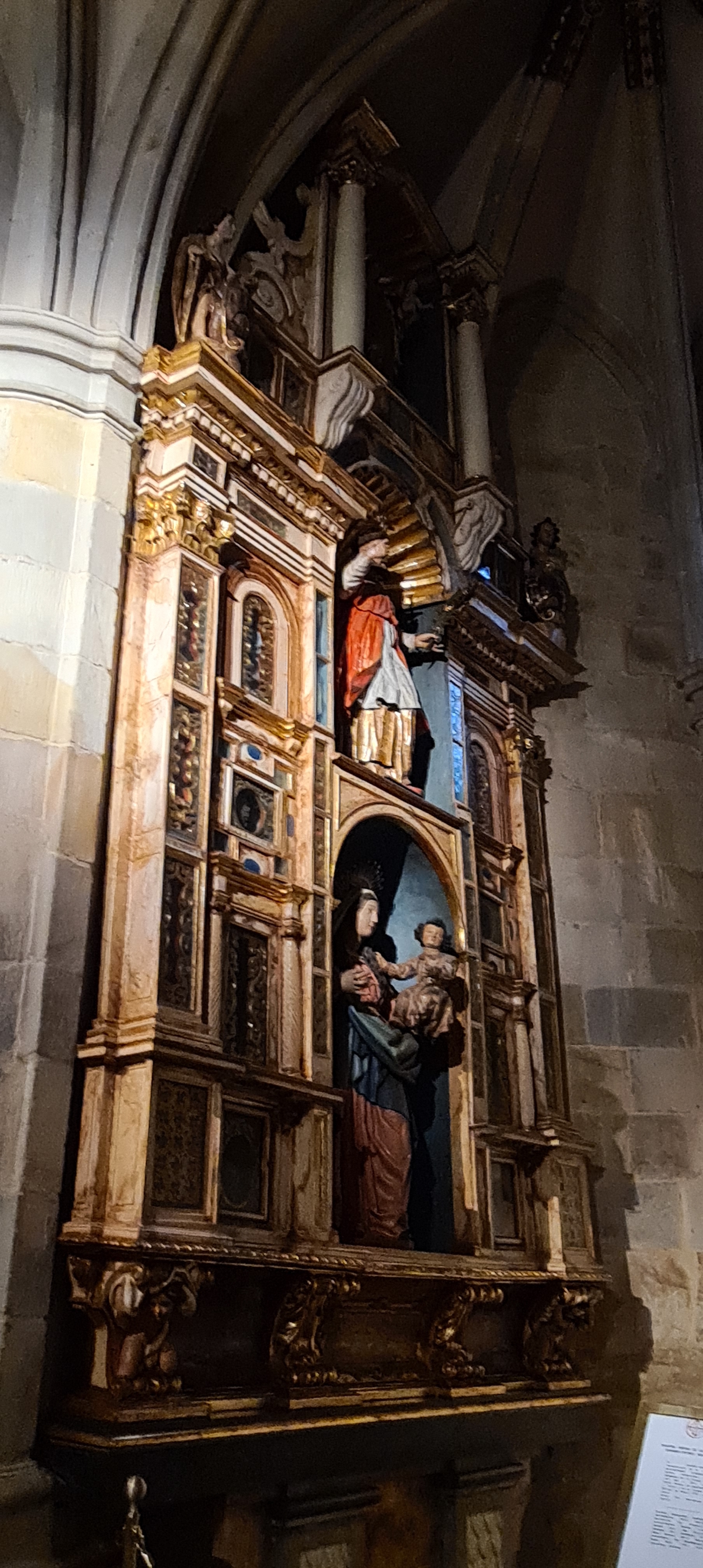 Su interior es conocido por la riqueza de sus retablos; yo fotografié el retablo del altar mayor dedicado a San Nicolás. Realizado en el siglo XVIII en estilo barroco, fue diseñado por Diego Martínez de Arce, esculpido por Juan Pascual de Mena y policromado por José López Perella. El conjunto, organizado en tres calles y tres niveles destaca por su colorido, la calidad de su escultura y la armonía entre arquitectura y talla.