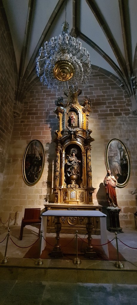 En esta bajada que parece idílica, lo fue hasta llegar casi a la plaza de Unamuno, porque en un momento en el que los turistas parece que han desaparecido, un joven cuya nacionalidad no viene a cuento, quería entablar conversación con nosotros con el claro objetivo de robarnos el reloj con la técnica «te doy la mano y te lo quito» vete tu a saber cómo. Si tú que estás leyendo piensas que no sería para tanto, tengo que decir que como no le dimos la mano y nos fuimos muy rápidamente, él nos adelantó y en la plaza se encontró con otra persona y empezaron a seguirnos… en fin fue un momento de bastante angustia, (en los viajes a veces pasan cosas que no son tan buenas), después de jugar al despiste y no con poca dificultad conseguimos perderlos de vista, pero estábamos para pocas visitas… Nos metimos en la Catedral de Santiago por eso de acogernos «a sagrado» (como en la Edad Media).