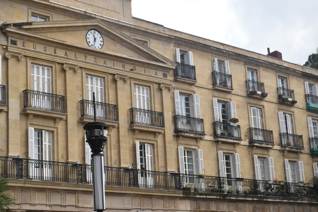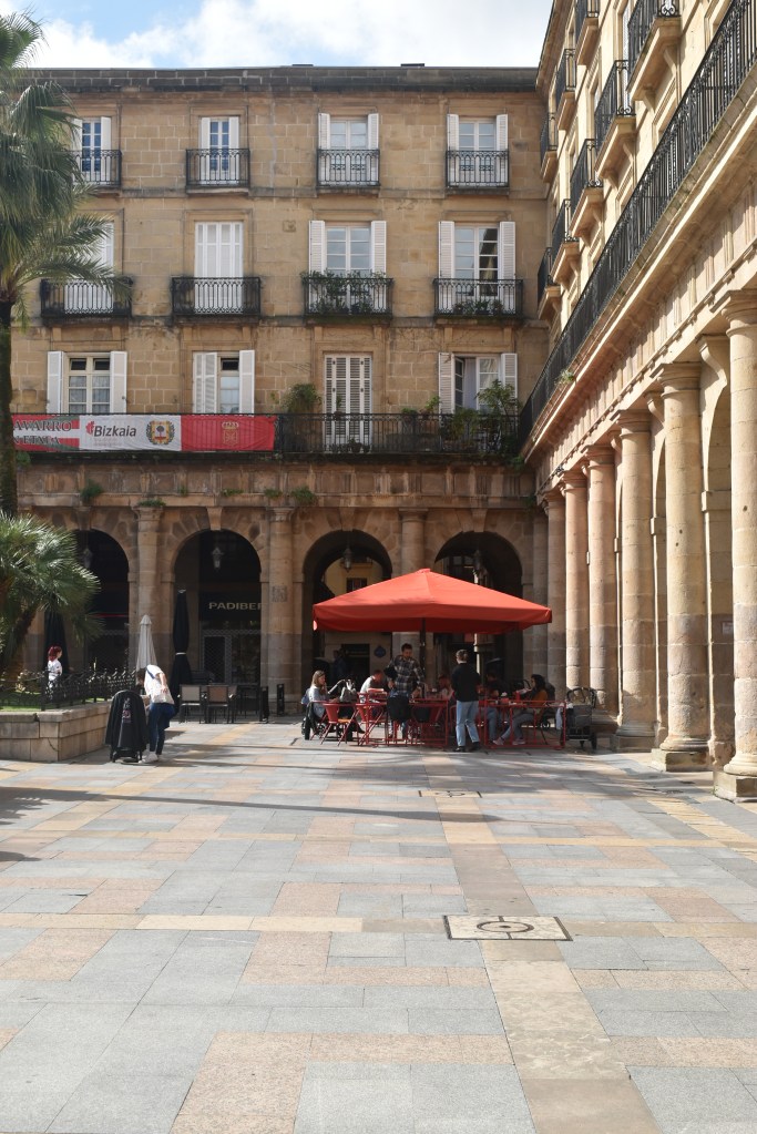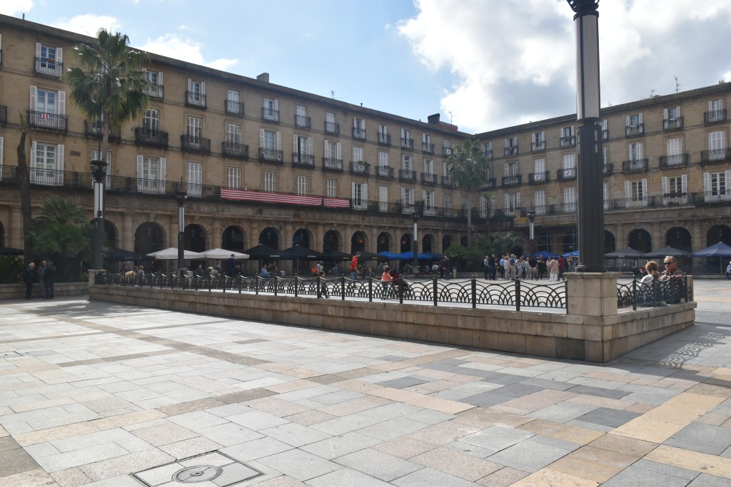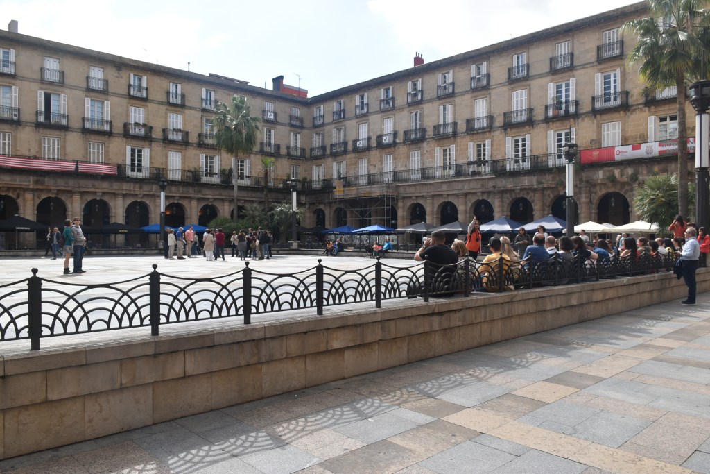 Vamos directos a la Plaza Nueva, tiene un importante papel en la vida social de Bilbao, está en el centro del Casco Viejo, se inauguró en 1851 después de sesenta y cinco años construyéndose. Tiene un corredor cubierto de arcos de medio punto, es de estilo neoclásico con cinco accesos. El edificio principal (el que tiene el reloj) es la sede de la Real Academia de la Lengua Vasca.