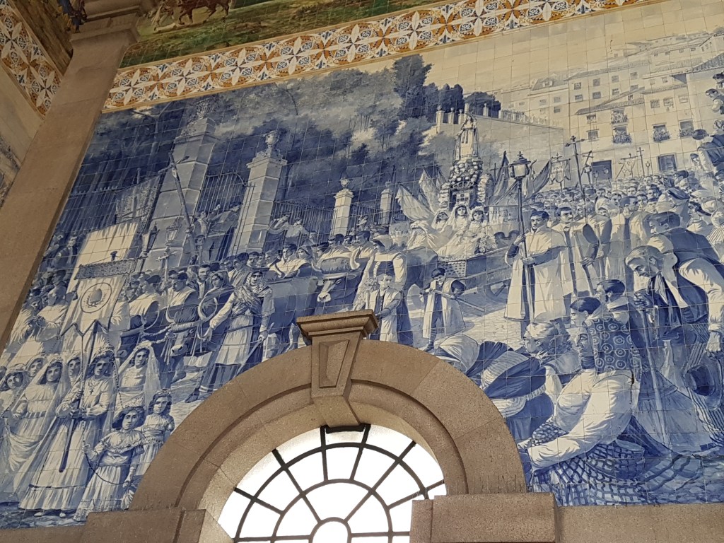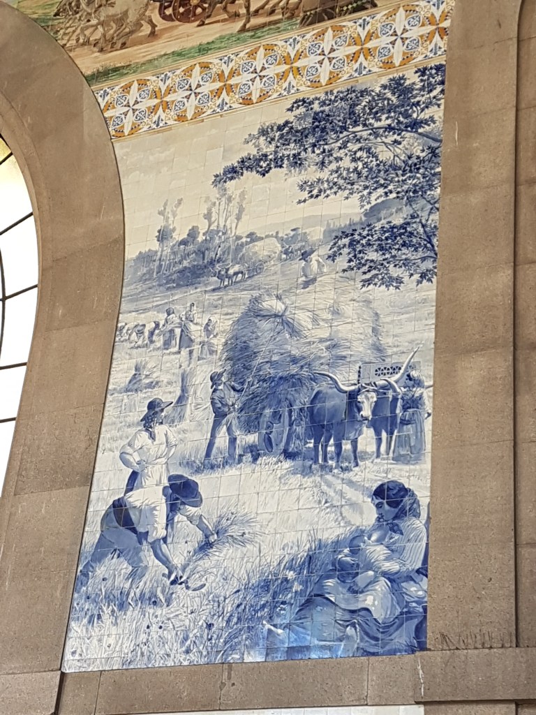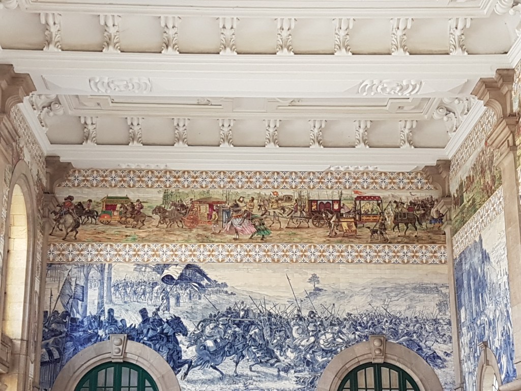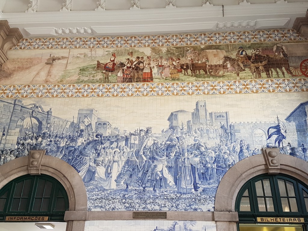 La Estación de Sâo Bento está destinada a los trenes de distancias cortas, ocupa un antiguo monasterio. Pero esta estación es famosa por sus murales de azulejos de Jorge ColaÇo, realizados en azul y blanco, representando escenas de momentos históricos portugueses, de transportes y de fiestas rurales. Merece la pena la visita, se puede ver en unos 45 minutos dedicando tiempo a ver los murales.