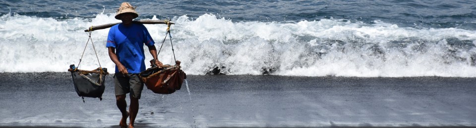 Impactados aún de la ceremonia del Templo de la Cueva de los Murciélagos Goa Lawah, nos vamos a un «Taller de sal», a orillas del Océano Índico, donde extraen sal de una manera muy tradicional.