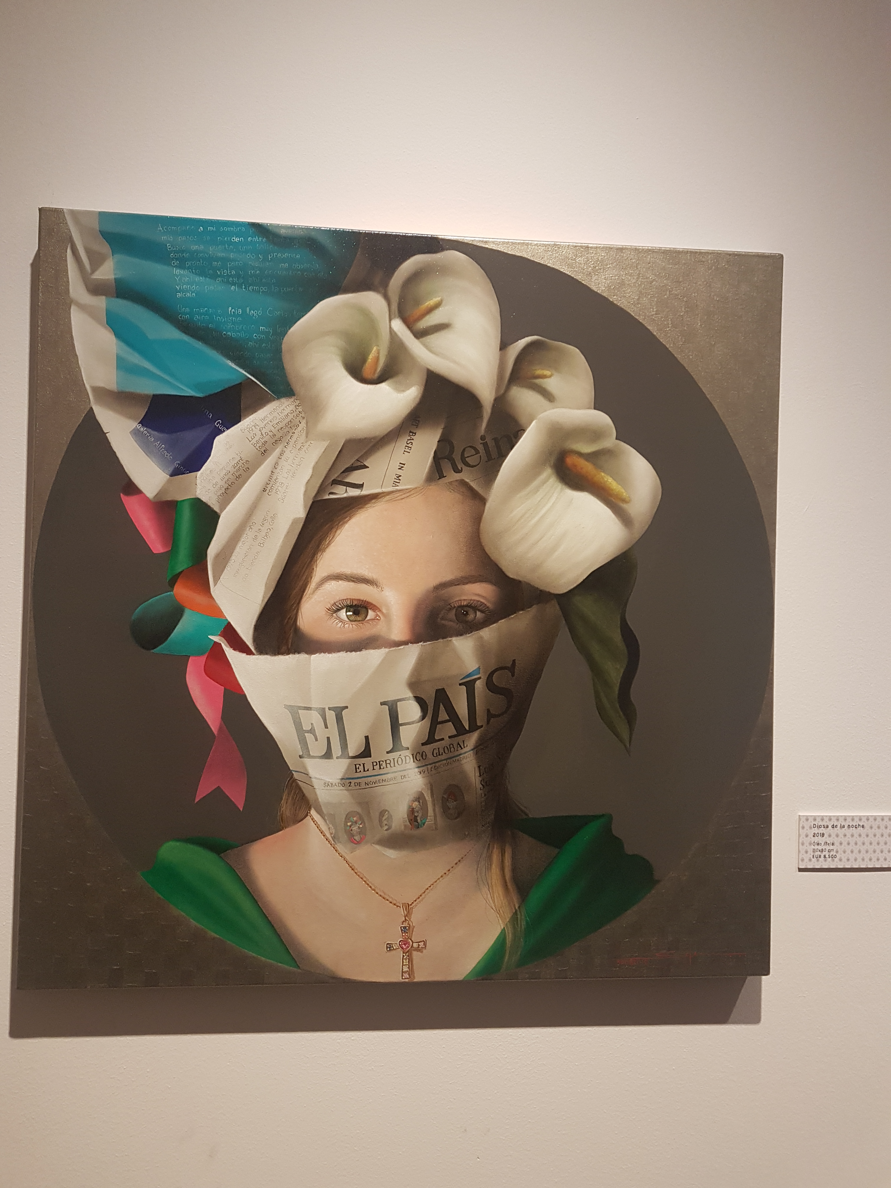 El día que visitamos la exposición estaba el pintor, le vimos contestar preguntas y hacerse fotos con los visitantes. Sus cuadros también estaban en venta.
