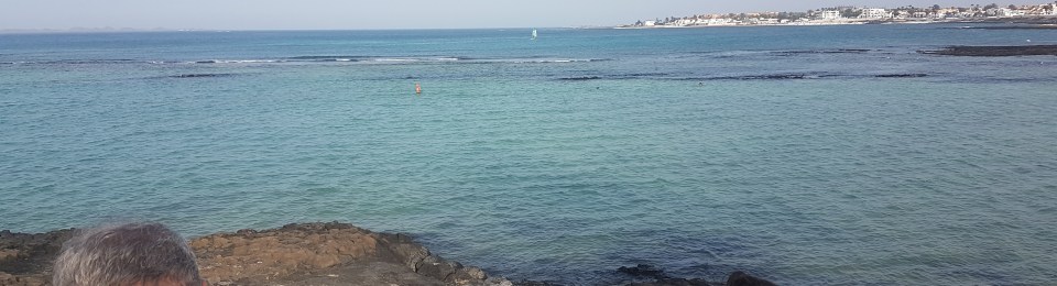 Decidimos ir a la playa de Corralejo, (sin coger coche), al lado del Puertito, con algunas piedras, pero con arena blanca y agua azul – verde. Es una playa pequeñita, es muy bonita, pero ni una ola, (los chicos quieren olas, pero hoy tendrán que disfrutar del color…) Y de las vistas, porque estamos justo enfrente de la Isla de Lobos, uno de nuestros objetivos de Fuerteventura.