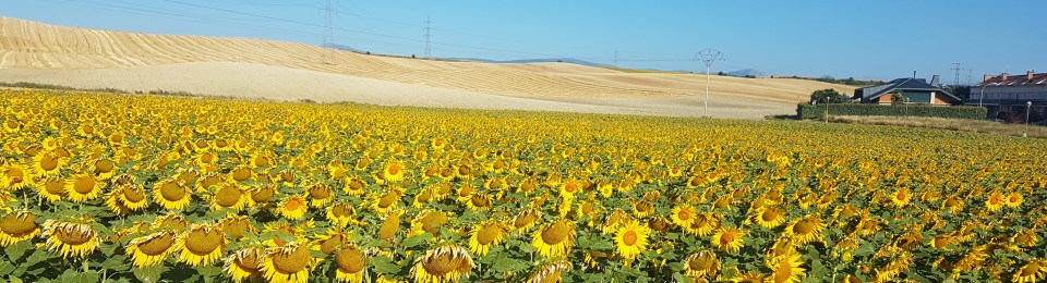 Nada más salir de Pamplona nos encontramos los primeros cultivos de cereales y girasoles.