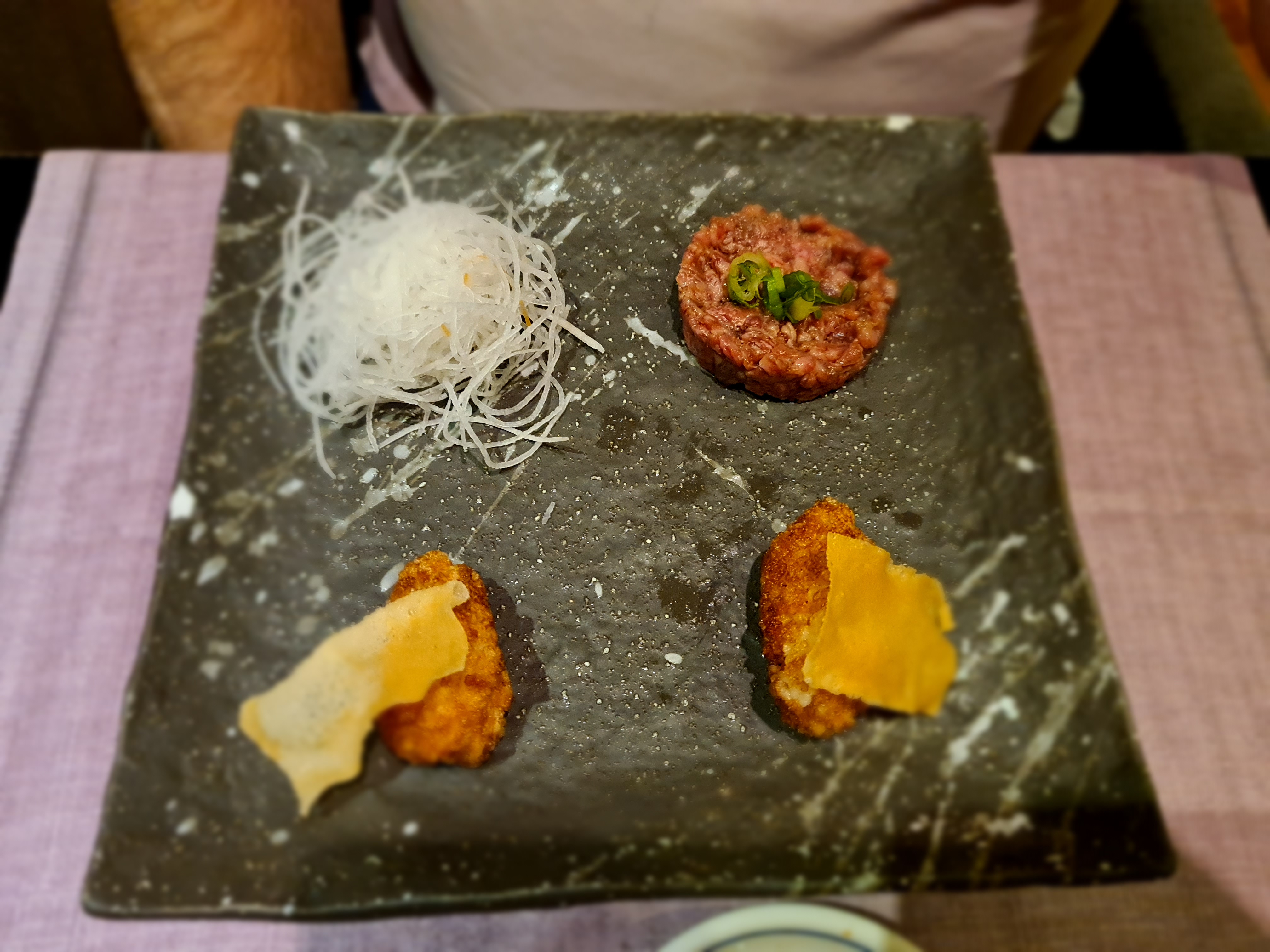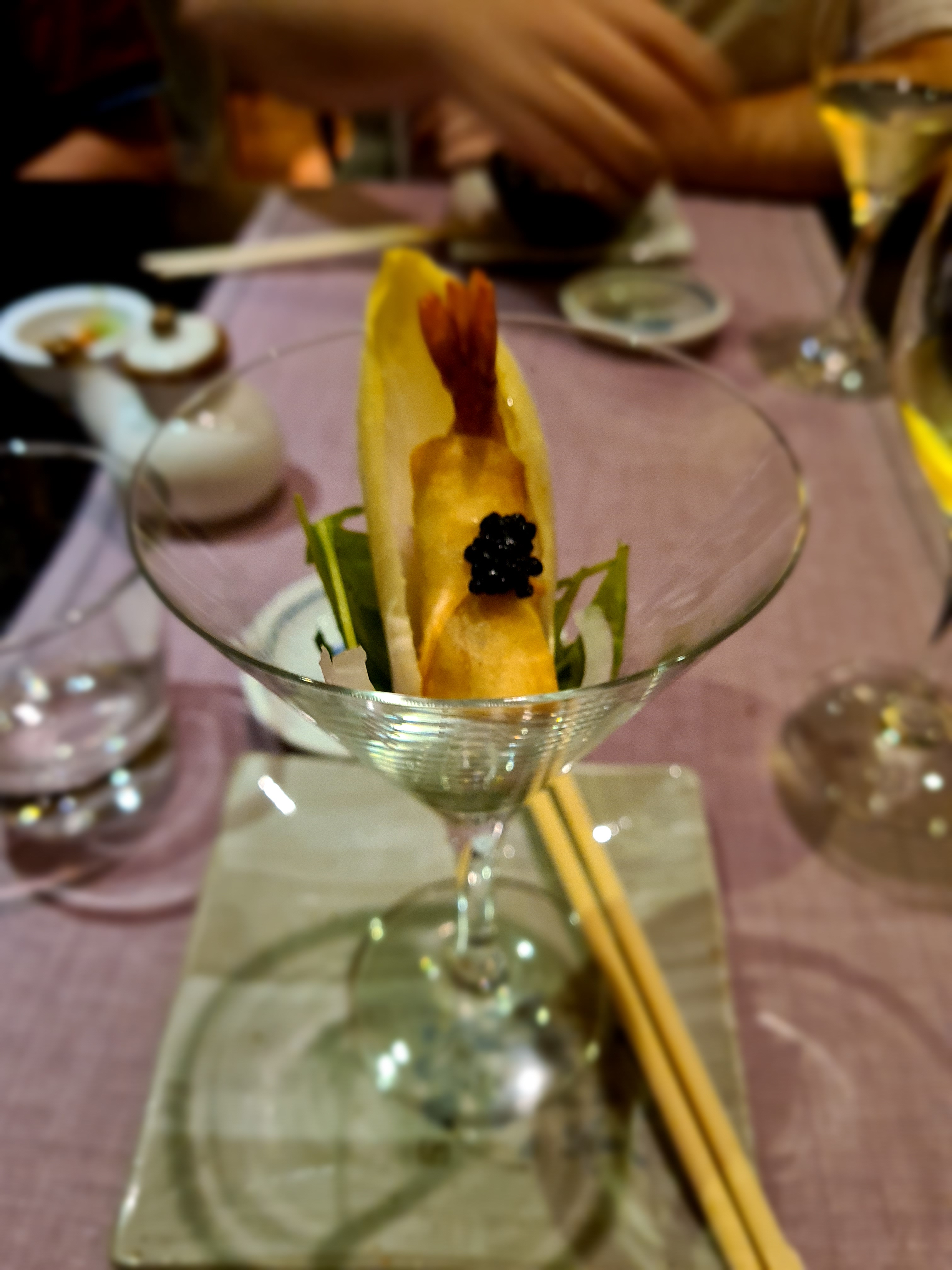 Nos recibieron con una toalla caliente para limpiarnos las manos, costumbre japonesa. Con un pequeño aperitivo, ¿costumbre española?