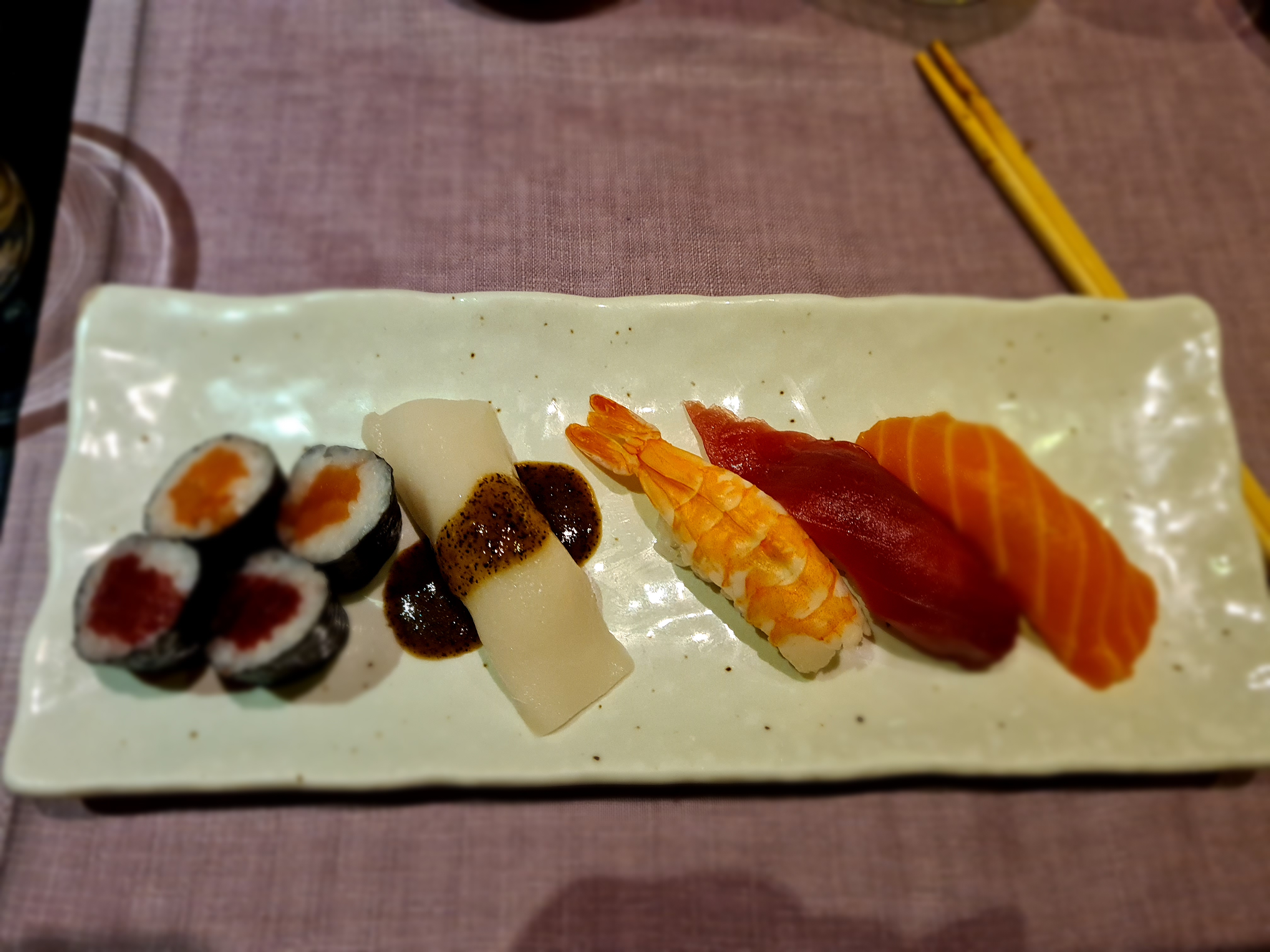 Sushi de salmón, atún, pez mantequilla, ebi y dos piezas de maki de salmón y atún.