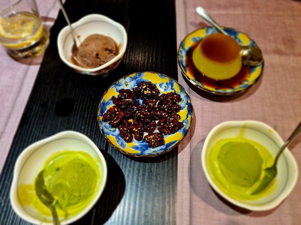Como veis por las fotos también una pinta estupenda. En los dos menús incluían los mismos postres. Helado de té verde, de chocolate y flan de té verde, las nueces venían de extra, que por cierto estaban buenísimas.