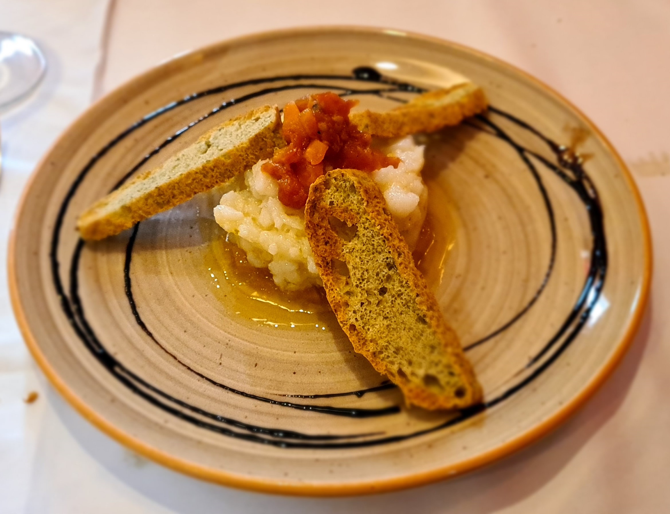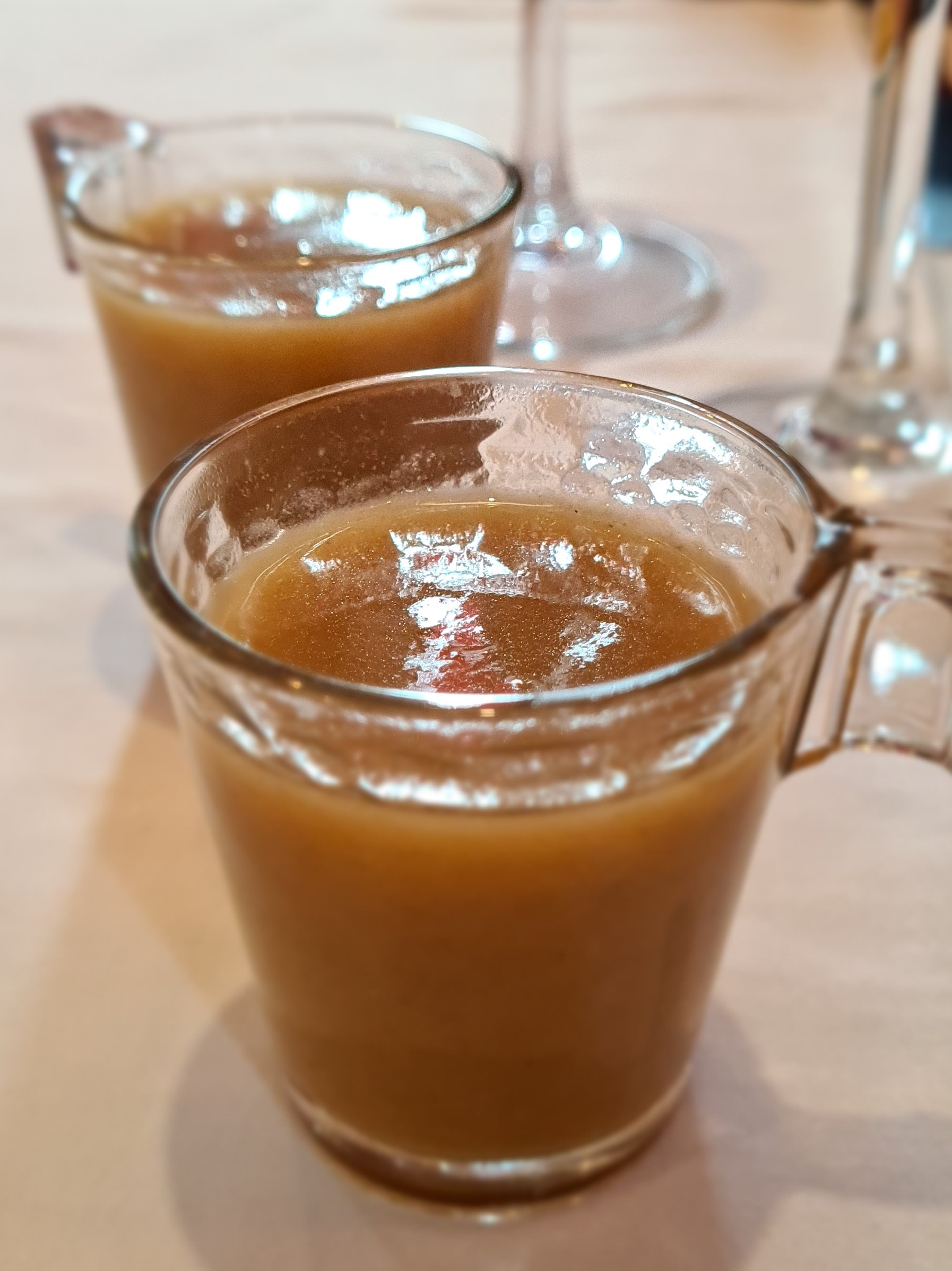 Al compartir el menú ponen dos platos de cada primero, así que pedimos dos primeros diferentes para probarlos. Además mientras llegan los primeros platos te ponen una cremita de patata, que la verdad, estaba buenísima.