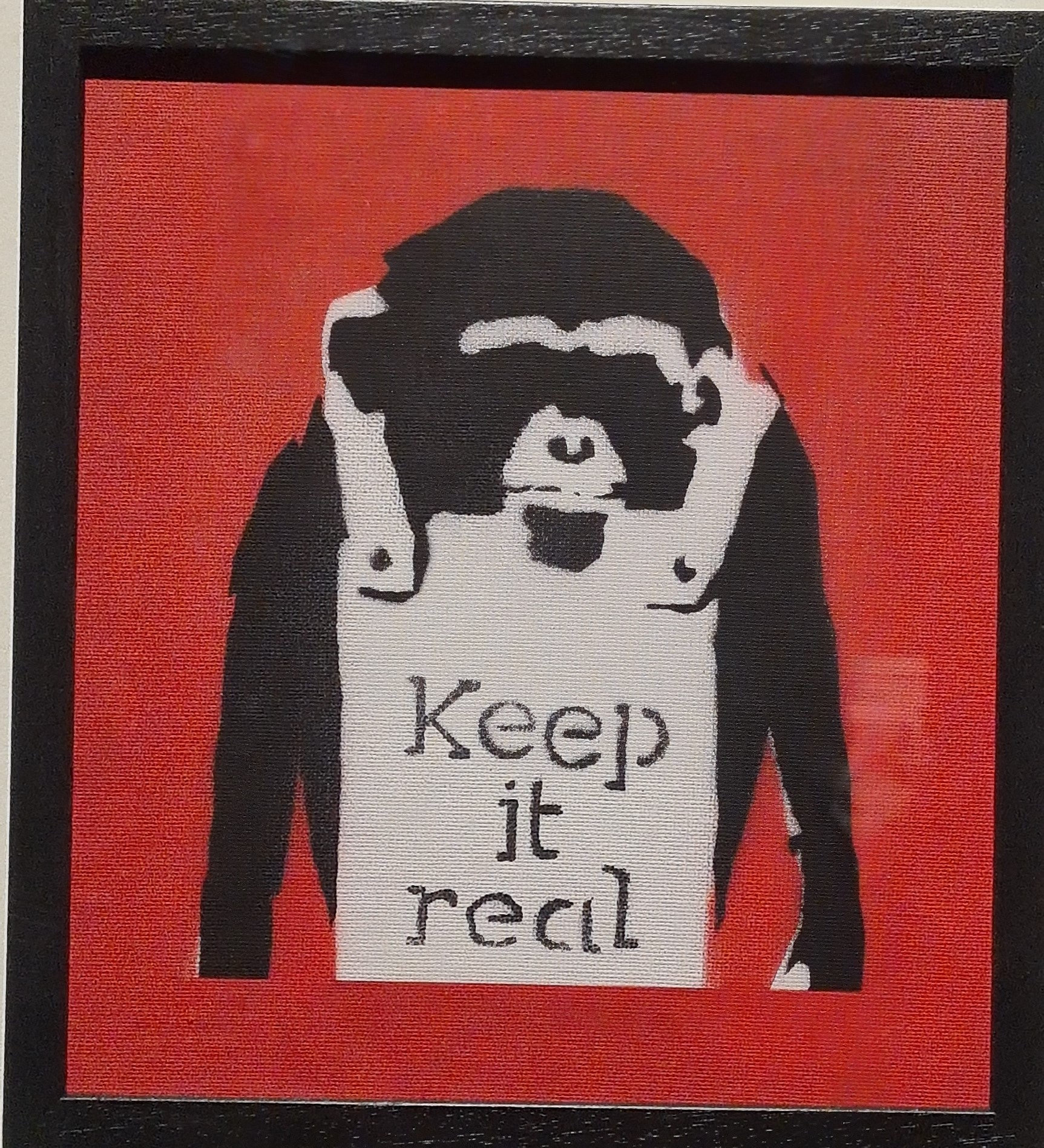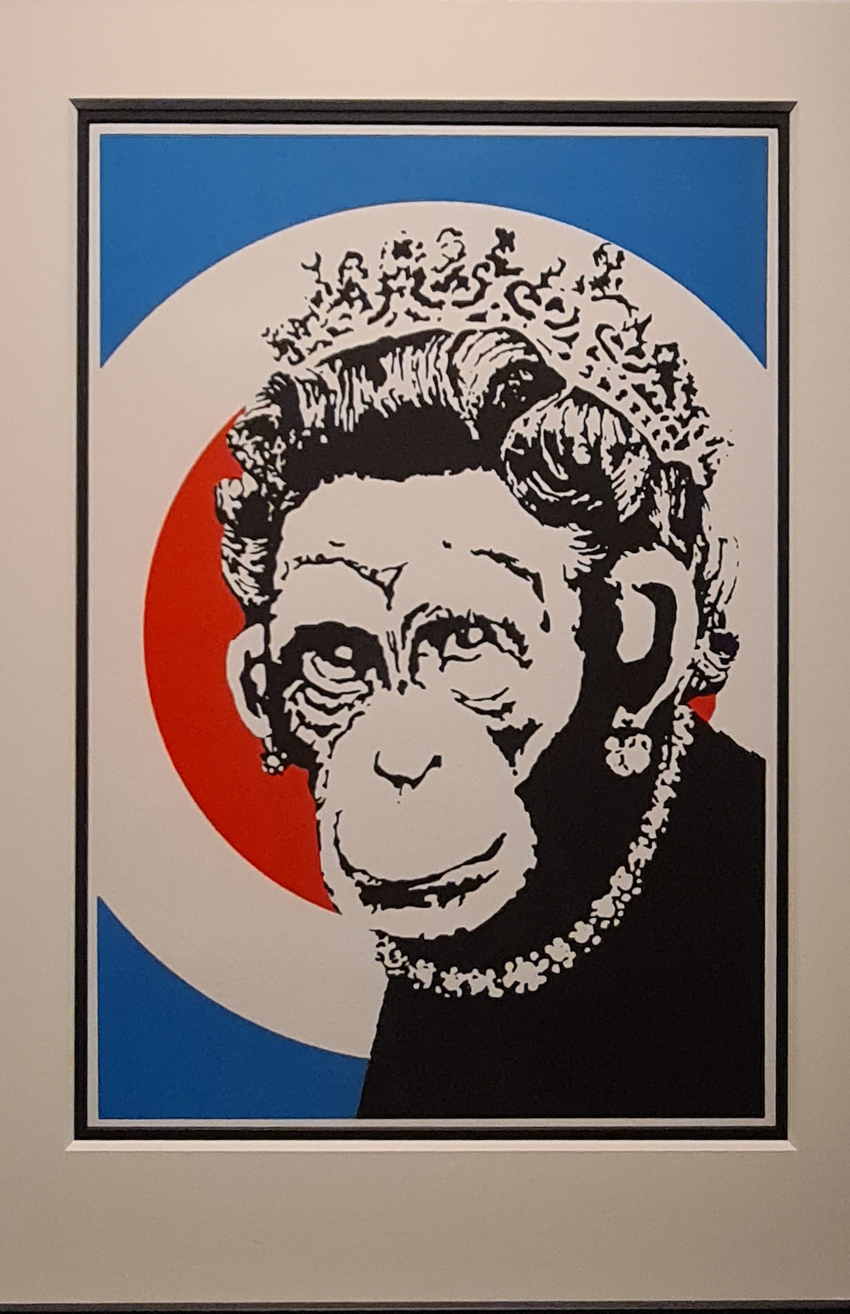 Bansky presentó esta obra en un club londinense, como daba a la calle, el gobierno pidió que se quitara cuando se celebraba el jubileo de la Reina Isabel II. Aquí nos deja una pregunta ¿se burla de la monarquía? Me ha venido fenomenal estar viendo The Crown.