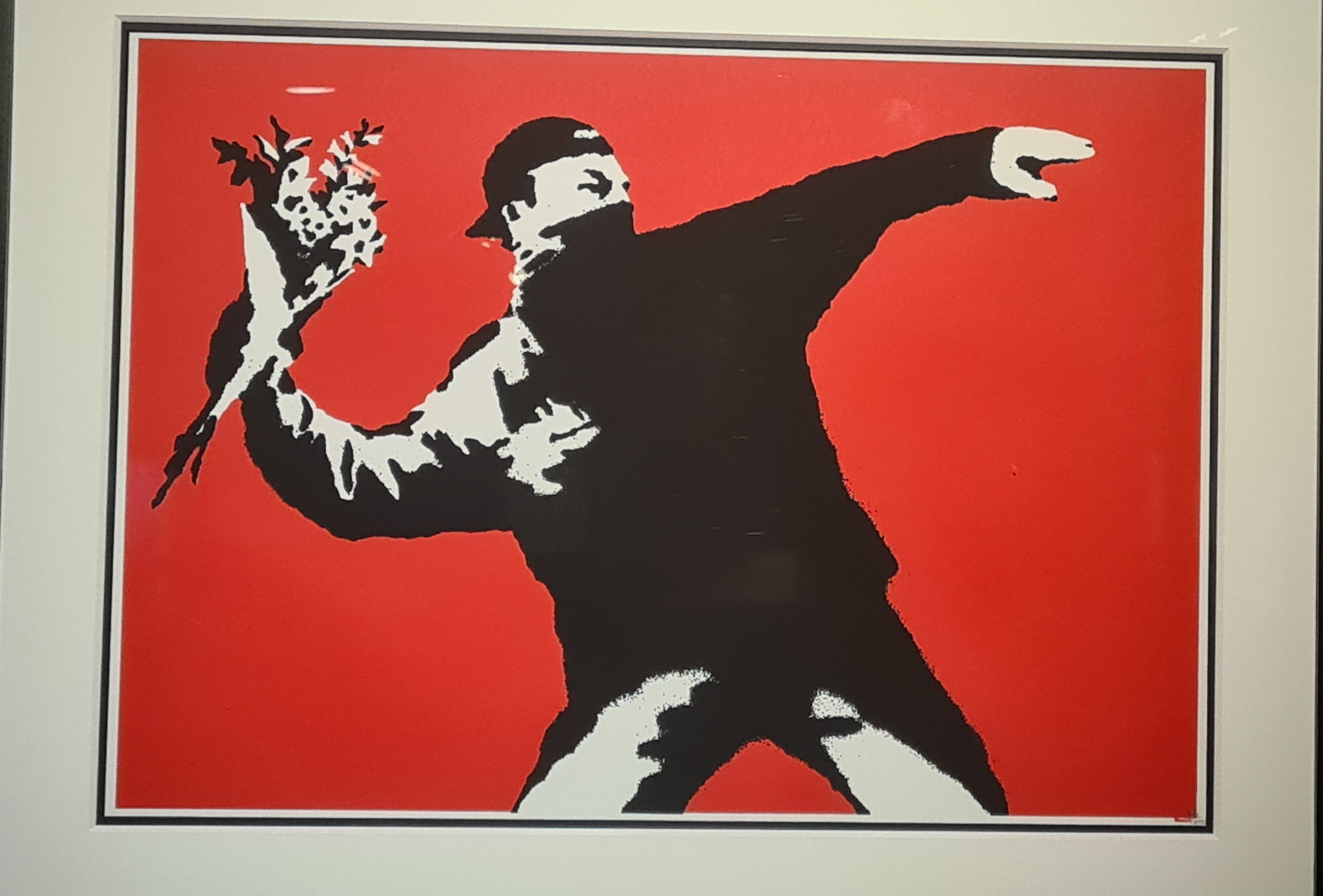 Esta obra es la que presenta la exposición de Bansky en Madrid en el Círculo de Bellas Artes. También se conoce como el lanzador de flores. Otra de las obras más famosas. Un manifestante parece que lanza otra cosa, pero lo que lanza es un ramo de flores… Me encanta!!! Defiende que las protestas, los cambios se deben conseguir pacíficamente, de otra forma se generará más violencia. O a lo mejor que lanzar flores resulta inútil para protestar contra el capitalismo…. Yo creo que me quedo con la primera que os he contado😉