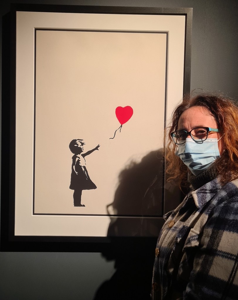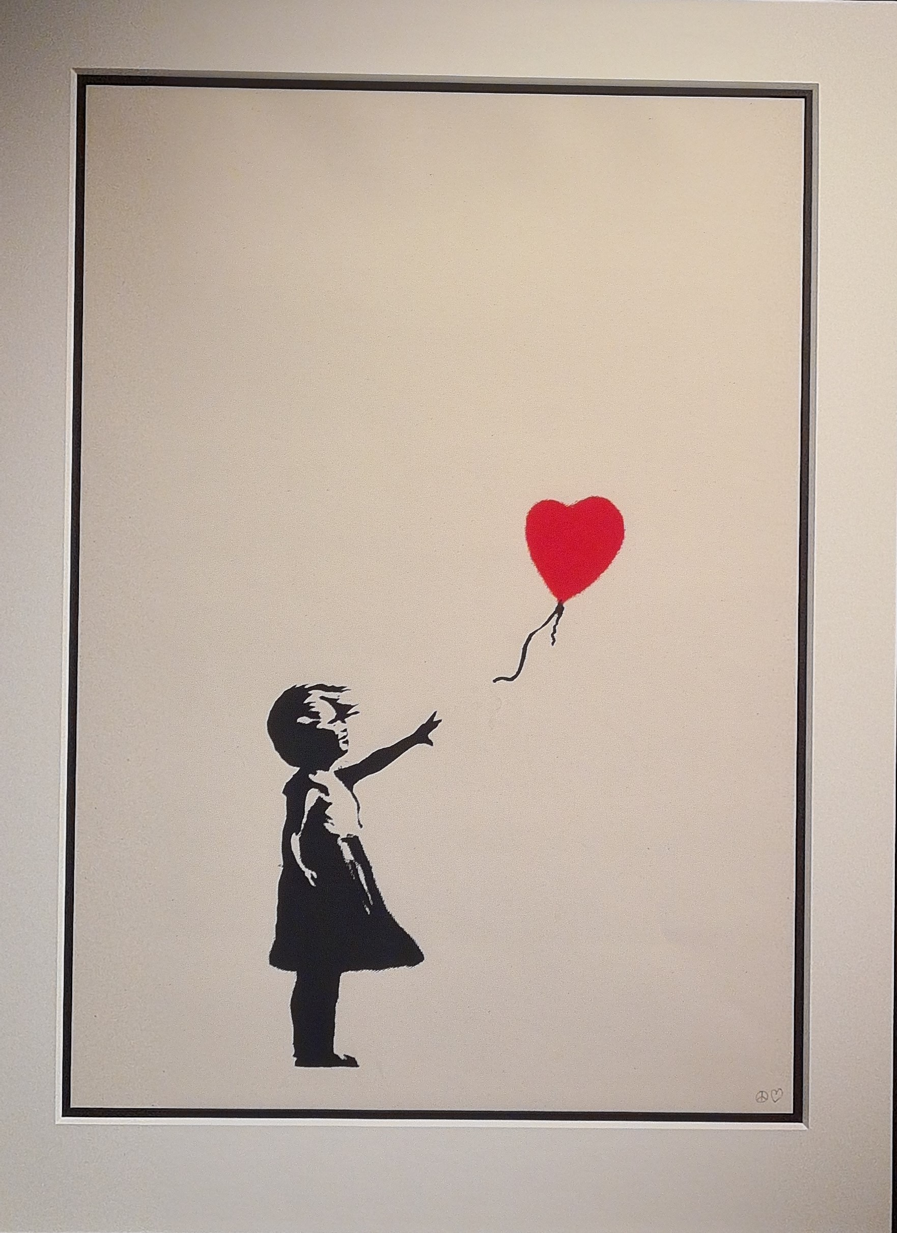 Por último os enseño la que quizá sea su obra más conocida, la de la niña que suelta el globo en forma de corazón. Se pasó una encuesta donde salió que es una de las obras de arte favorita de los británicos. Cada uno le da una interpretación según el sentimiento que inspira…. Pero no es eso lo que quiere Bansky con sus obras…