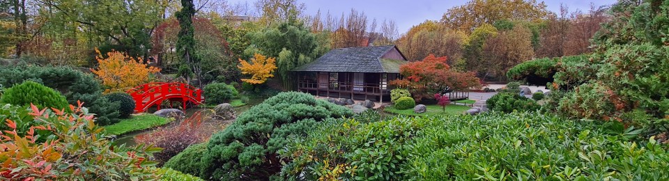 El Jardín Japonés está precioso, intenso el otoño por sus caminos. Empieza a llover… Es preciosísimo. Con Puente Japonés, Jardín Zen y su Pabellón de Té junto al estanque.