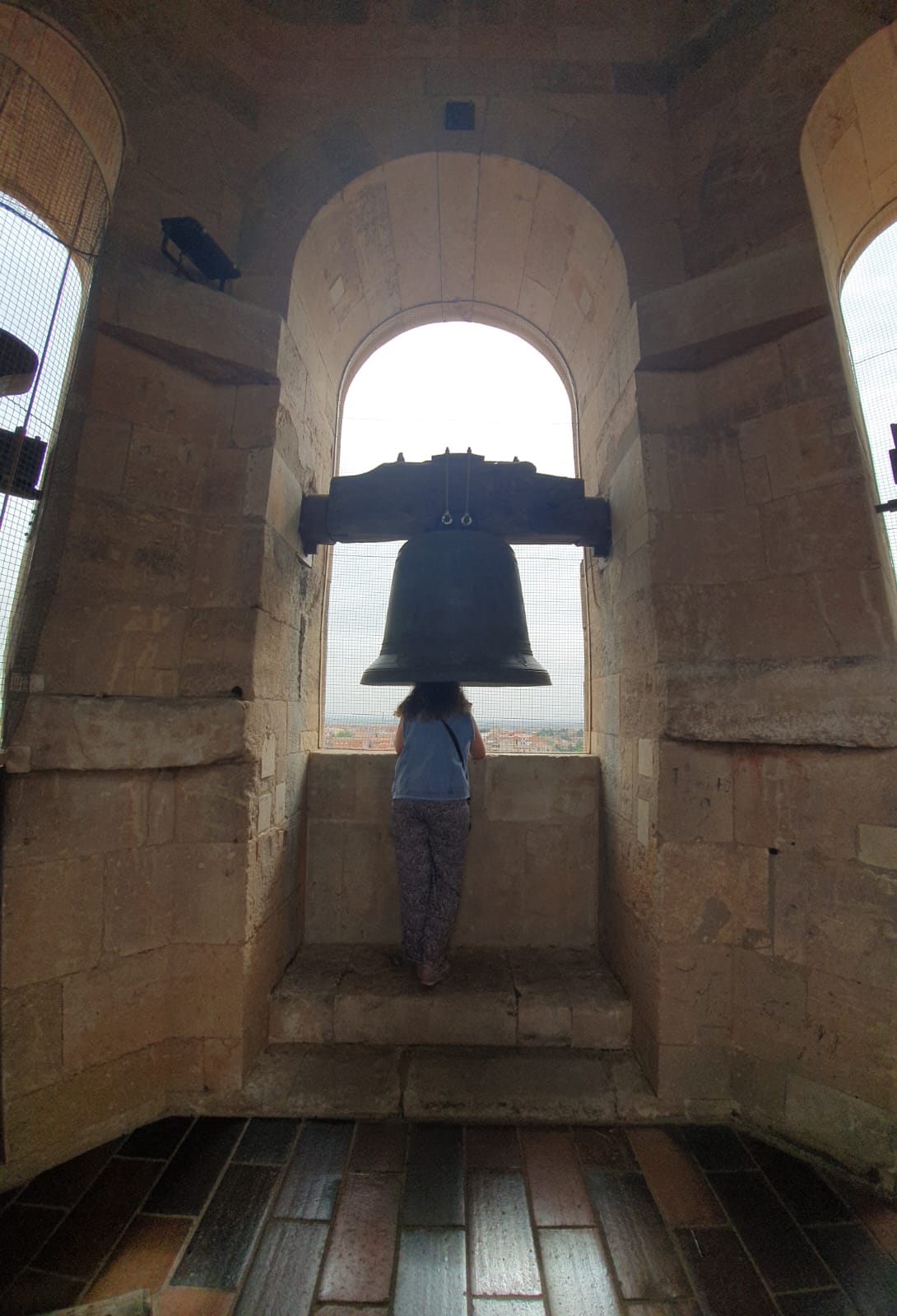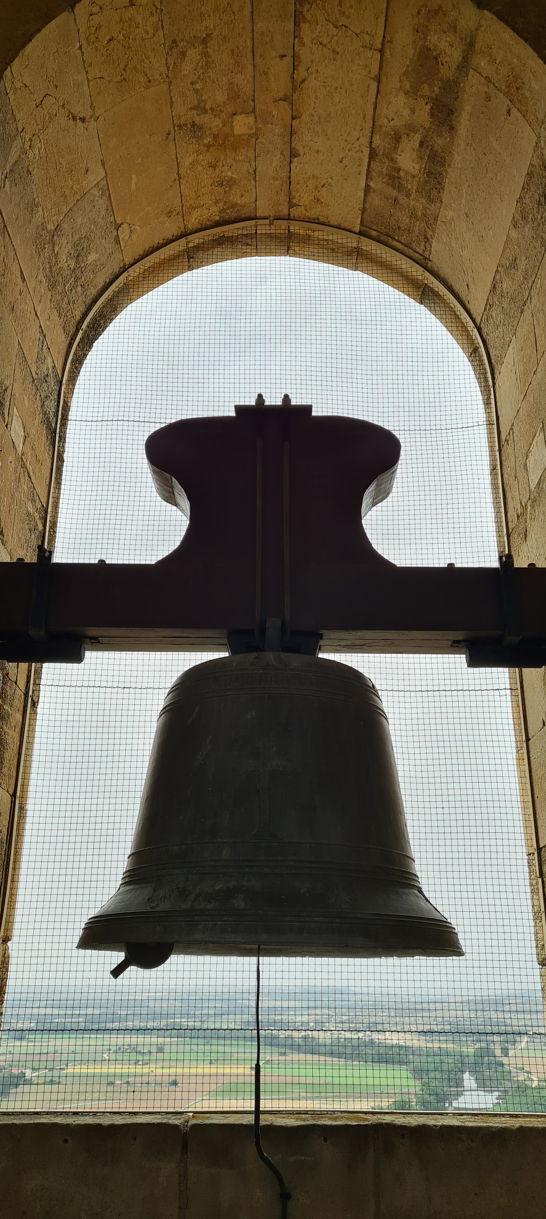 La última parada es la parte más alta de la torre, aquí están las 11 campanas que marcan cada hora puntualmente. Ahora todas tienen un mecanismo electrico para hacerlas sonar. «María» es la campana más grande, pesando 400Kg. Además de las campanas, las vistas desde allí son muy bonitas.