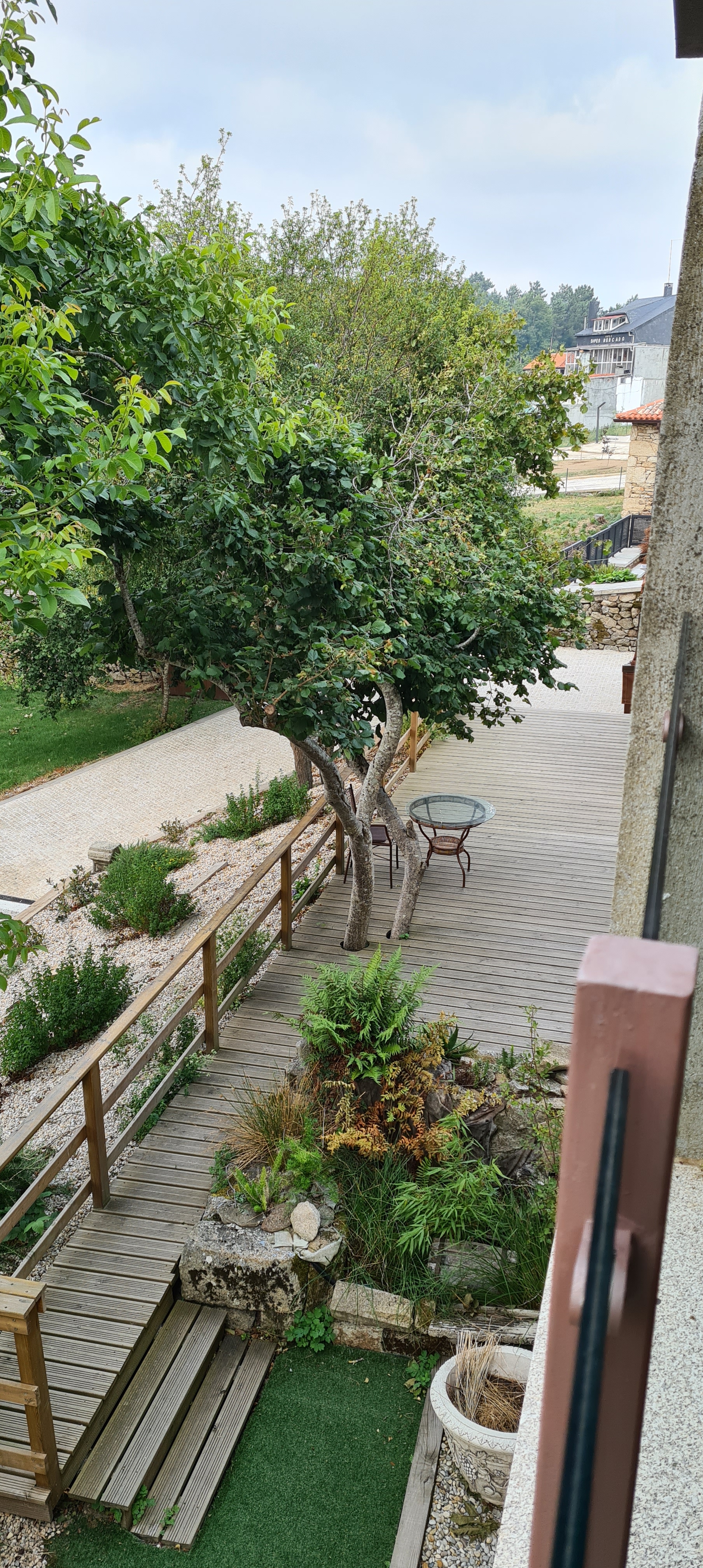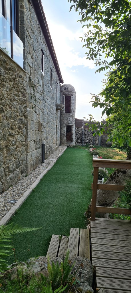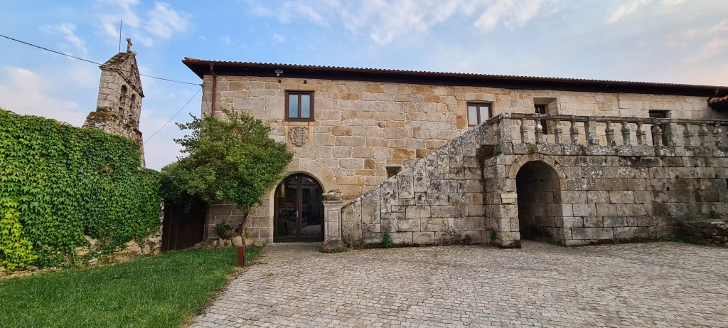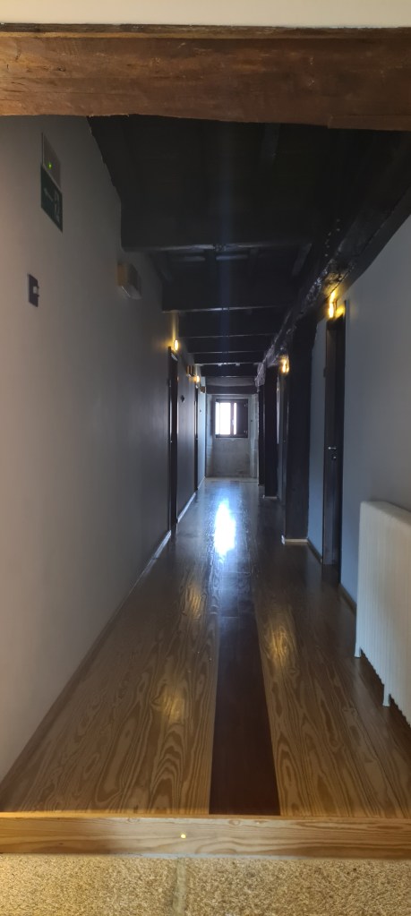 Antes de llegar al tercer mirador del día, vamos a nuestro coqueto alojamiento en la Casa Rural Reitoral de Parada en Parada do Sil. Es la antigua casa rectoral con 7 habitaciones, todas con baño. Estamos rodeados de historia con un toque muy actual. Nuestra habitación era una doble superior con bañera de hidromasaje y teníamos desayuno. El alojamiento tiene aparcamiento. El exterior es precioso, todo de grandes piedras, incluso la escalera principal del edificio. Está en el centro urbano.
