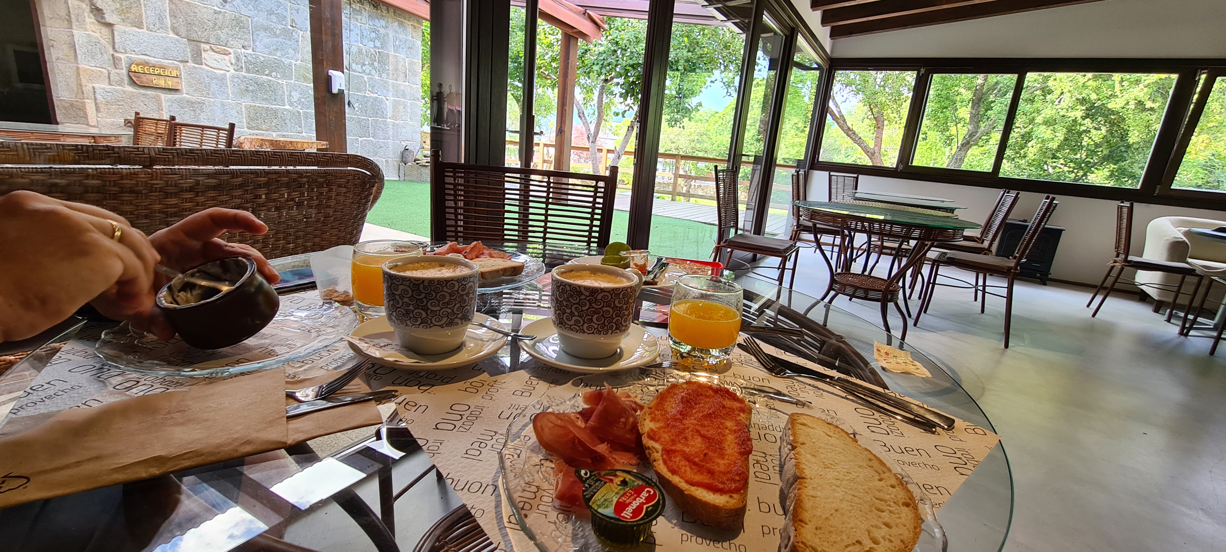 El hotel cuenta con un restaurante que cuenta con cierta fama, pero nosotros no lo probamos, por el día estábamos visitando otros sitios y para la cena no podíamos con una «gran cena» preferimos picar algo en alguno de los bares de Parada de Sil.