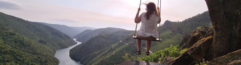 Aunque no soy capaz de darme mucho impulso porque la altura impresiona, es un momento mágico, realmente inolvidable, todo el Cañón del Sil está a mis pies, me siento afortunada.