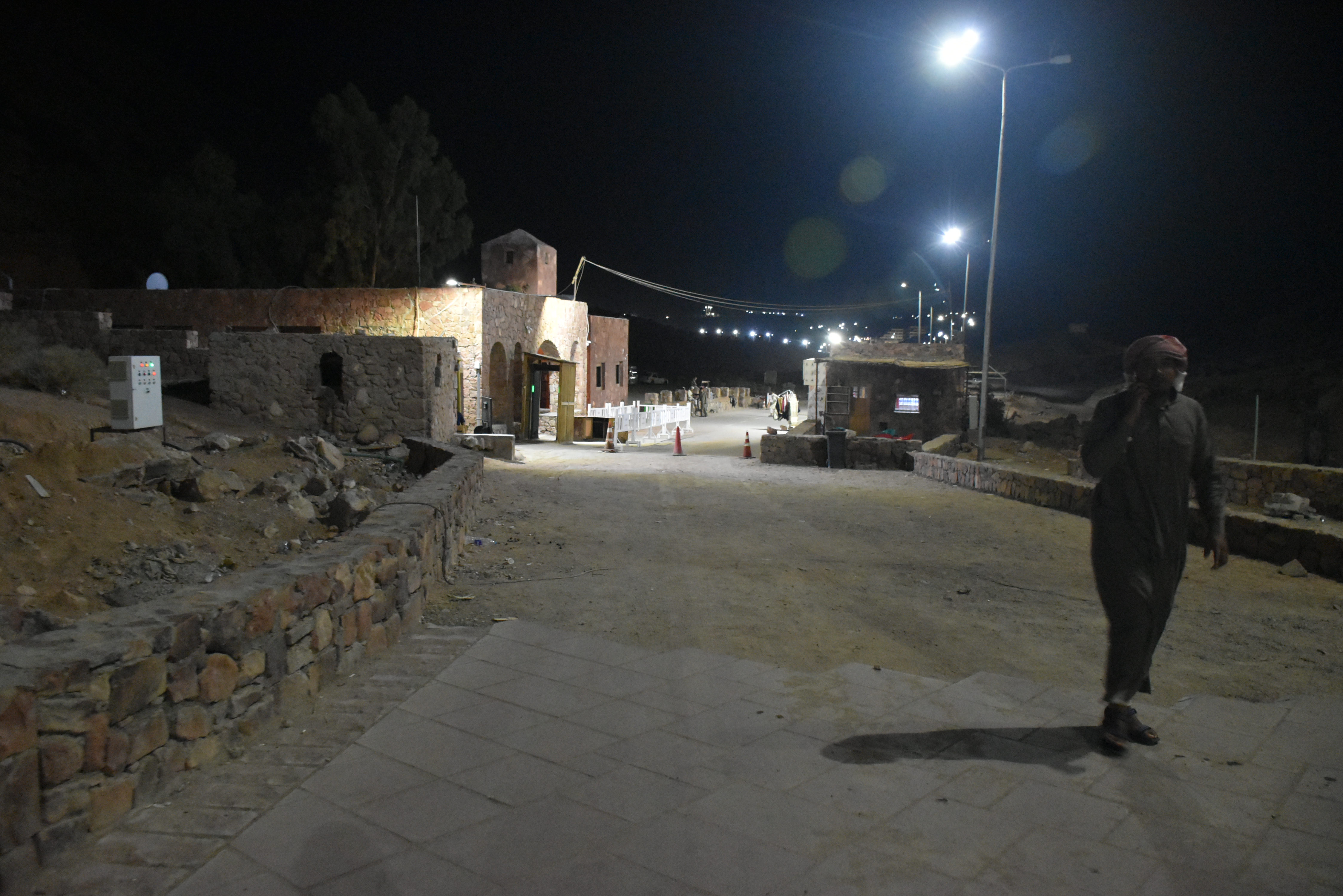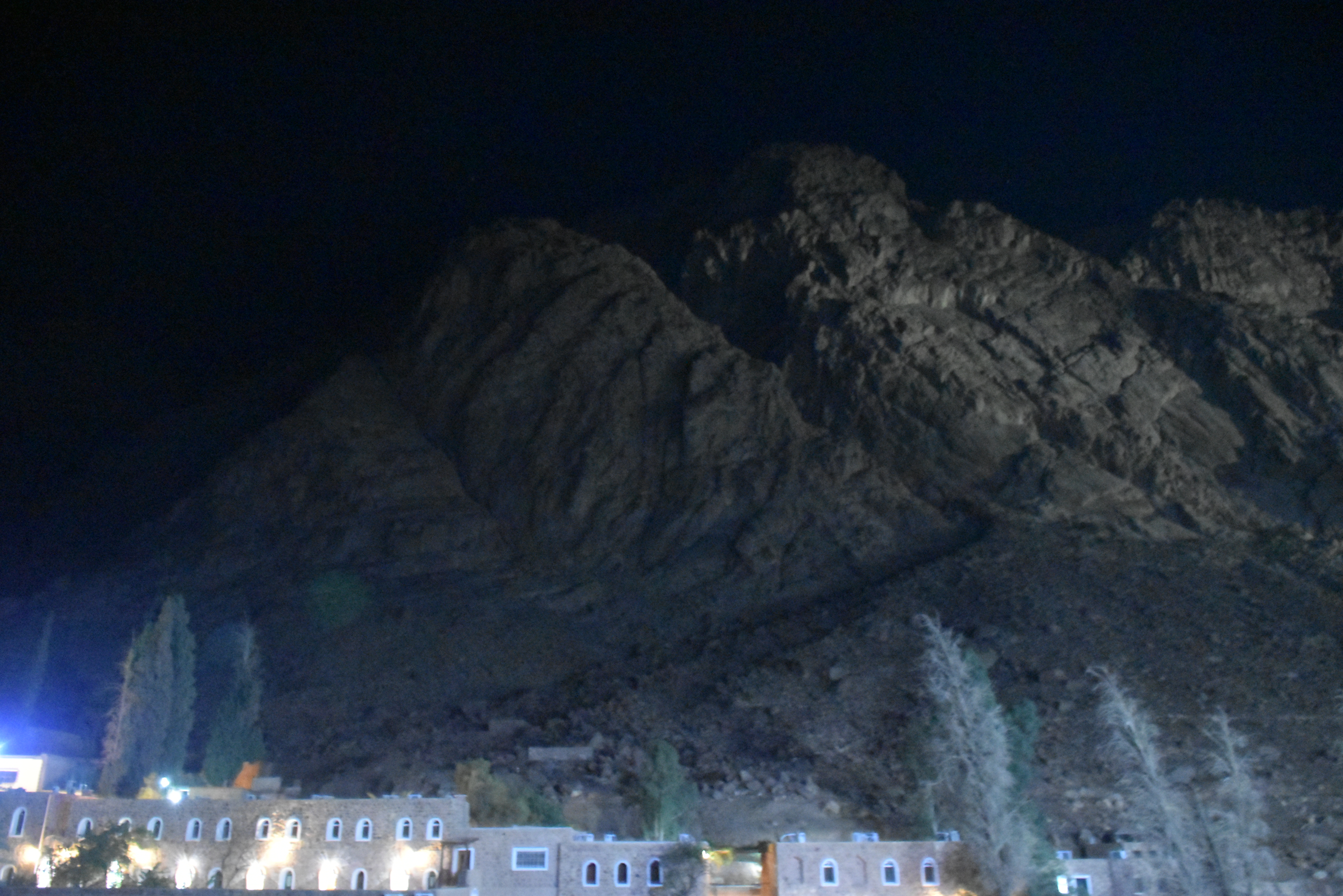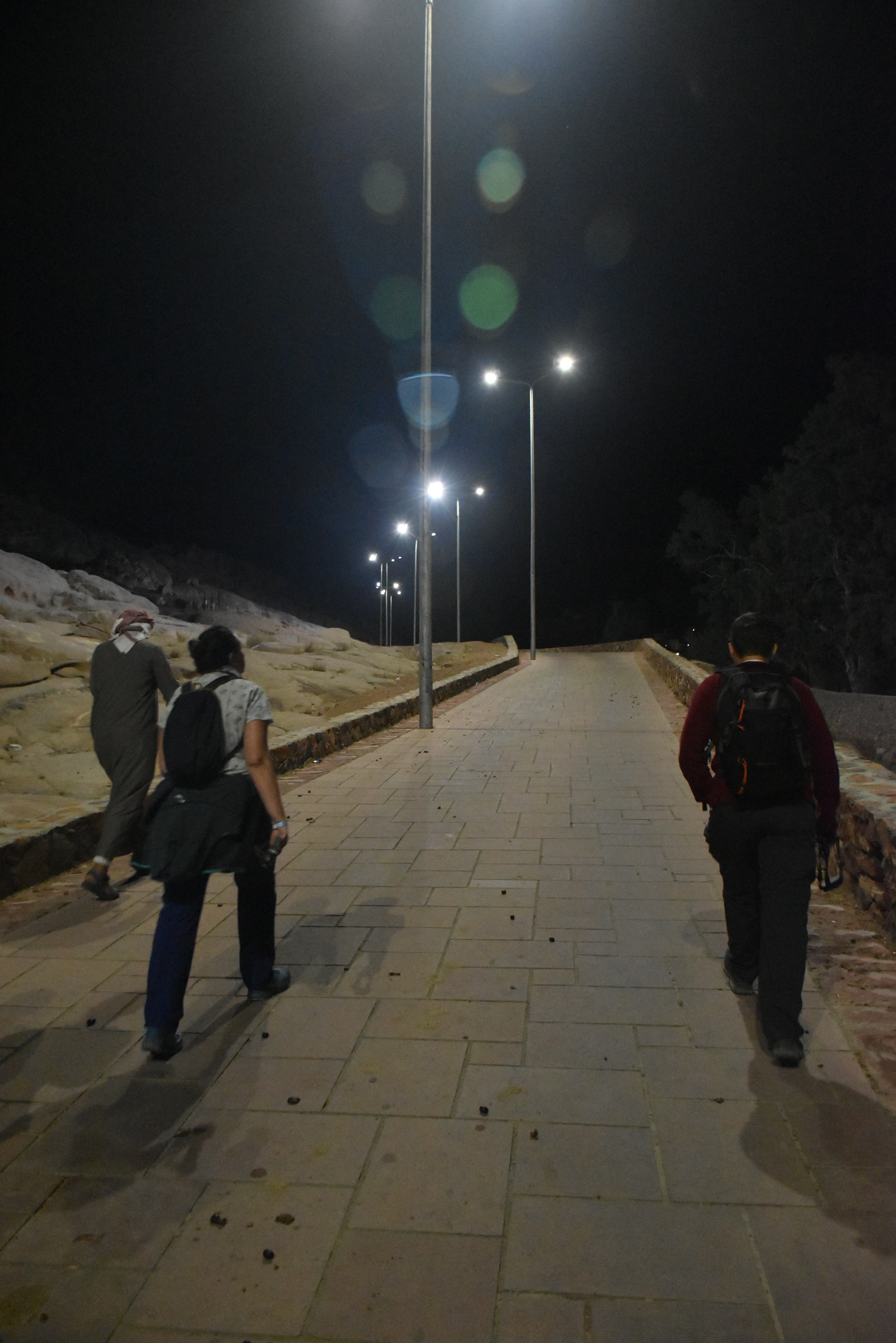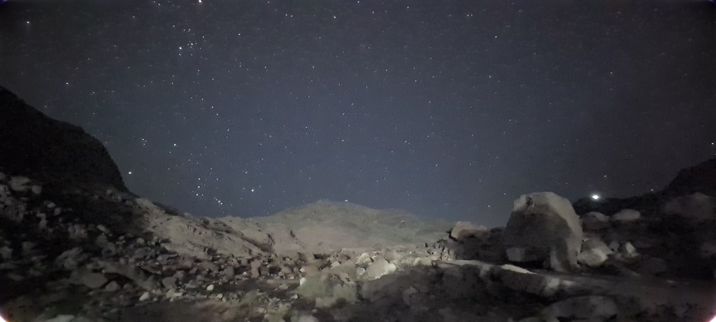 A las 10 de la noche nos vienen a recoger al hotel para hacer dos horas en furgoneta. A las 24 horas hacemos una breve parada para echar gasolina, comprar algo de comida y seguimos en ruta. A los 2am llegamos al punto de control del Monte Sinaí, que da acceso al Monasterio de Santa Catalina y a la Montaña de Moisés. Allí nos espera el guía beduino que tiene que acompañarnos hasta la cima.