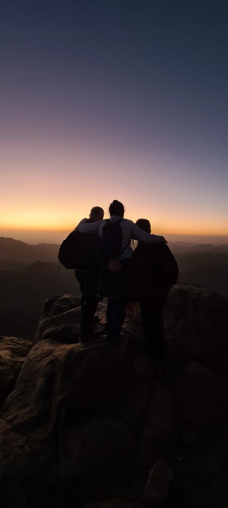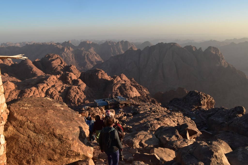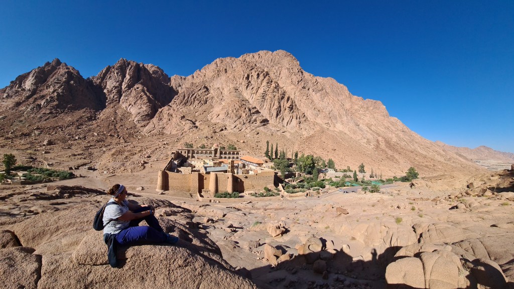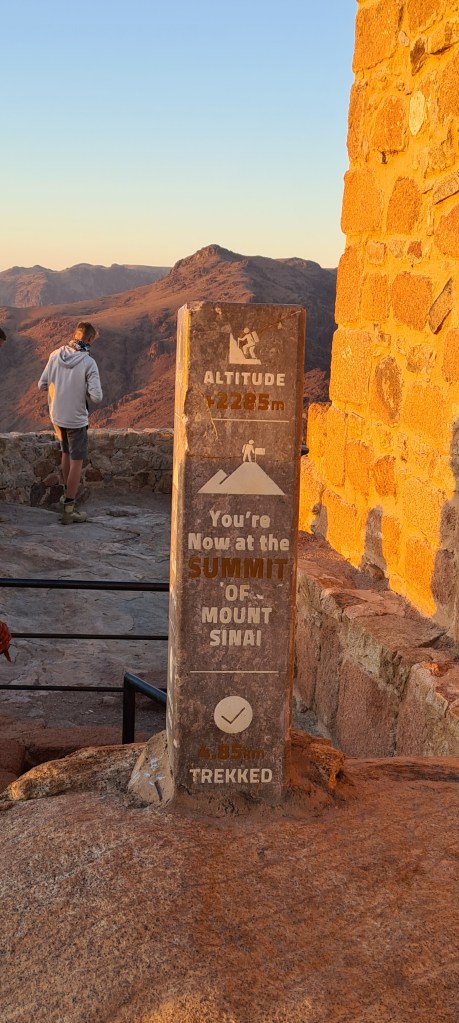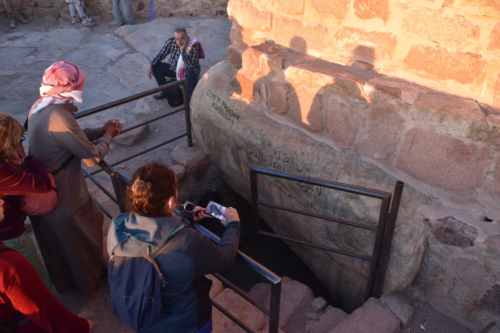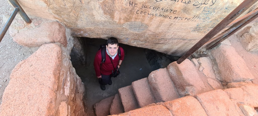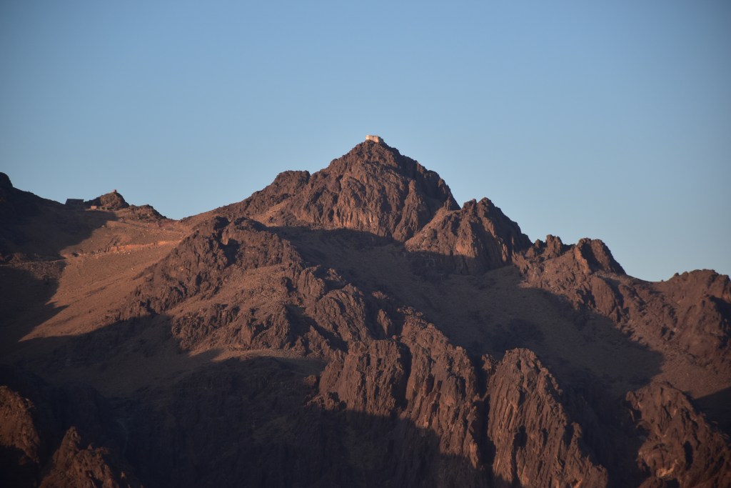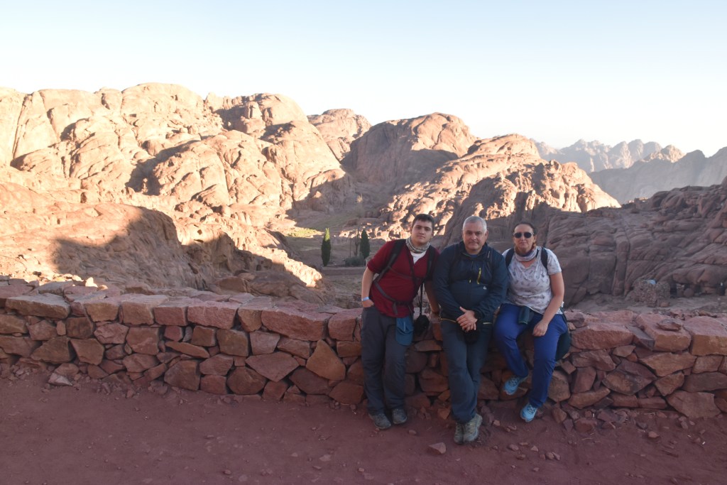 UN POCO DE HISTORIA: Estamos en la cima de la Montaña de Moisés ¿Cuántas veces habré imaginado este lugar? Aquí Dios entregó a Moisés las Tablas de la Ley, lo que se consideró en su esencia la constitución del pueblo de Israel. Moisés estuvo 40 días y 40 noches en la cueva que se conserva. Al bajar, las Tablas de la Ley se guardaron en el Arca de la Alianza. Realmente no recibió solo 10 Mandamientos, sino que recibió 613; el cristianismo mucho tiempo después mantuvo los Mandamientos de Moisés, reduciéndolos a 10. También bajó de esta montaña los planos del Templo de Salomón. Los primeros cinco libros de escrituras judías se añadieron a la Ley de Moisés o La Torá. En el Islam este lugar es importante porque aparece en el Corán gracias a uno de sus profetas Musa (Moisés). Por eso este lugar este lugar es sagrado para las tres religiones: judaísmo, islam y cristianismo. Estoy ahí, en ese mismo lugar que nombra la Biblia, La Torá y el Corán. ¡Me parece un regalo!