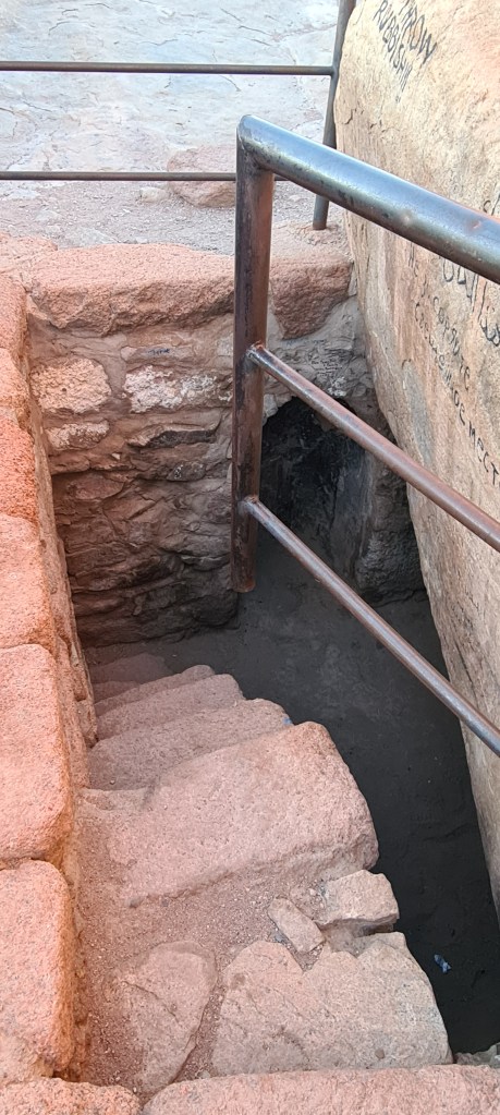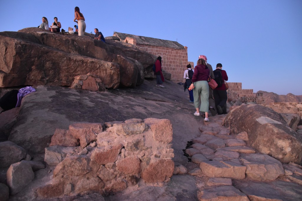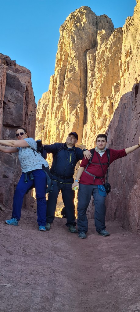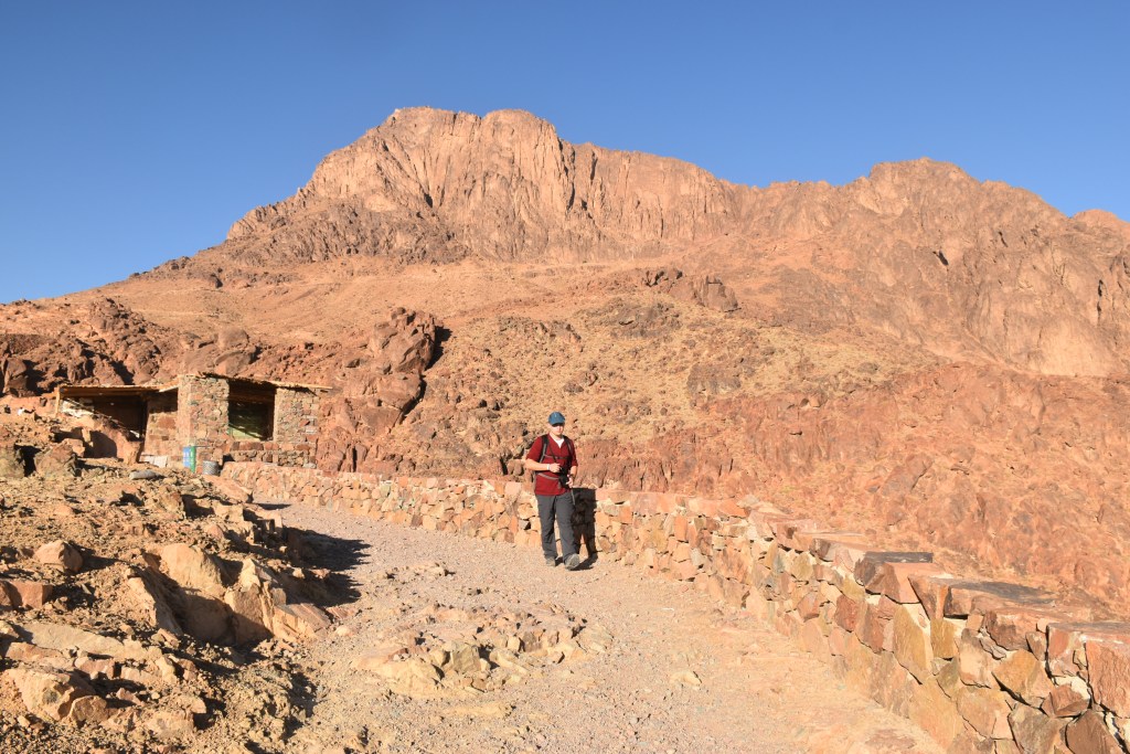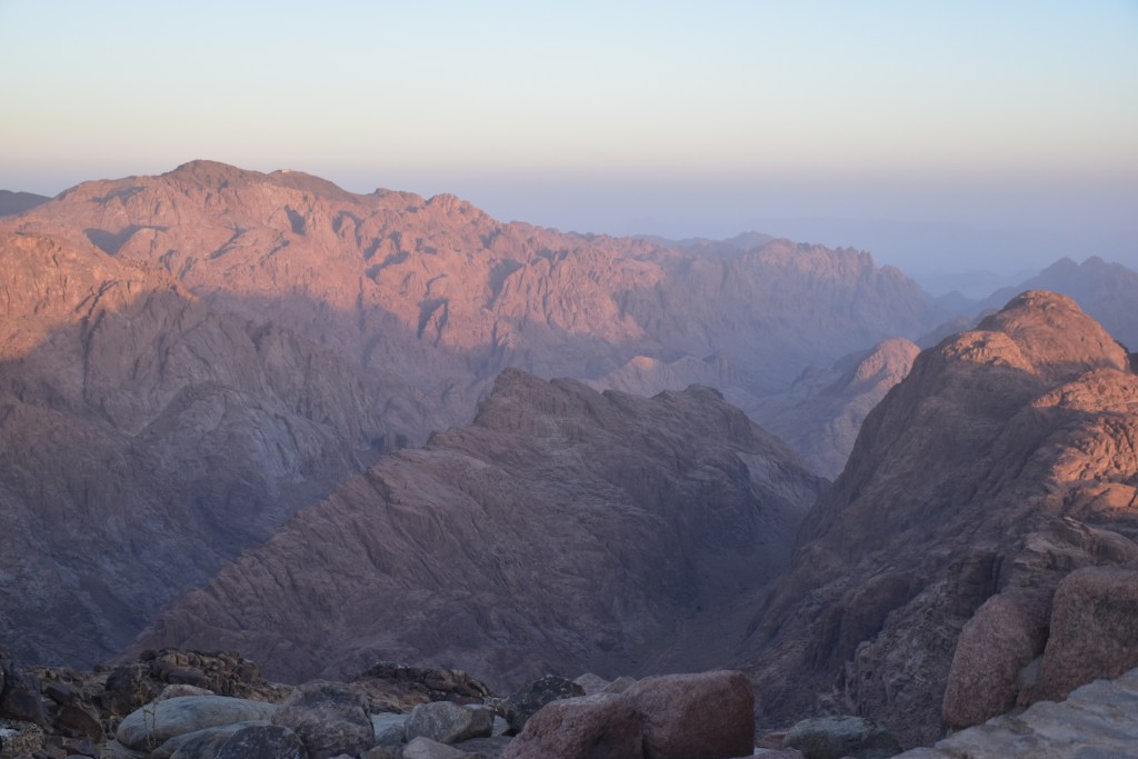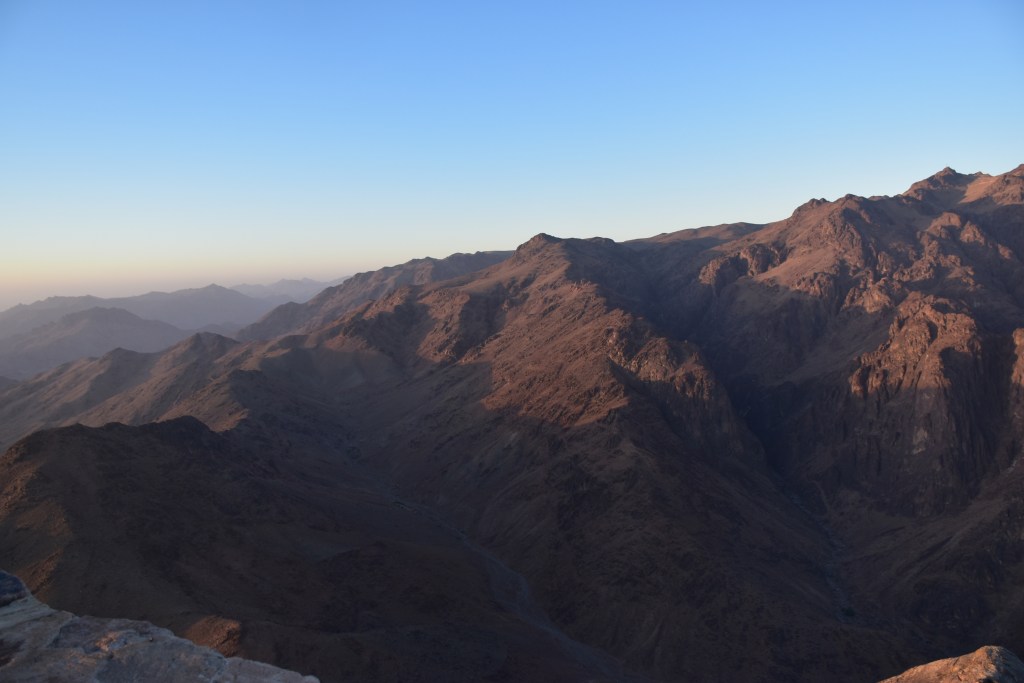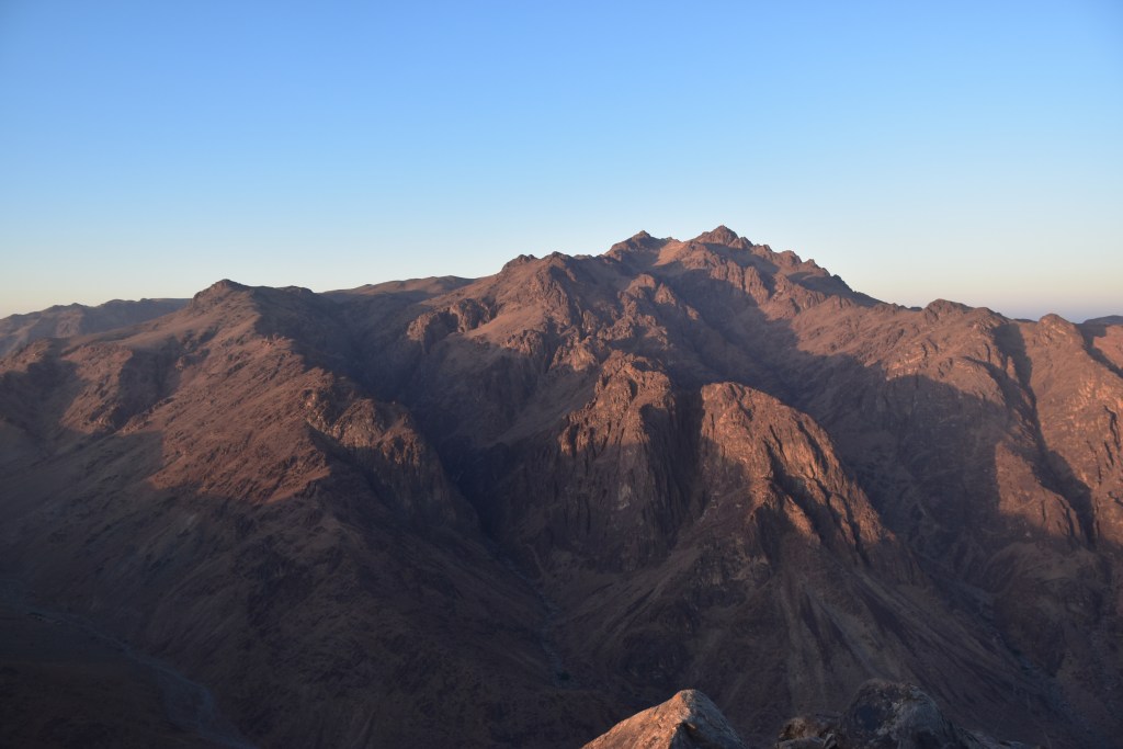 UN POCO DE HISTORIA: Estamos en la cima de la Montaña de Moisés ¿Cuántas veces habré imaginado este lugar? Aquí Dios entregó a Moisés las Tablas de la Ley, lo que se consideró en su esencia la constitución del pueblo de Israel. Moisés estuvo 40 días y 40 noches en la cueva que se conserva. Al bajar, las Tablas de la Ley se guardaron en el Arca de la Alianza. Realmente no recibió solo 10 Mandamientos, sino que recibió 613; el cristianismo mucho tiempo después mantuvo los Mandamientos de Moisés, reduciéndolos a 10. También bajó de esta montaña los planos del Templo de Salomón. Los primeros cinco libros de escrituras judías se añadieron a la Ley de Moisés o La Torá. En el Islam este lugar es importante porque aparece en el Corán gracias a uno de sus profetas Musa (Moisés). Por eso este lugar este lugar es sagrado para las tres religiones: judaísmo, islam y cristianismo. Estoy ahí, en ese mismo lugar que nombra la Biblia, La Torá y el Corán. ¡Me parece un regalo!