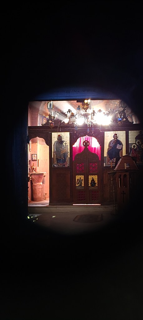 La vista es increíble, ha merecido la pena el esfuerzo. Además de la cueva donde estuvo Moisés, hay una pequeña mezquita y una pequeña iglesia (que podemos ver desde el ojo de la cerradura.
