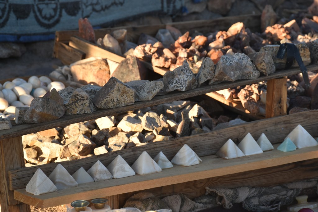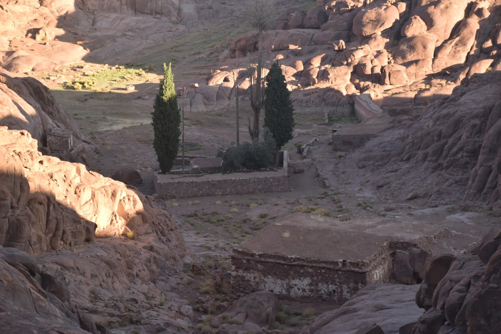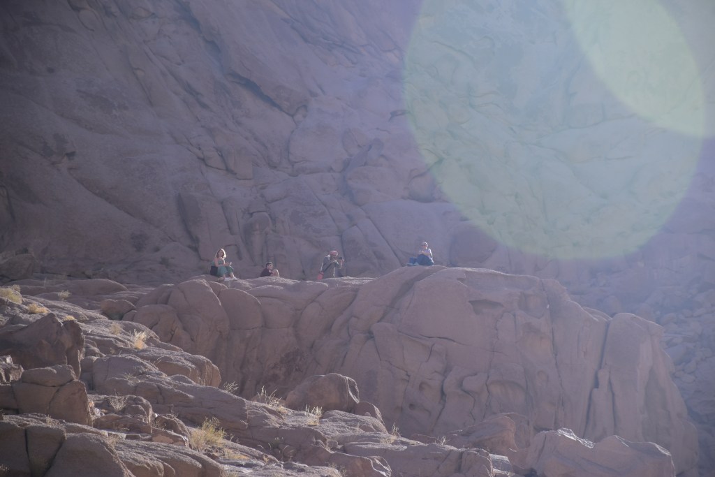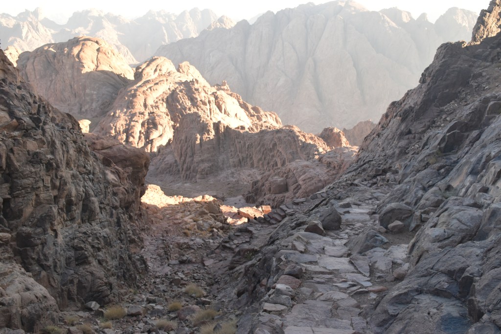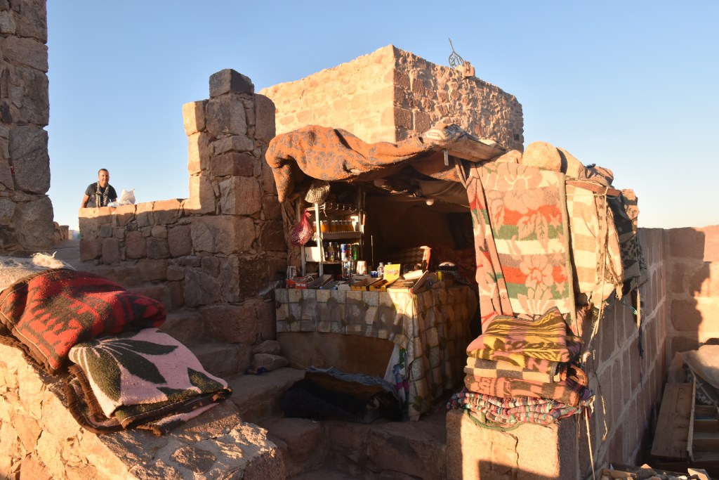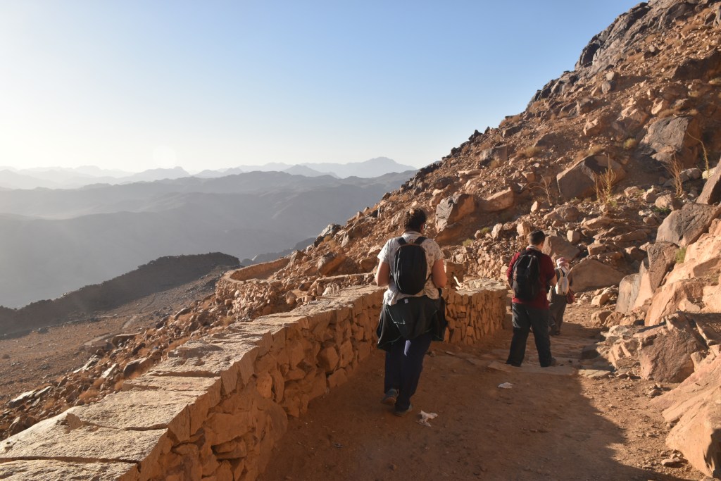 Tenemos que empezar a bajar, lo hacemos en una hora y media más o menos. Bajando empezamos a ser conscientes de lo que hemos subido durante la noche, solo viendo cada paso que damos y el cielo estrellado maravilloso, es en este momento cuando nos damos cuenta de cómo ha sido el camino. Volvemos a pasar por los cafés que vimos de noche con su venta de piedras, algunas de ellas dicen que tienen las huellas de la zarza milagrosa, que es la forma en la que se apareció Dios a Moisés la primera vez.
