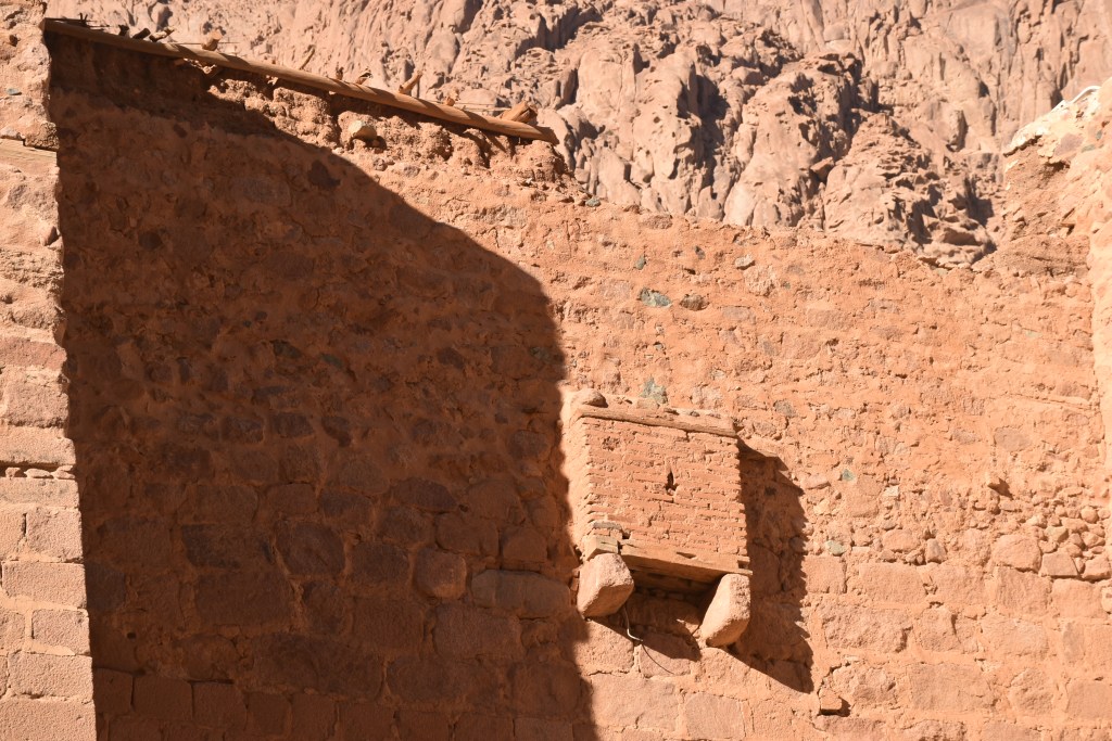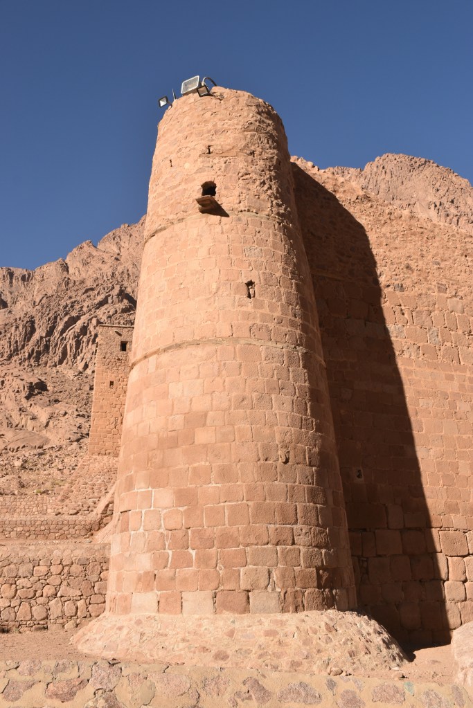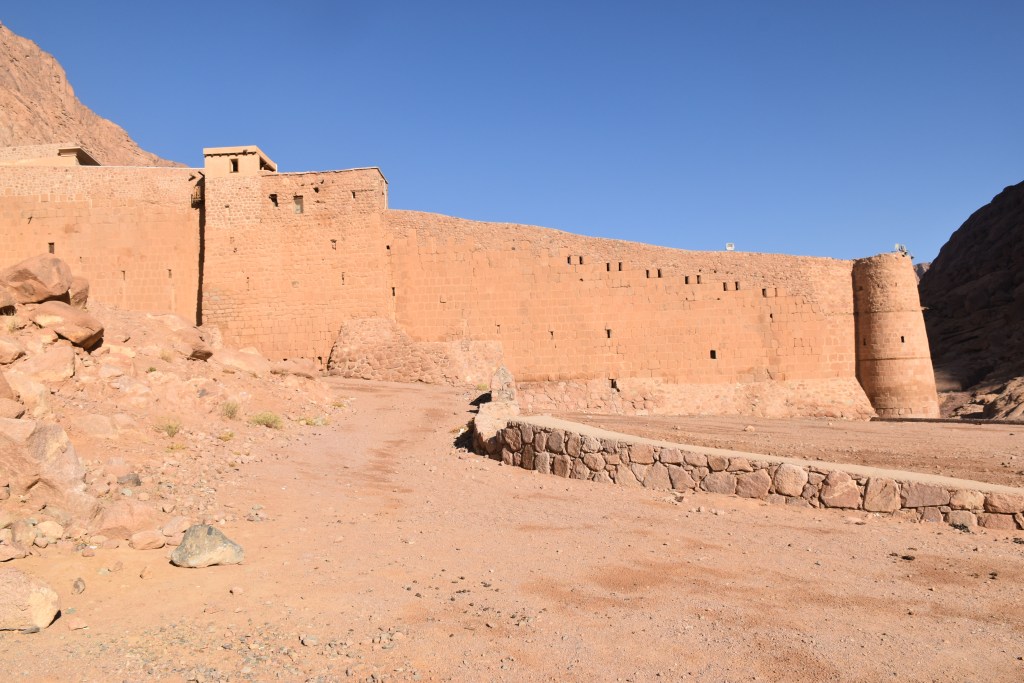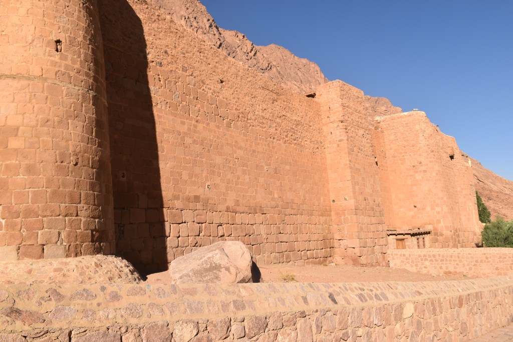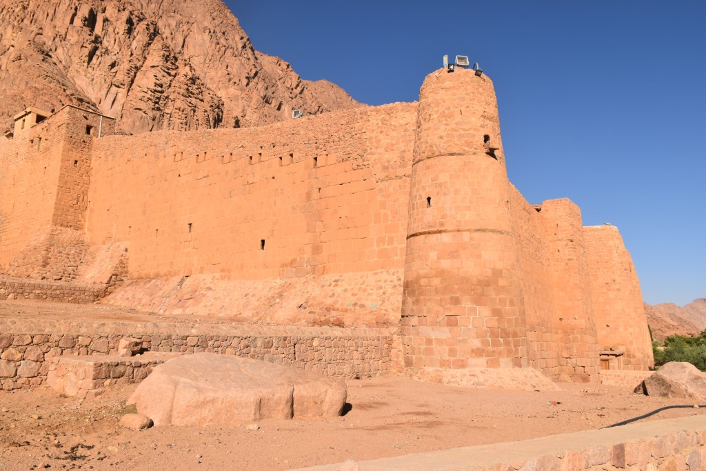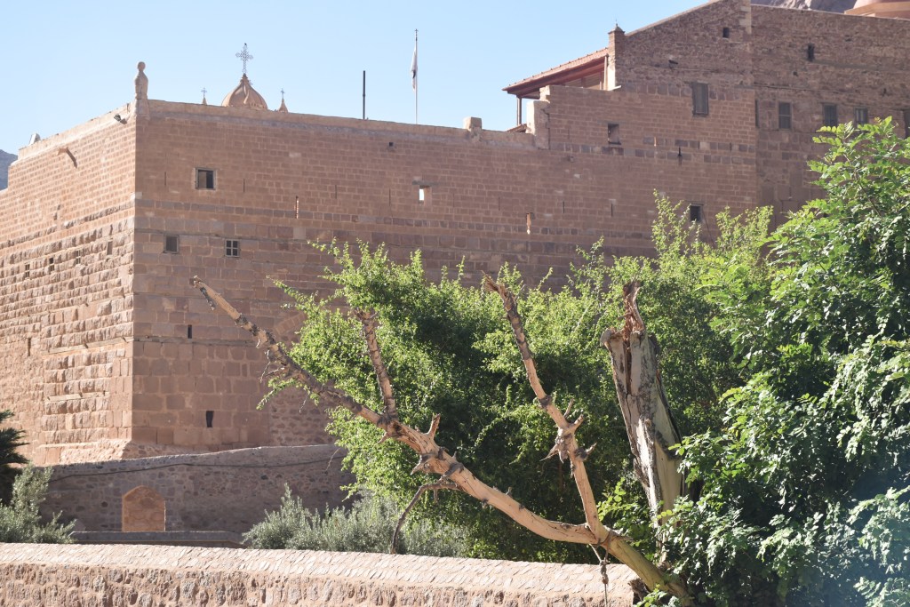 Está declarado Patrimonio de la Humanidad por la UNESCO, se supone que está en el lugar donde Dios se apareció a Moisés por primera vez en forma de zarza ardiendo. Su interior, que no pudimos ver porque el día que subimos al monte el Monasterio cierra al publico conserva una de las bibliotecas más antiguas del mundo con manuscritos anteriores al siglo X. También conserva una colección de iconografía bizantina con piezas que van desde el siglo VI. No pudimos ver tampoco la iglesia de la Transfiguración, dedicada a Moisés y a Elías, profetas que hablaron en este lugar con Dios. Pero si pudimos disfrutar del exterior pegados a sus muros.