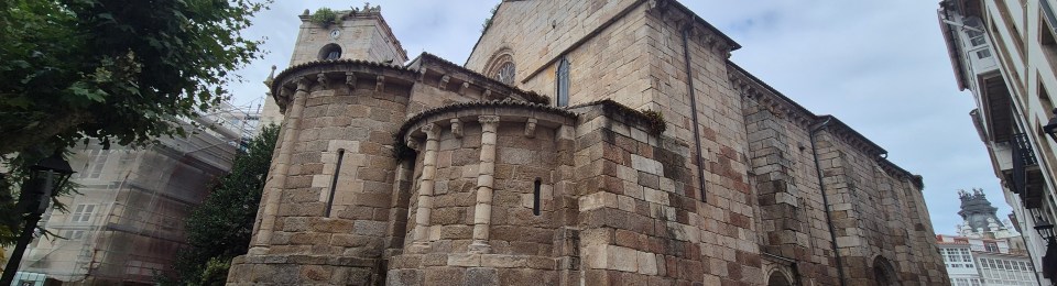 Todas las calles de esta zona ya tienen sus adornos medievales (las calles con los adornos las he puesto en el primer carrusel de fotos de este artículo). Así llegamos al lateral de la Iglesia de Santiago, puede que la más bonita de todas. Es el templo más antiguo conservado de A Coruña y se encuentra, en la plaza de Azcárraga. Su origen se asocia tradicionalmente al siglo X, aunque el edificio actual responde a una reconstrucción románica posterior, impulsada tras la repoblación de la ciudad en 1208 por Alfonso IX. Durante la Baja Edad Media fue el templo más importante de la urbe, sede de reuniones del concejo y punto clave para los peregrinos del Camino Inglés. En 1972 fue declarada Monumento Nacional.