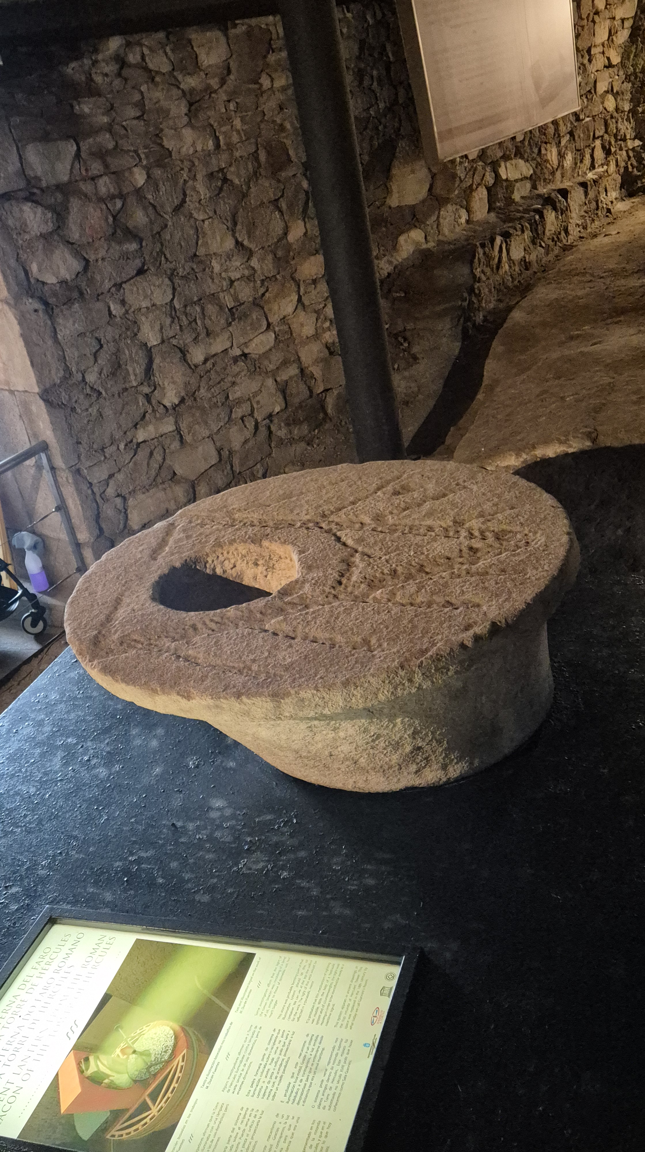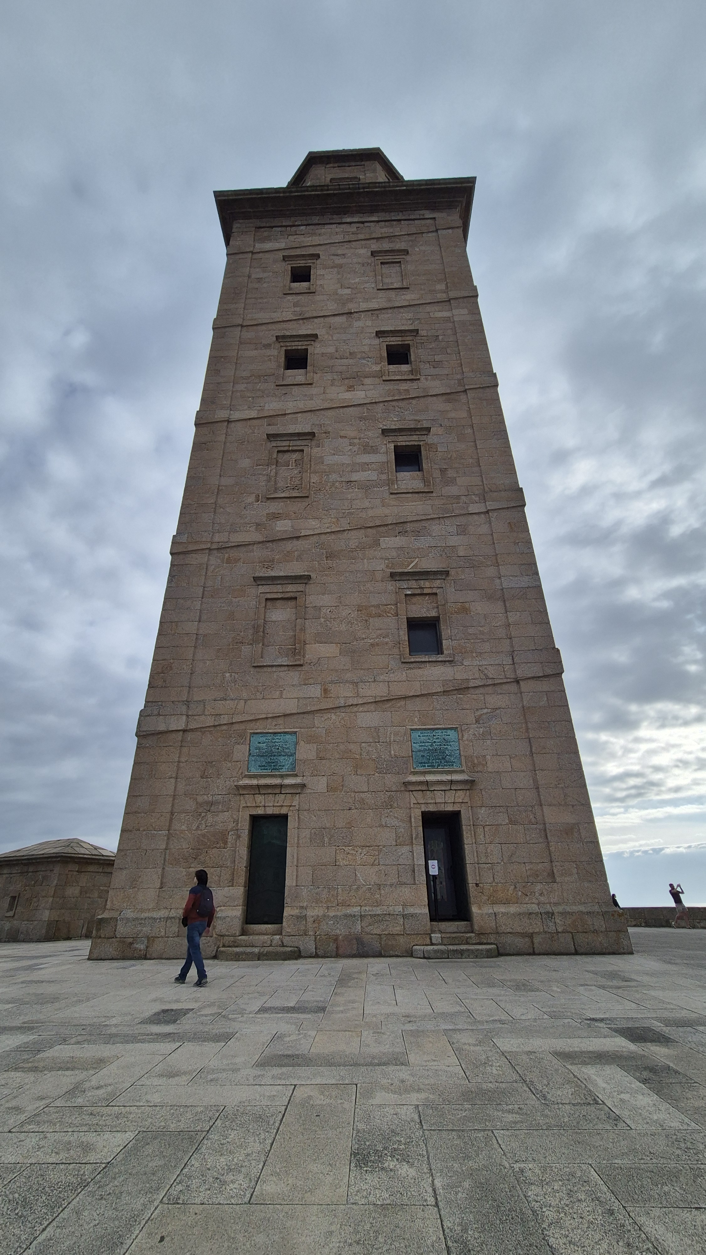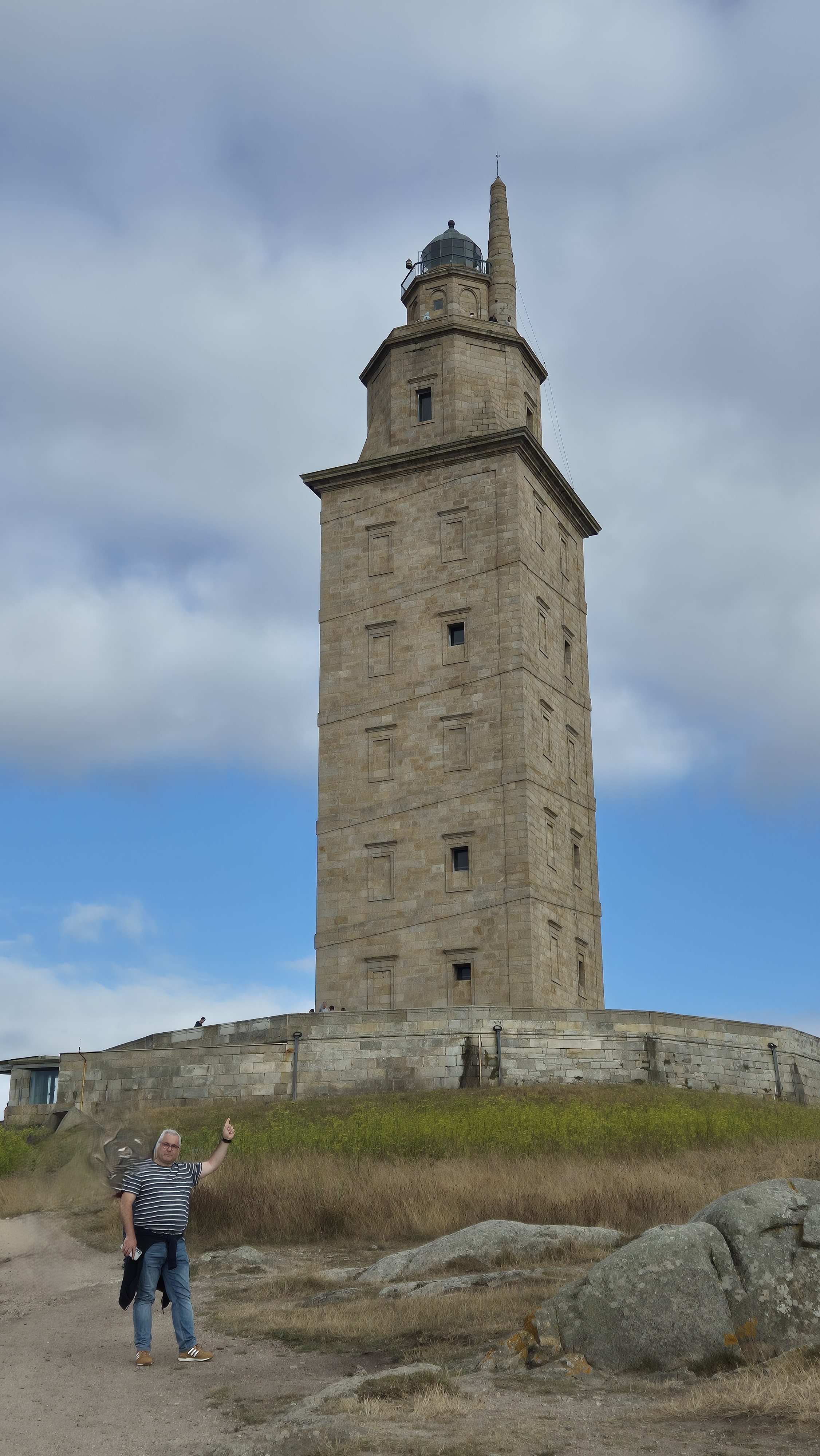 Al entrar, vemos los restos romanos que se conservan y allí el guía nos cuenta la historia y características del faro. Arquitectónicamente, la torre presenta una planta cuadrangular de unos 11,75 metros de lado, con 57 metros de altura. Su rasgo más distintivo es la forma helicoidal que recorre las fachadas exteriores, recuerdo de la rampa ascendente romana que permitía acceder al faro. La estructura actual combina el núcleo romano original con la parte neoclásica del siglo XVIII (exterior), esta reforma añadió 21 metros de altura y reorganizó los accesos interiores. Es un claro ejemplo de continuidad histórica y adaptación arquitectónica, conservado mediante diversas restauraciones a lo largo del tiempo (como lo que solemos ver en las catedrales).