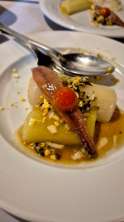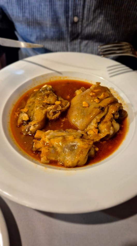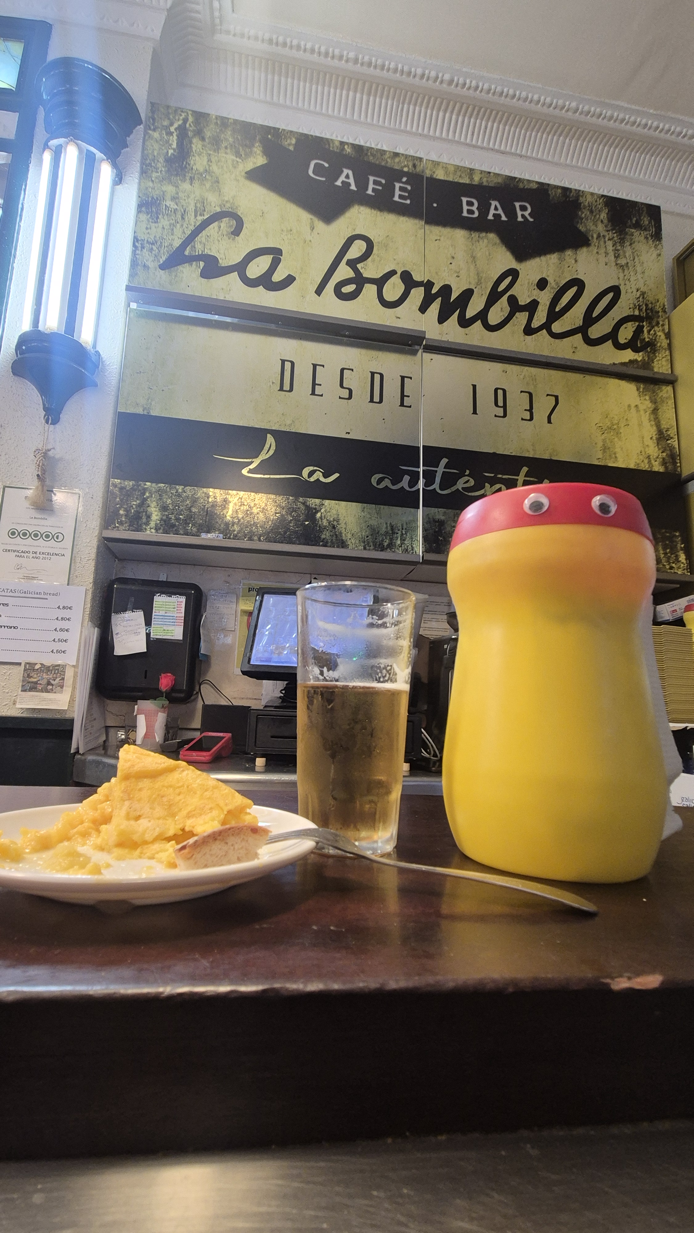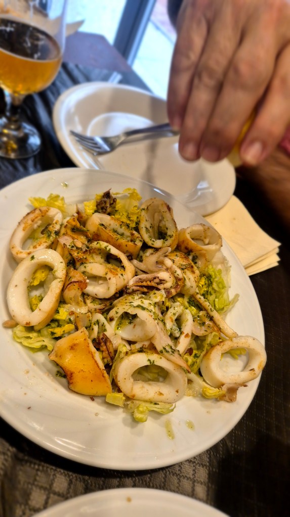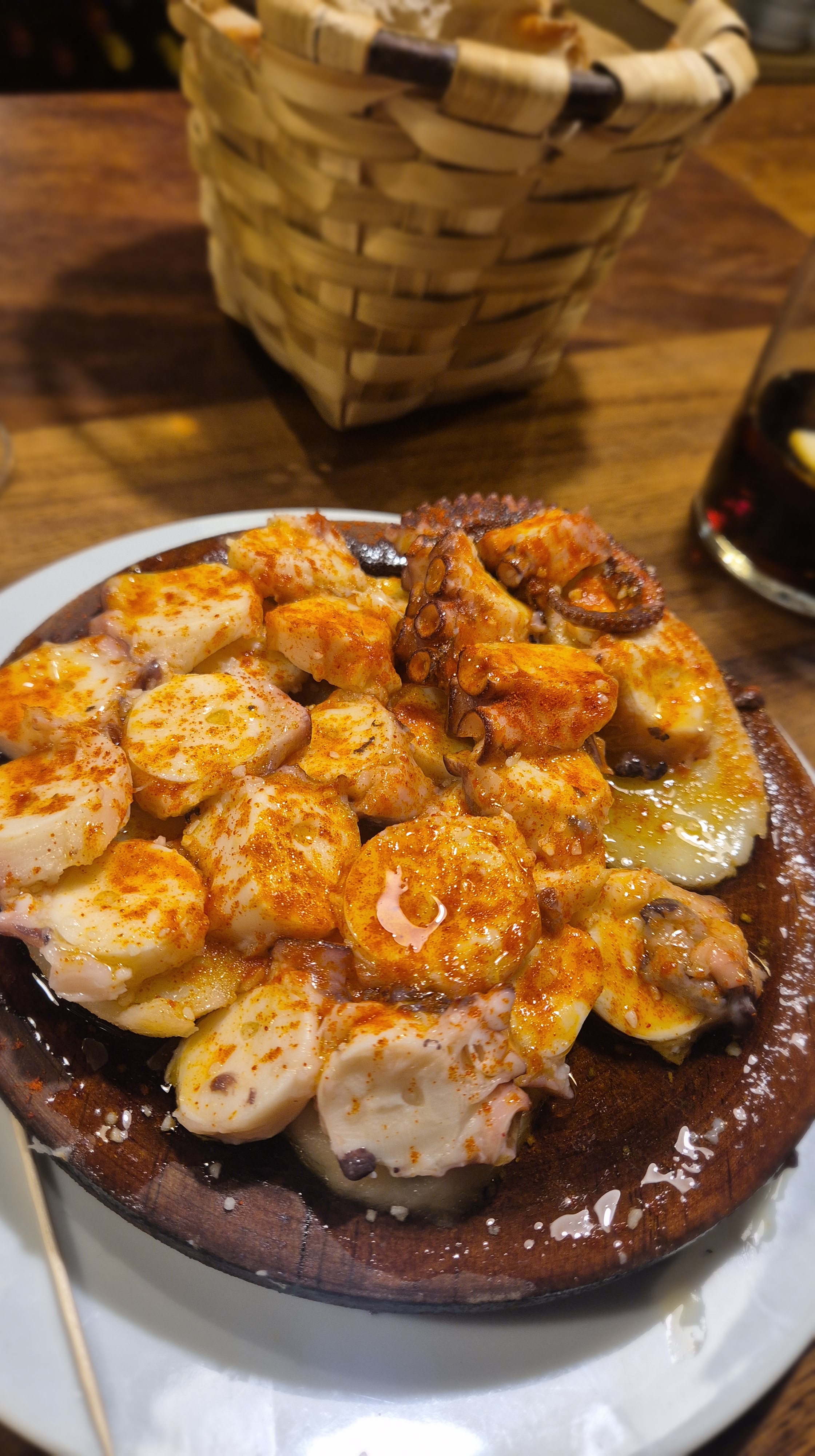 El aperitivo – comida realmente empieza en La Bombilla con su famosa tortilla de patata. Allí mismo nos recomiendan ir (queremos comer pulpo) A Taberna de Cunqueiro. Acertamos de pleno en todos los sentidos, el pulpo ¡perfecto!