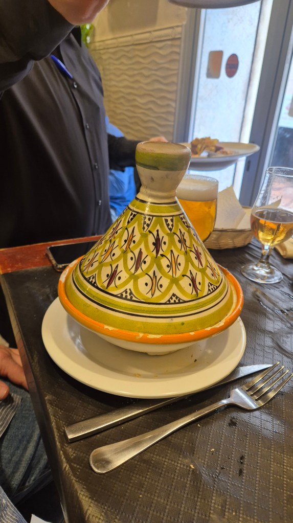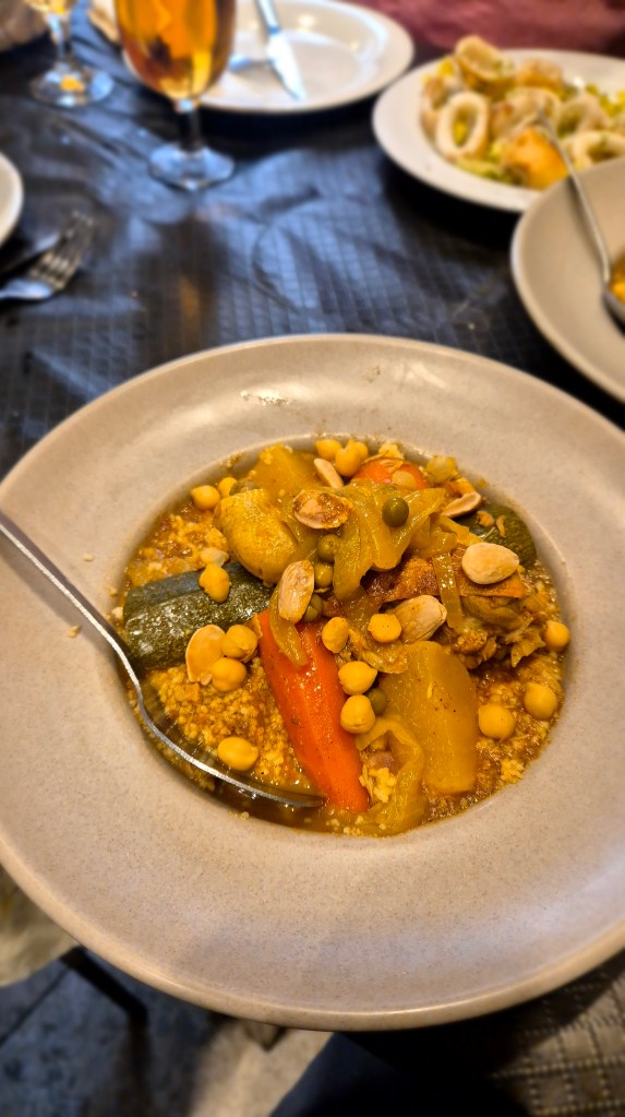 Aperitivo nada más llegar, eso ya pinta bien, unas berenjenas fritas con miel de caña y sus famosos pinchitos (riquísimos). De plato principal uno pidió calamares a la plancha, (yo llevaba pensando desde que llegué a Melilla comer cuscus) por supuesto pedimos cuscus de pollo y tallin de cordero y un rico postre para compartir.