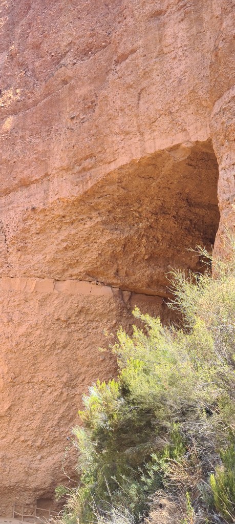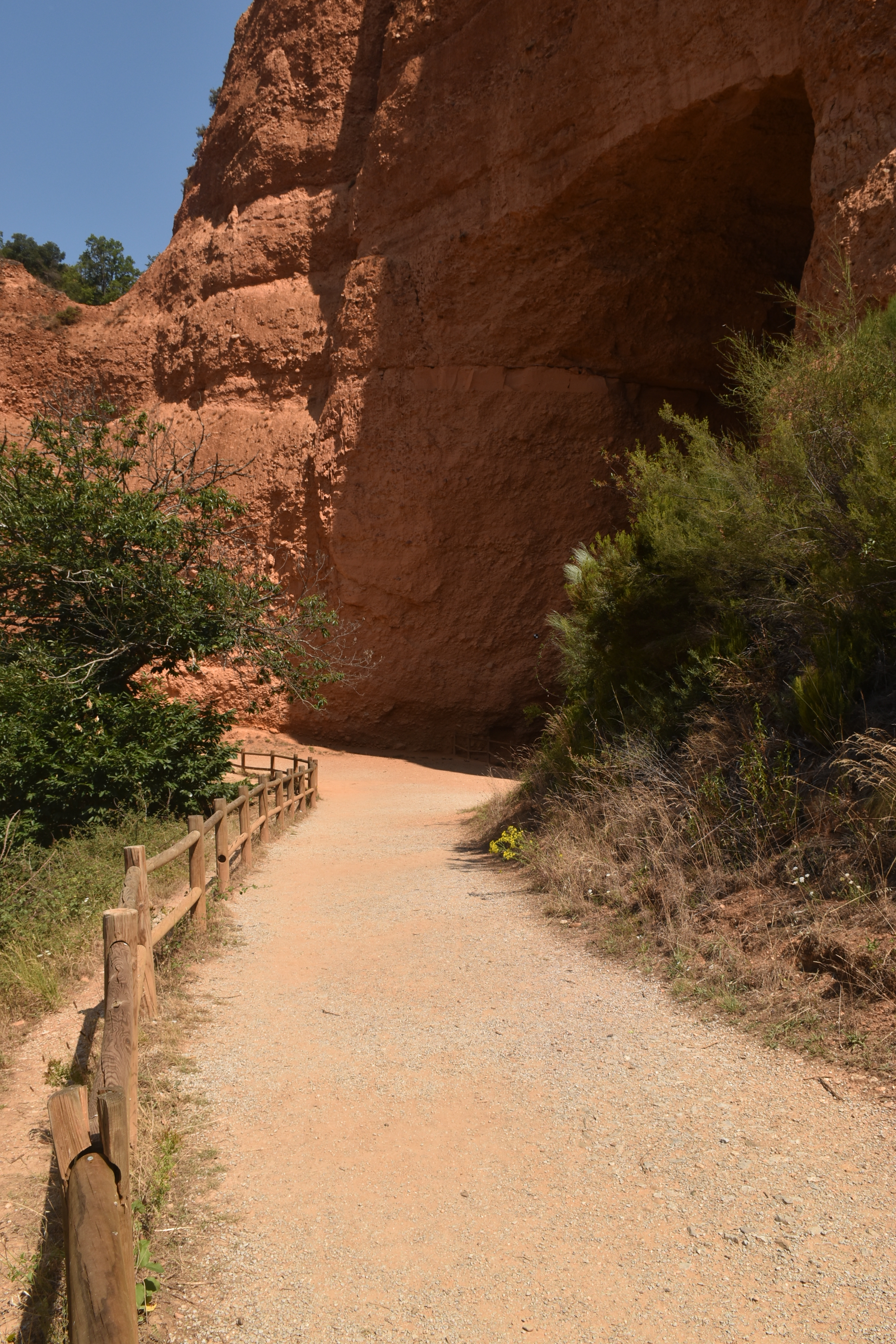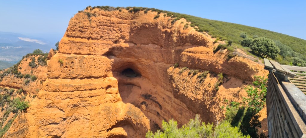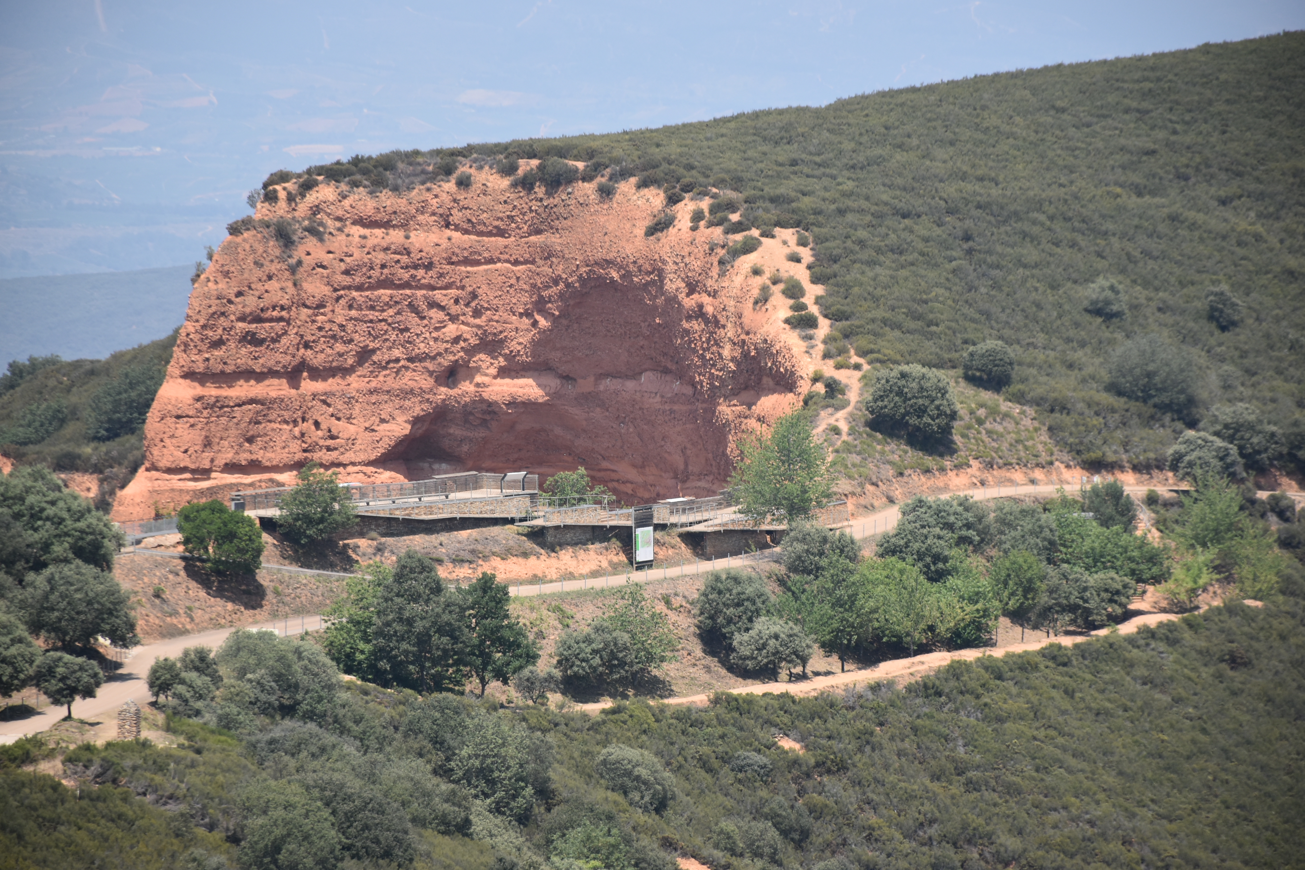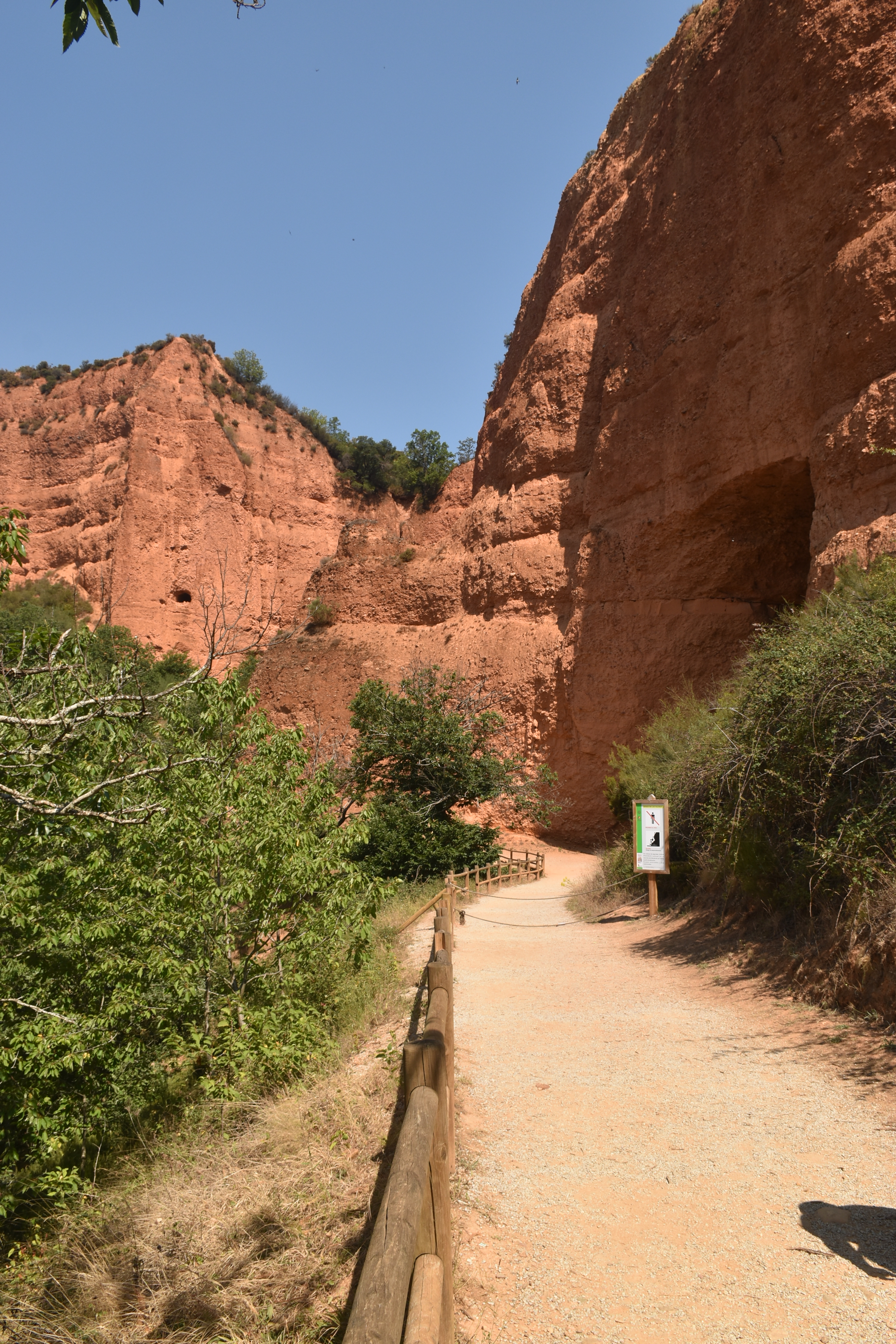 Disfrutando del paisaje evitando los rayos del sol gracias a los árboles, pasamos al lado de una valla de madera en un camino que nos lleva hasta una cueva, La Cuevona se llama y es el resultado del proceso de ruina montium de la explotación aurífera y la erosión después de tantos años (casi 2000).