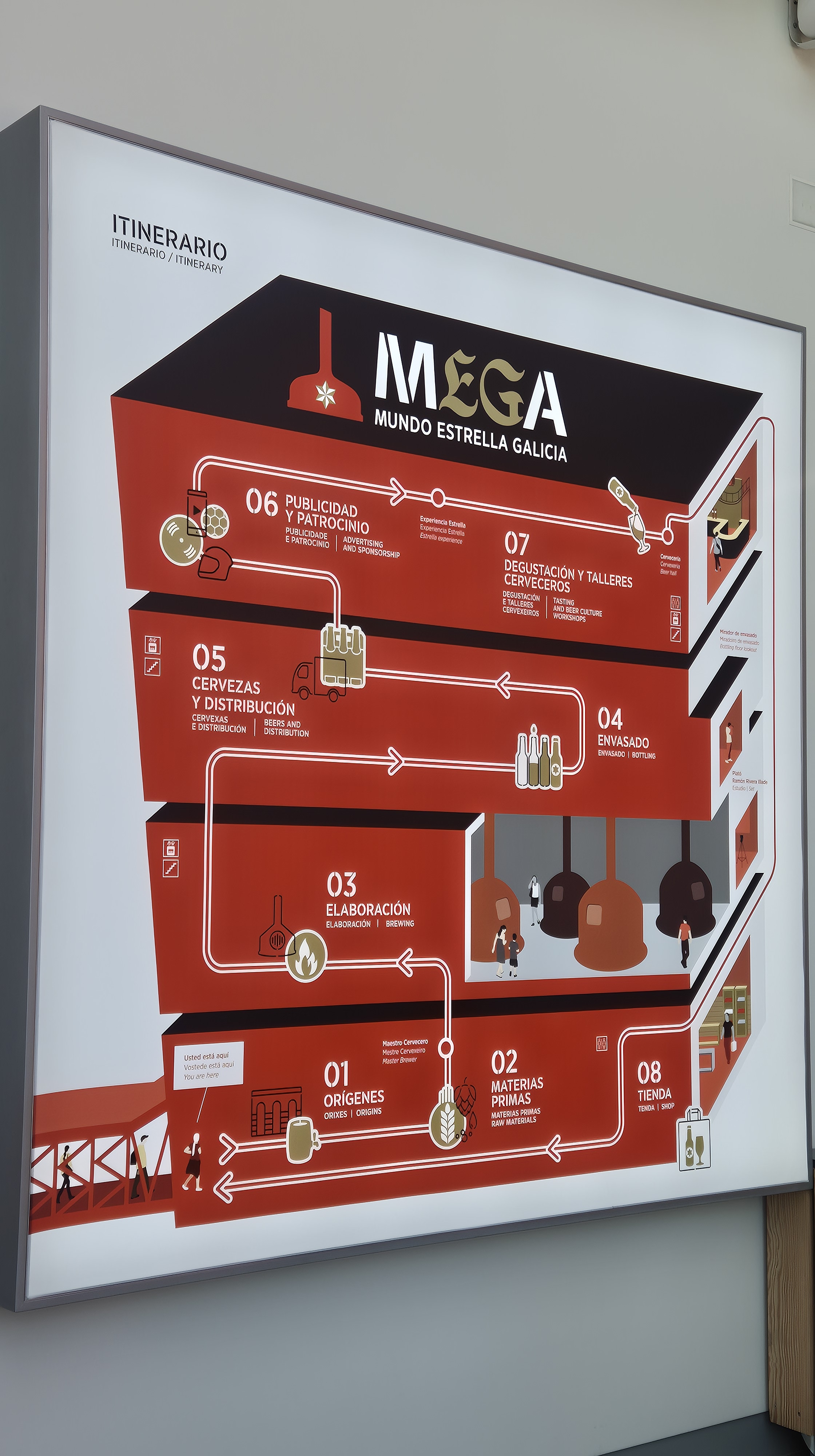 Por la tardes tenemos un GRAN PLAN, ir al Mega Mundo Estrella Galicia. IMPORTANTE: sacar la entrada con tiempo. Nosotros sacamos la Visita guiada con tiraje y maridaje de conservas, 37€ por persona. Puedes llegar en el autobús número 11 o bien andando, nosotros lo hicimos andando y yo con alpargatas, (en fin, mis pies y yo, pero esa es otra historia que se queda en el diario de papel del viaje), es un paseo que se hace perfectamente en poco más de media hora (40 minutos), no te asustes, (en autobús será un trayecto de quince minutos).