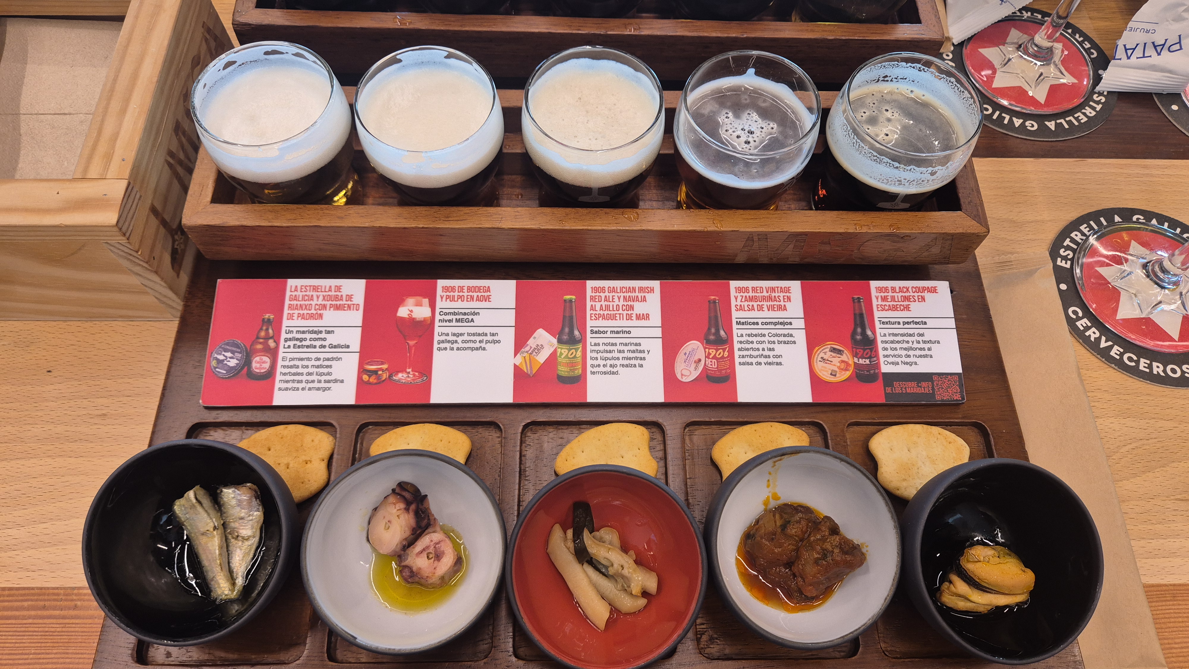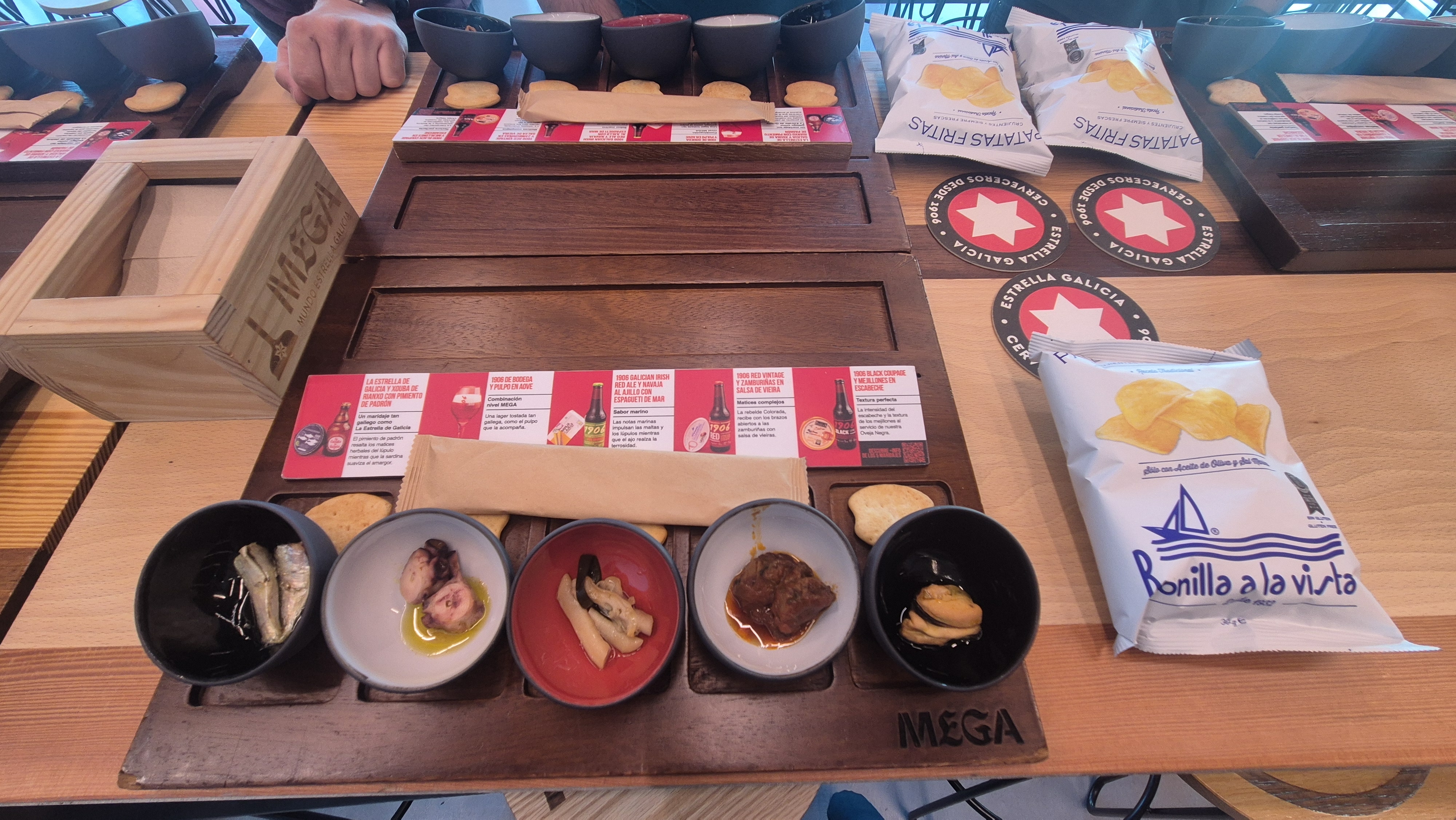 Tengo que decir que el verdadero placer es cuando ya vamos a la cata de verdad. Tenemos preparado una bandeja con los productos que vamos a probar, en nuestro caso conservas. Otras personas habían elegido quesos o embutidos gallegos. Las cervezas nos las pusieron después, cada una para que maridara a la perfección con la conserva.