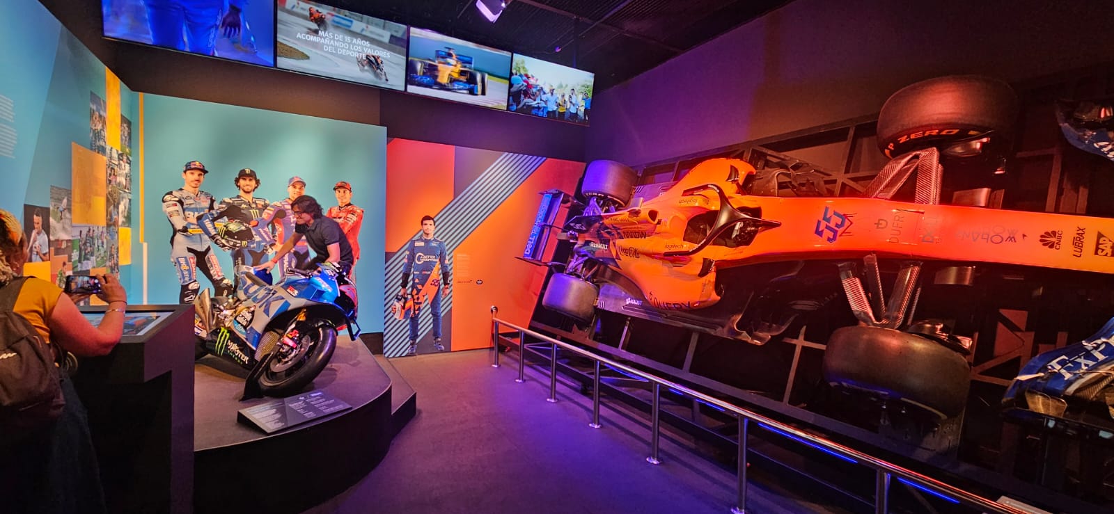 Después de ver la parte de las cervezas que tienen, cómo han ido evolucionando, diferentes etiquetas, productos y publicidad de la marca, llegamos la parte interactiva de la visita, tienen un coche de Formula 1, una moto de Moto GP, con imágenes de pilotos españoles y podemos subirnos en la moto y hacernos fotos.