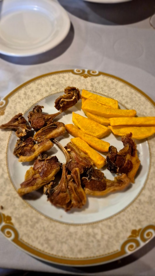 Empezamos a bajar para volver a recorrer el camino andado, las piedras, la N-1 y llegar al Puerto, donde hay dos bares y ver si podemos comer, son las 3 muy pasadas. Nos decantamos por el que es hotel y no está nada mal. Hotel Puerto de Somosierra. Entrecot y chuletillas con patatas fritas que están de muerte (igual que los pimientos).
