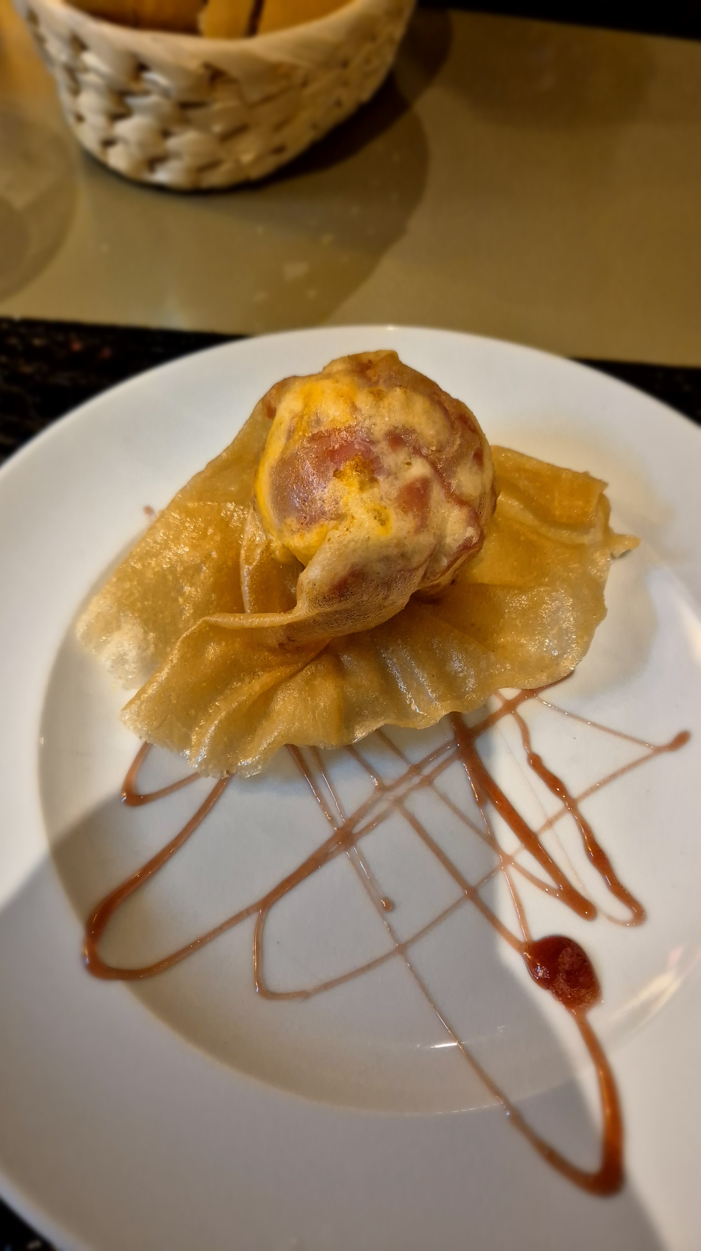 Los mismos pasos que el anterior y a disfrutar, ¡este vino está buenísimo! Justo en este momento llegan los pinchos de el bar El Molino, el de oreja debe ser su especialidad y con un poco de reparo lo pruebo, ¡me encanta! El otro más normal, de gulas, se ha quedado un poco frío, pero también está buenísimo. Sacan también un dulce, que aunque no estaba previsto en la cata, nos da por concluida la cata-comida.