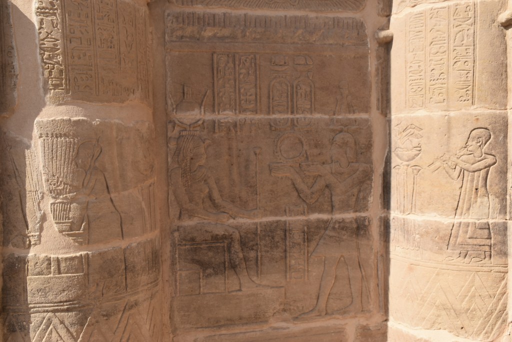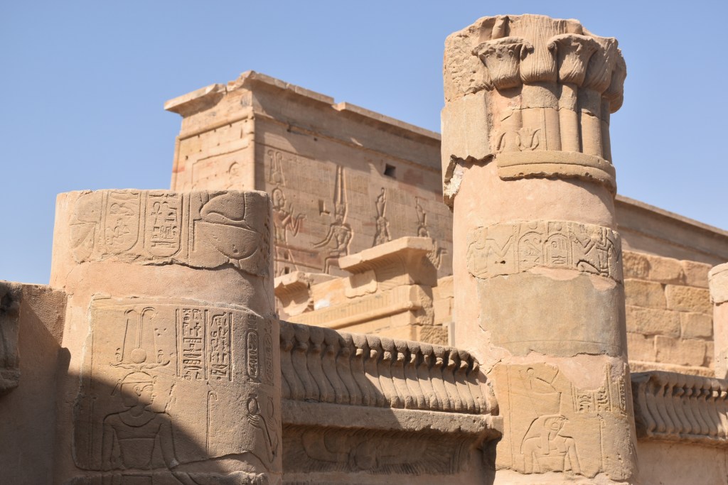 El protagonista indiscutible es el Templo de Isis. Entrada monumental, flanqueada por dos pilonos decorados con relieves de faraones sometiendo enemigos, se puede ver la marca del agua del tiempo que estuvo sumergido. Da paso a una sala hipóstila con columnas. En el interior, el santuario conserva relieves dedicados a Isis y Osiris, transmitiendo aún la devoción de aquellos que los hicieron.