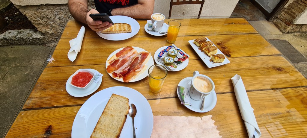 No podemos desayunar hasta las 7:30 horas, café, tostadas de pan con mantequilla y mermelada y Pablo huevo frito y antes de darnos cuenta ya vienen a recoger nuestras maletas, (una de las ventajas de la agencia es que te recogen las maletas, todos los años lo hacemos así). Comienza nuestro primer día de Camino.