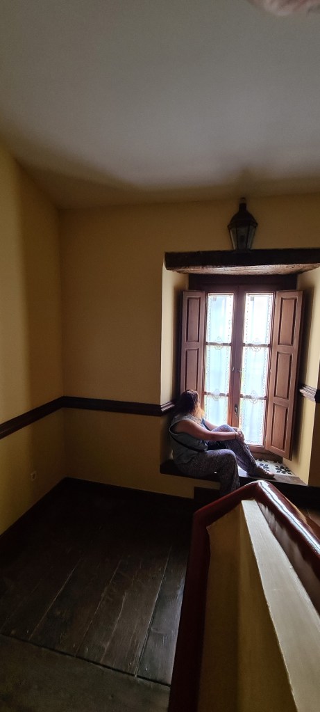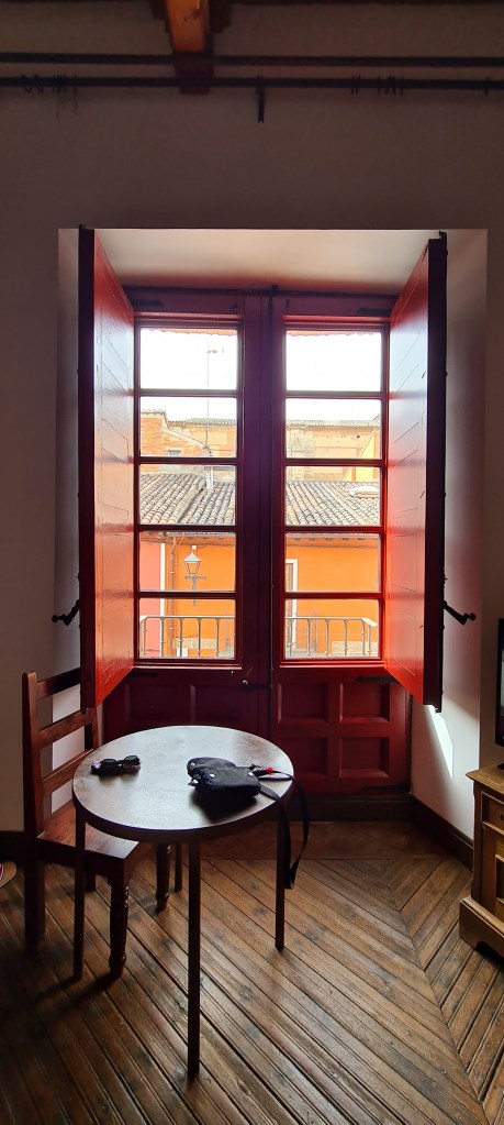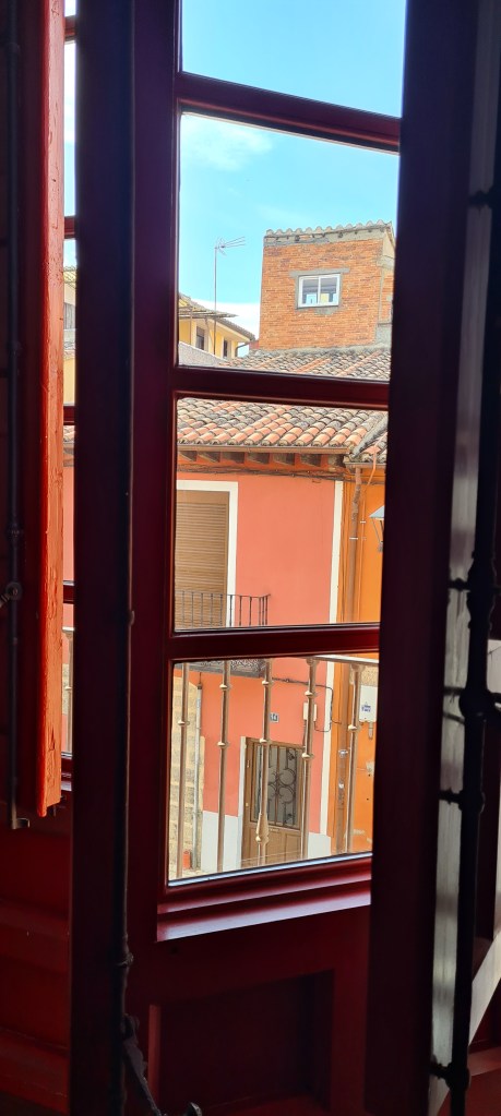 Este alojamiento nos ha gustado mucho, un lugar lleno de detalles y una atención estupenda. (Nos pusieron un ventilador porque dicen que allí nunca jamás hace ese calor y nadie tiene aire acondicionado, y casi nos pide disculpas por ello). En la primera planta estaba nuestra habitación y un salón por si quieres utilizarlo, igual que una terraza con vistas a la torre de la iglesia de Santa María. Ideal para poner un poco al día mi diario.