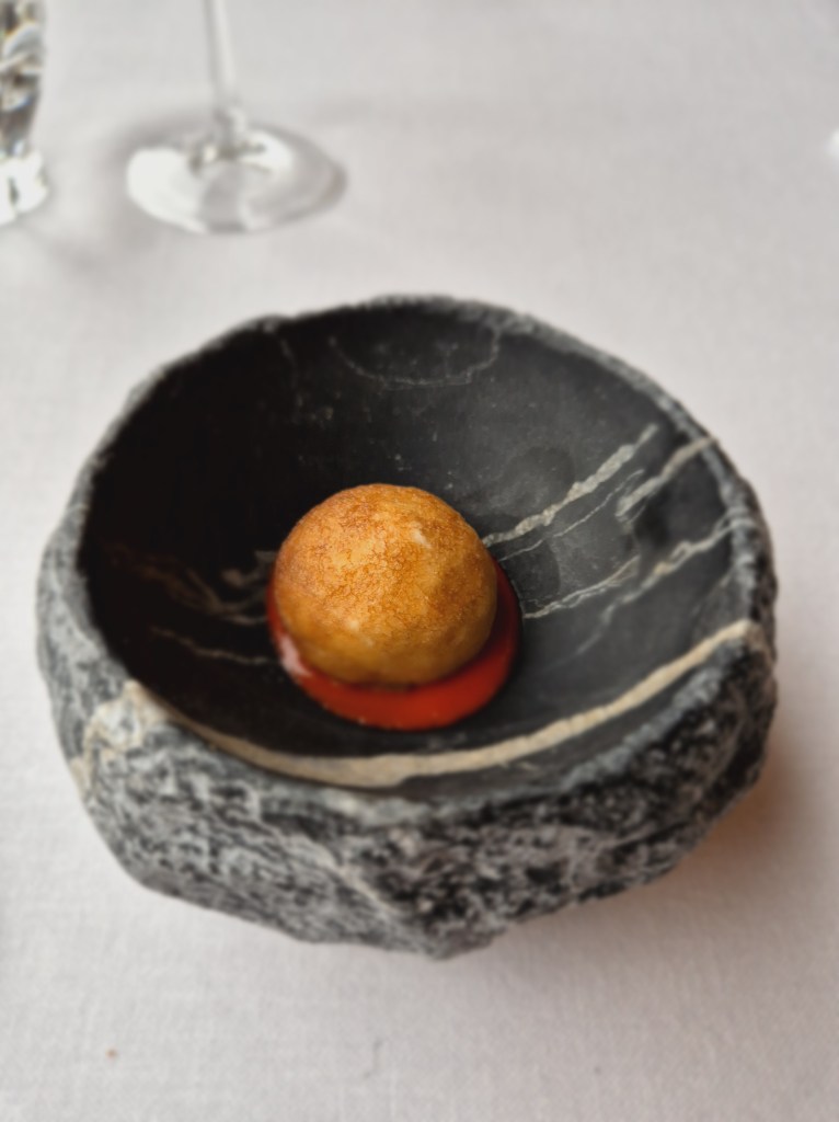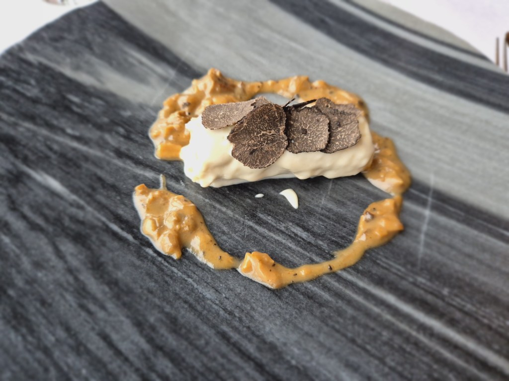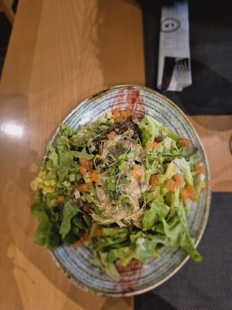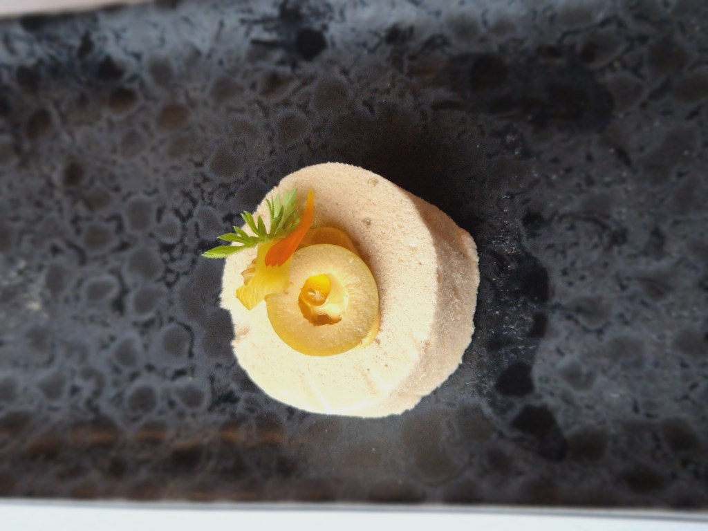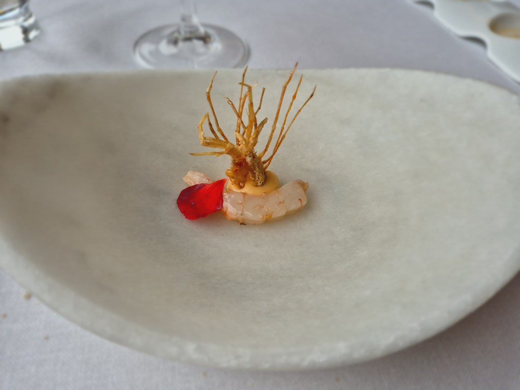 Terminada la visita y cata, tenemos reserva allí también en el restaurante Cepa 21. En la misma línea de la bodega, vanguardista con grandes ventanales. Dirigido por el chef Alberto Soto. Menú Cepa 21 para cuatro. El menú tiene 11 pases, el vino aparte.