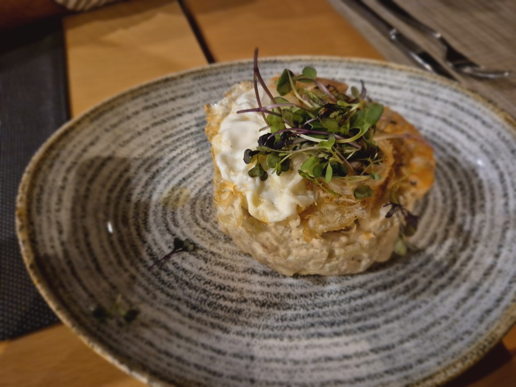El restaurante tenía un toque vanguardista: cominos huevos rotos con jamón en un saquito que era hojaldre o masa quebrada, ¡buenísimo!. El postre de frutos rojos, delicioso. El desayuno no estuvo mal.